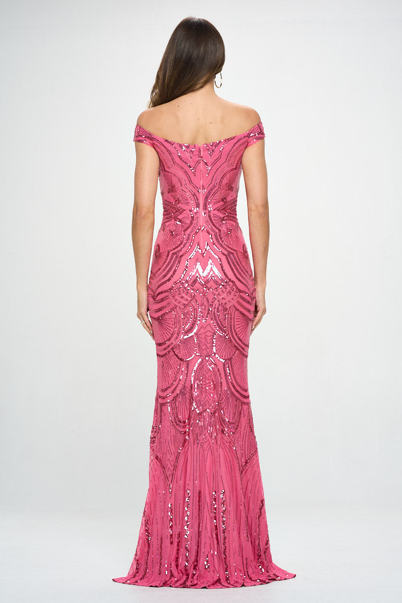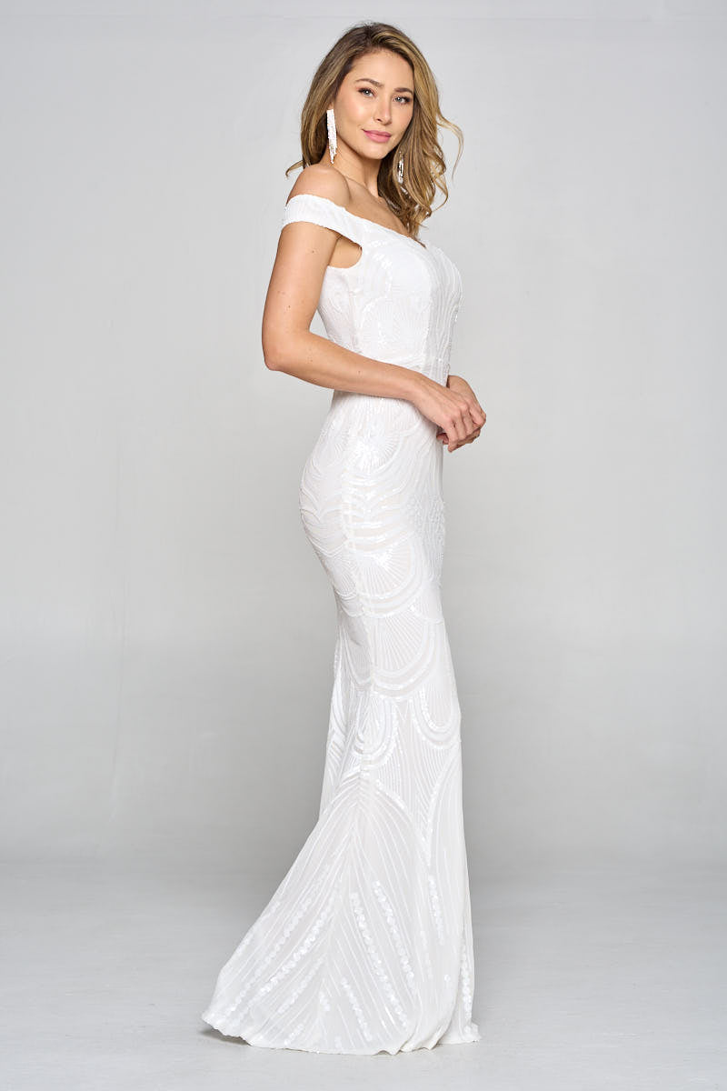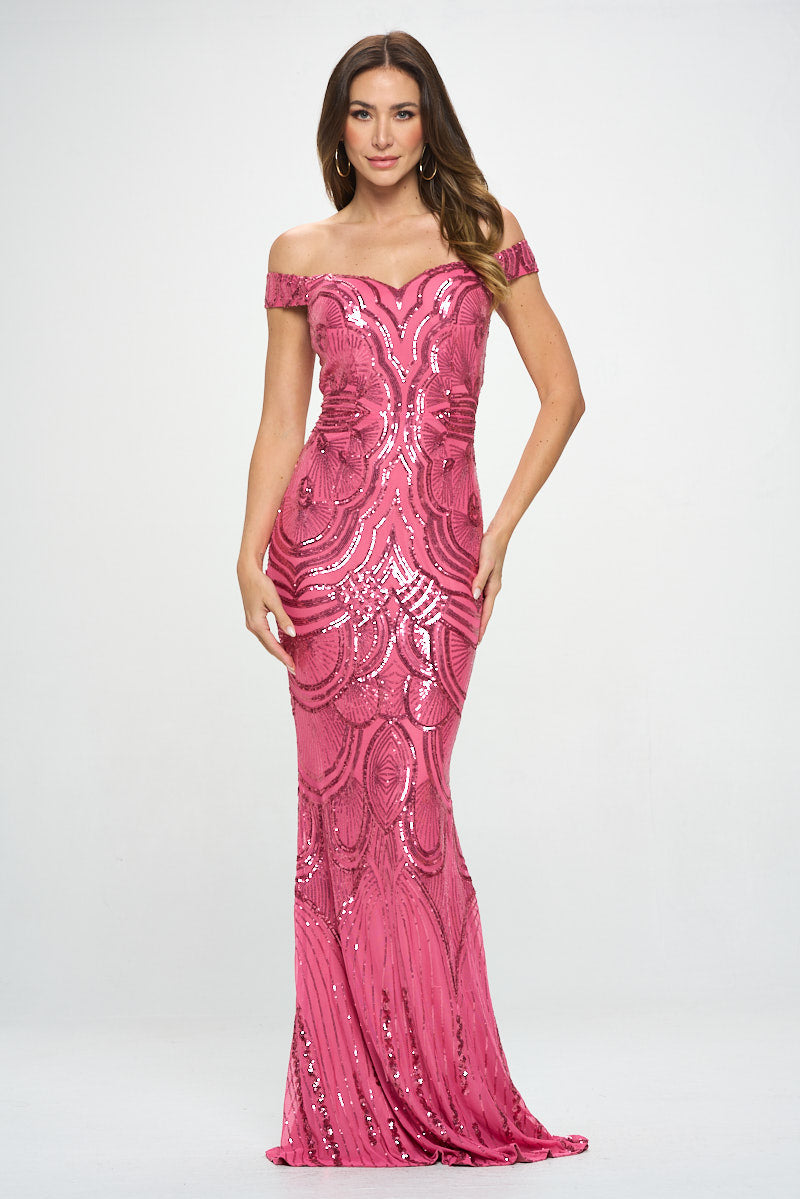 Off the shoulder sequin evening gown in a fit and flare style with sweetheart neckline, back zipper, and mermaid silhouette. Dress is fully lined and has some stretch. Also available in PLUS SIZE.