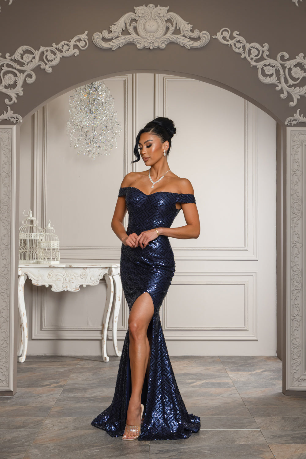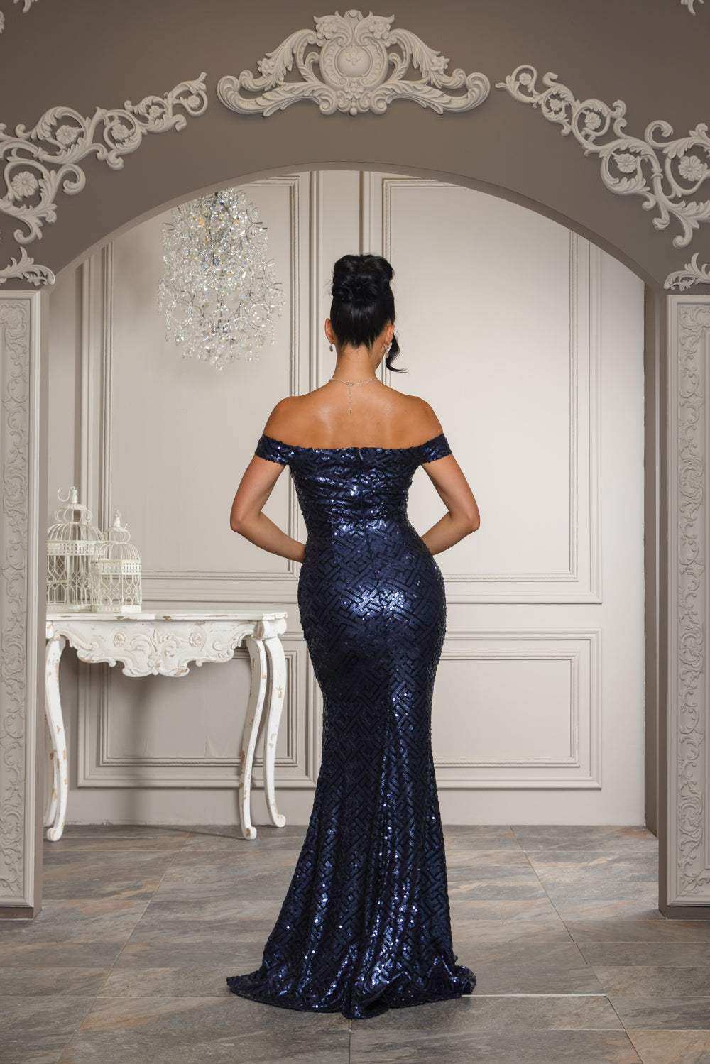 Copper color sequin off shoulder maxi dress with full lining, bra cups, slit, and back zipper. Dress has little stretch.