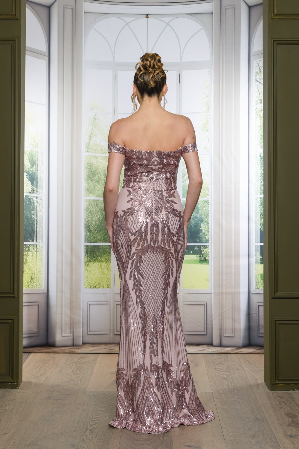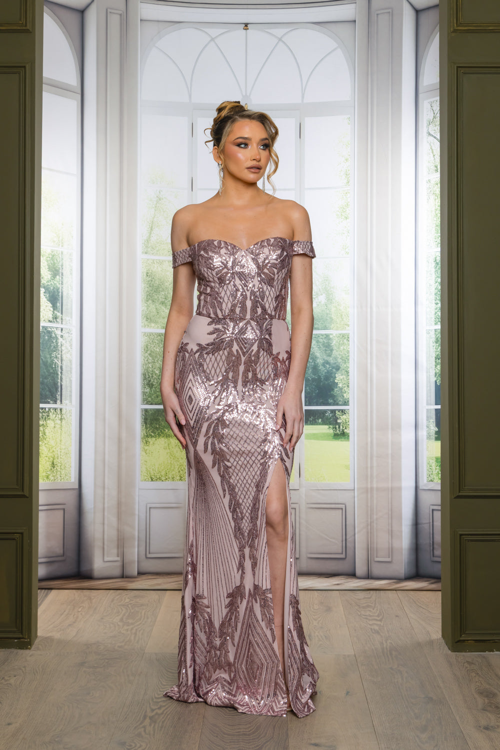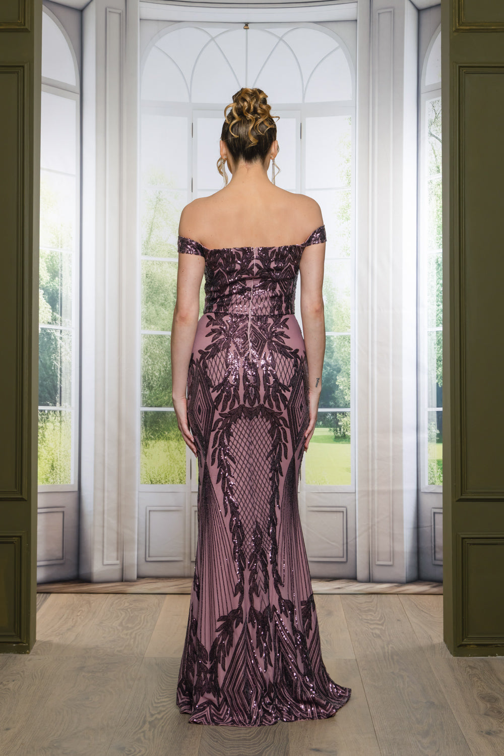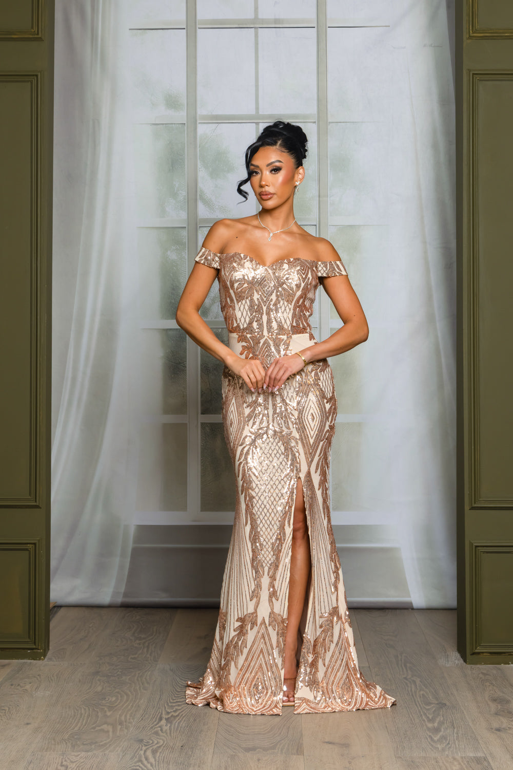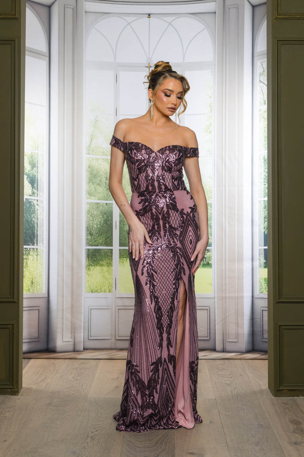 Patterned sequin off shoulder maxi dress with full lining, bra cups, slit, and back zipper. Dress does have stretch.