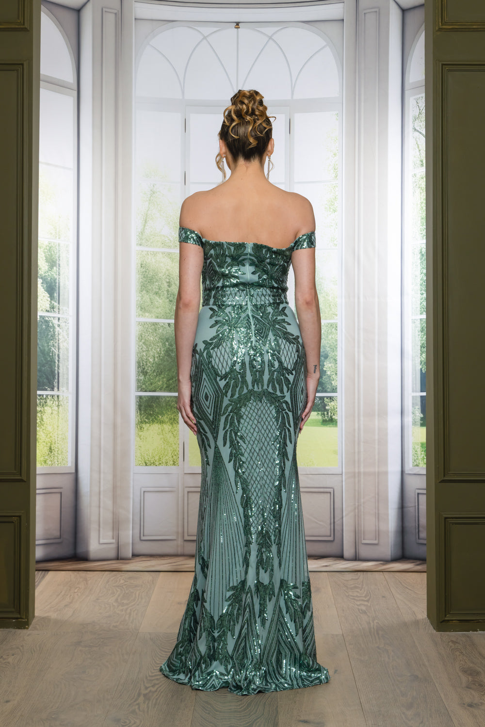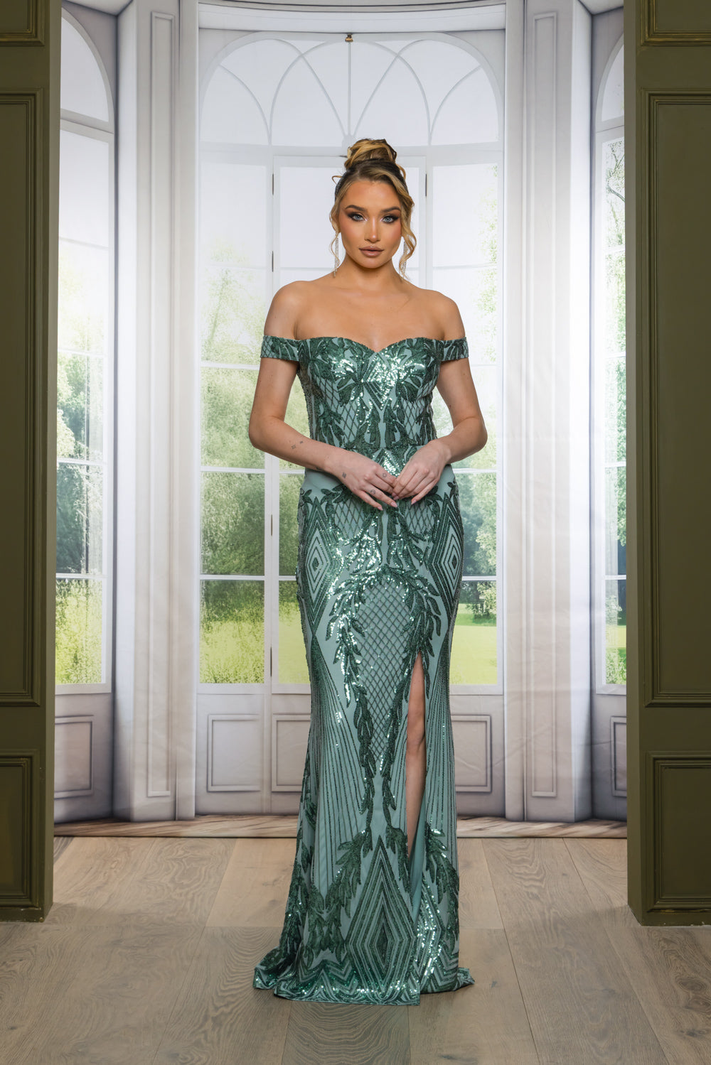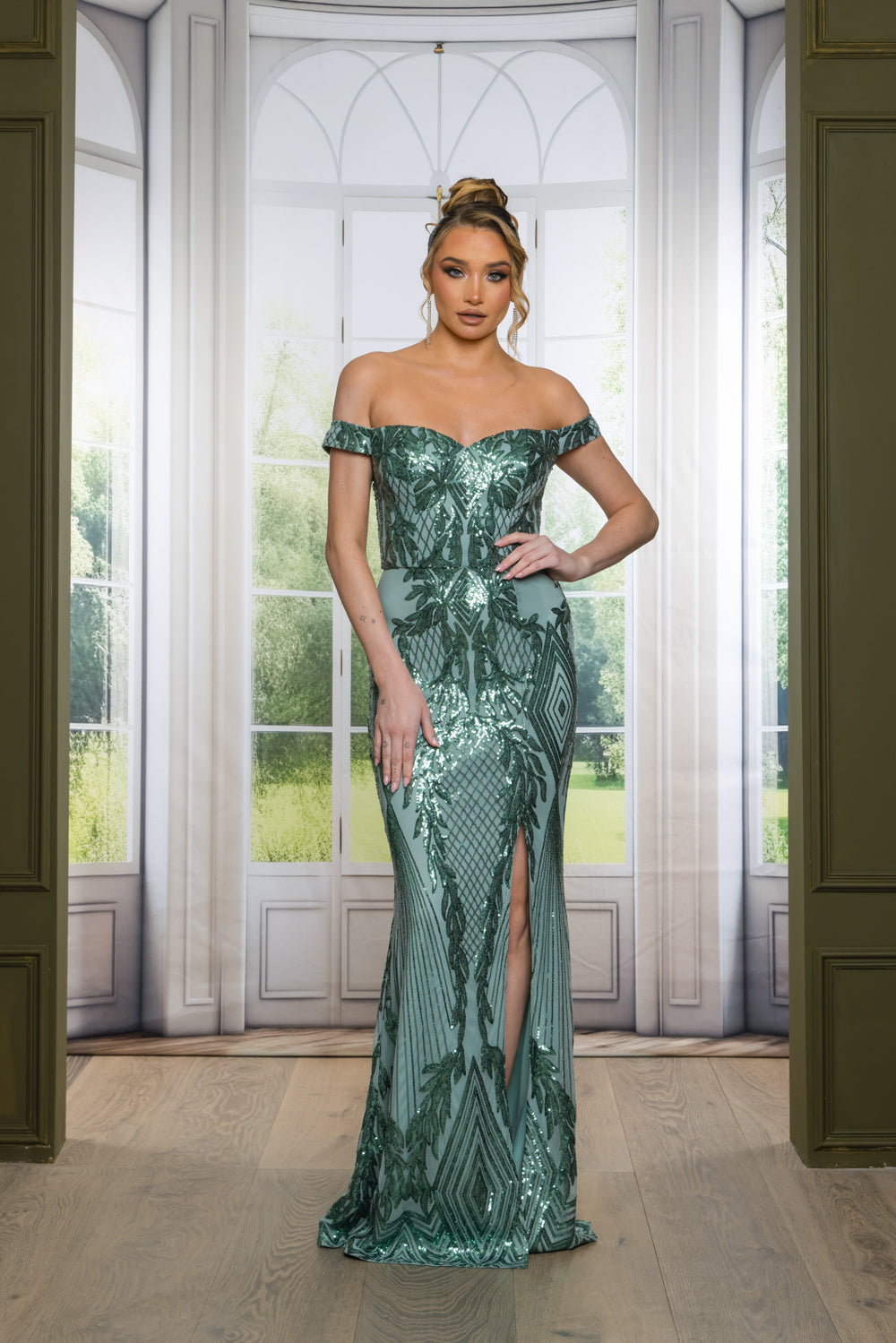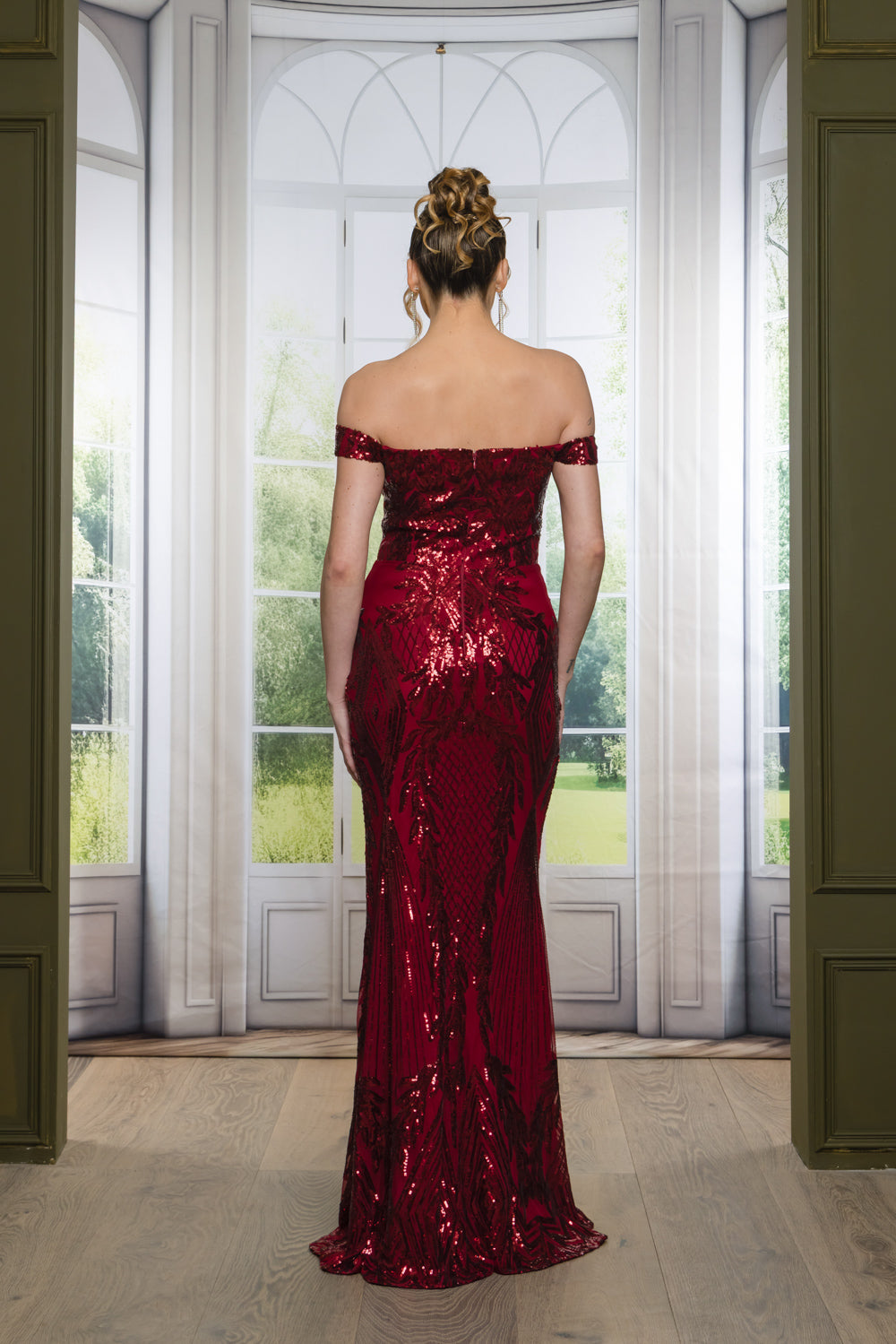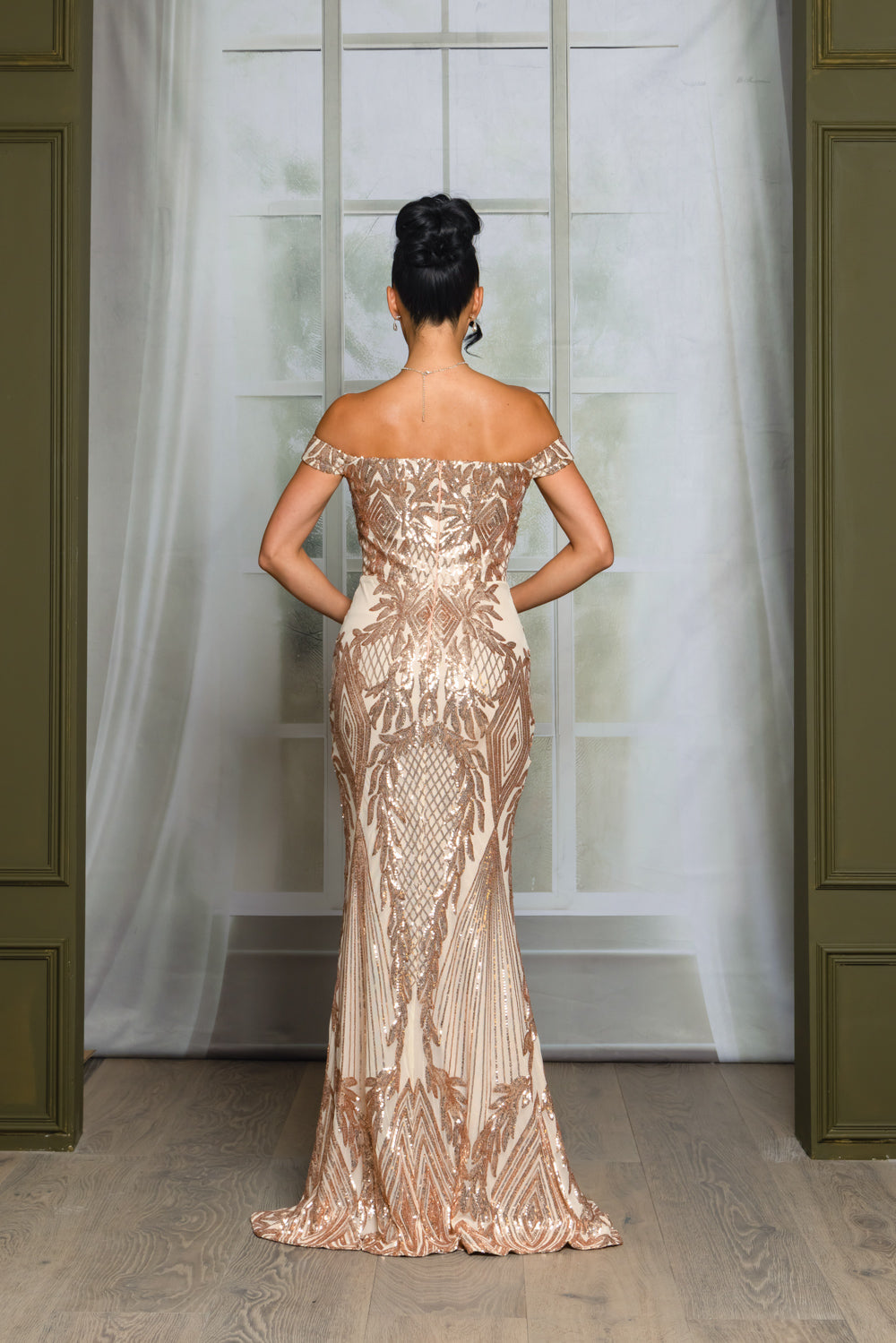 Patterned sequin off shoulder maxi dress with full lining, bra cups, slit, and back zipper. Dress does have stretch.