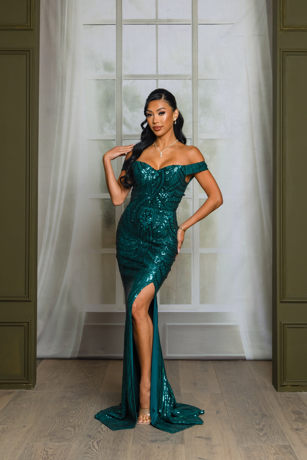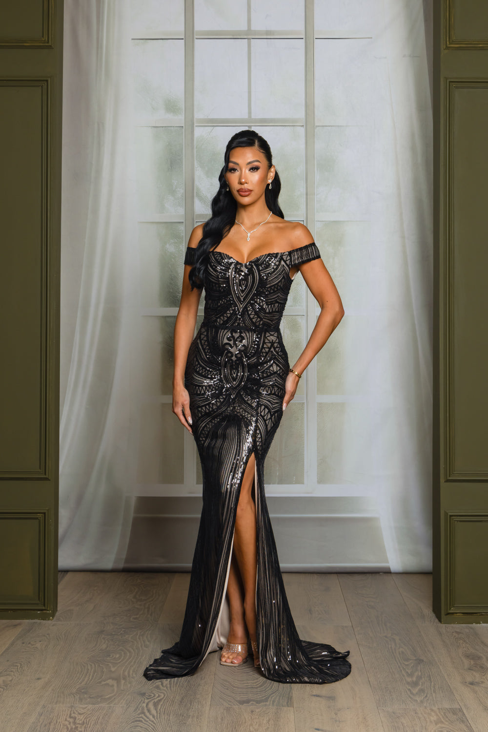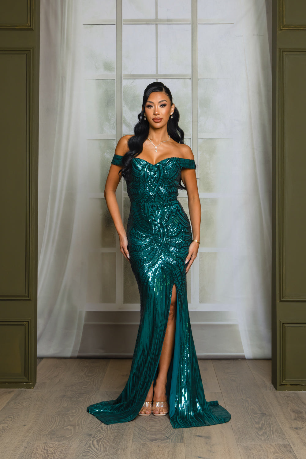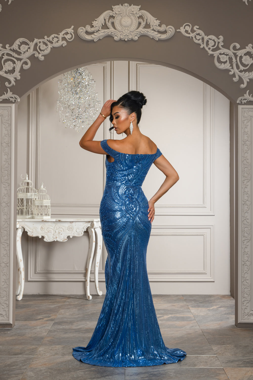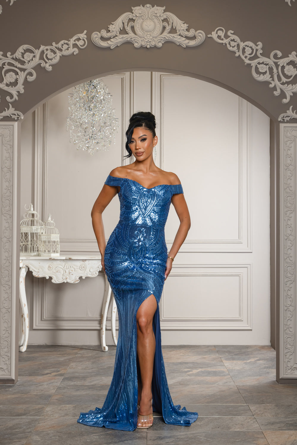Off-the-shoulder mermaid maxi dress with a slit in patterned sequins. Fully lined on top & skirt. Bra cups added. Invisible zipper at center. The fabric has good stretch.