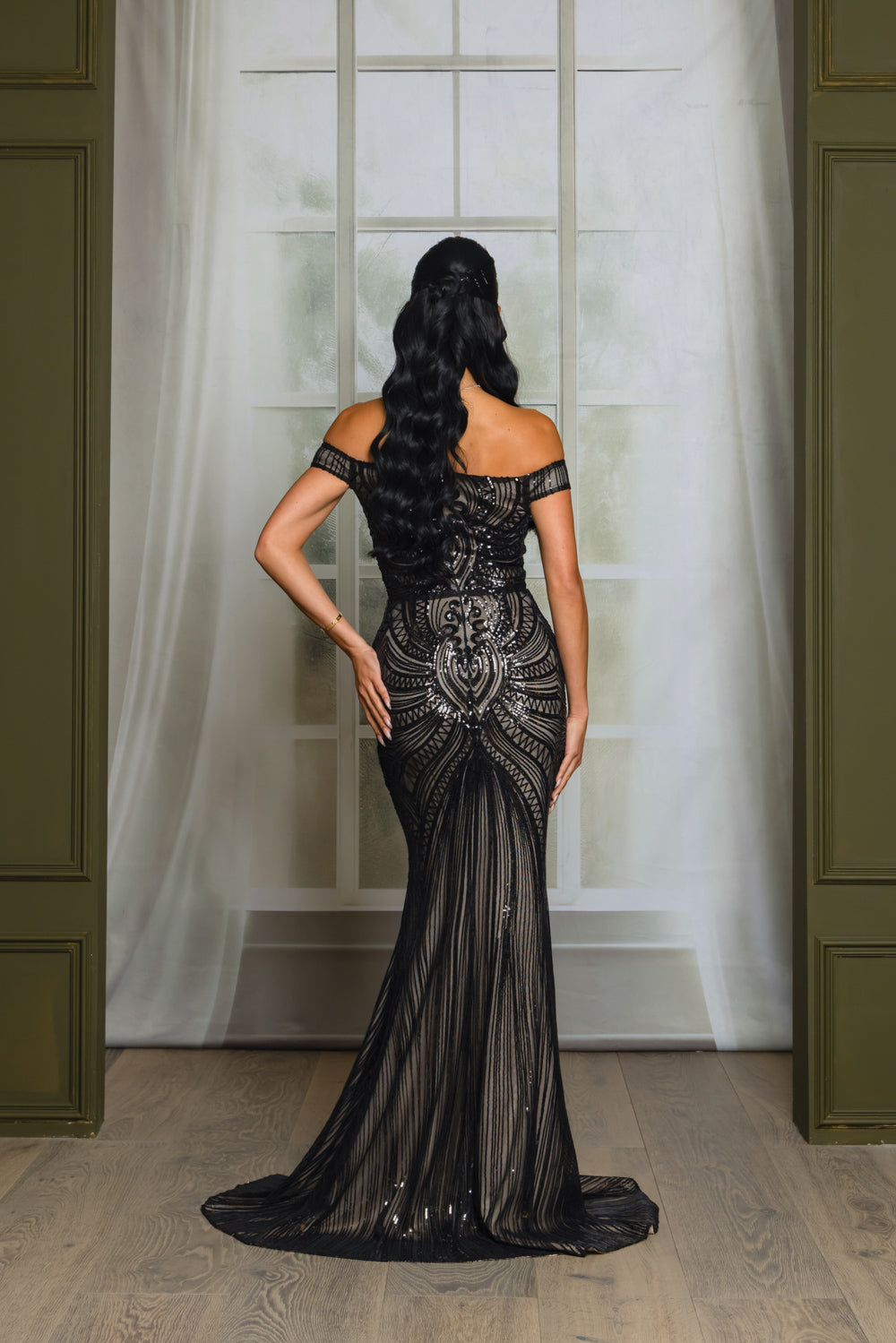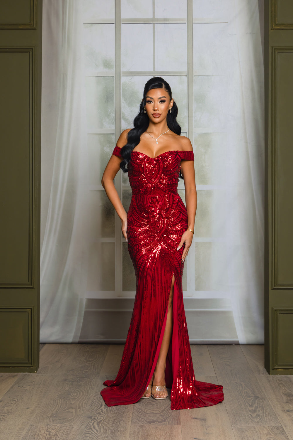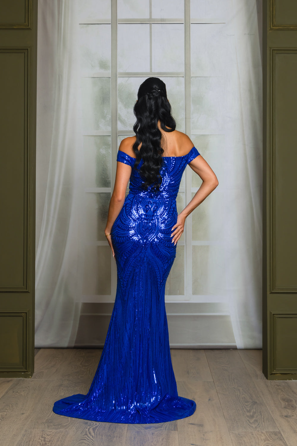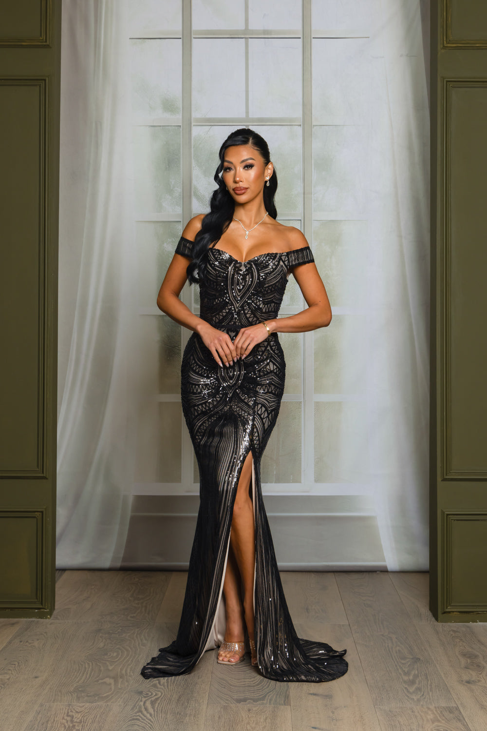 Off-the-shoulder mermaid maxi dress with a slit in patterned sequins. Fully lined on top & skirt. Bra cups added. Invisible zipper at center. The fabric has good stretch.