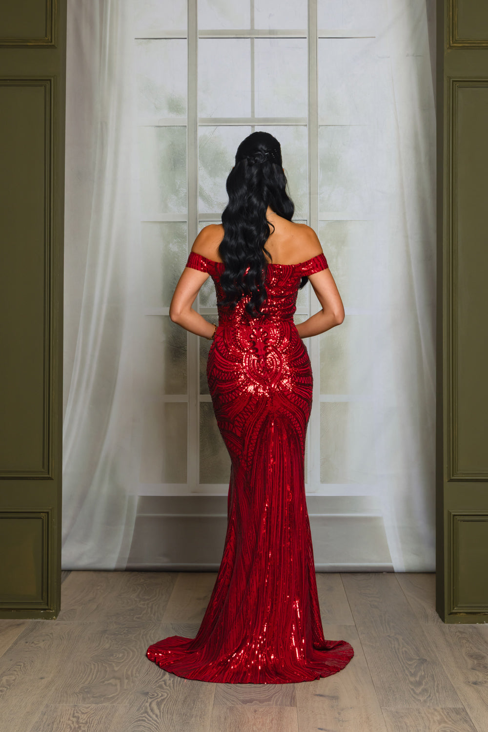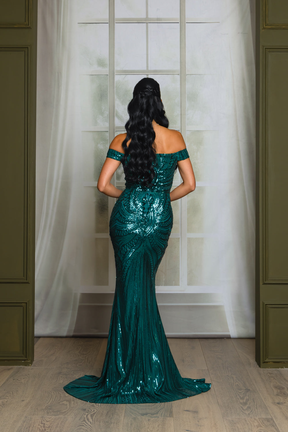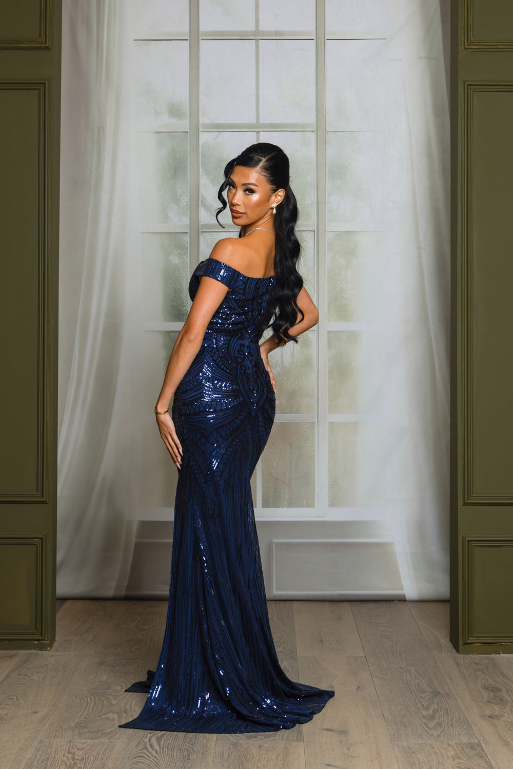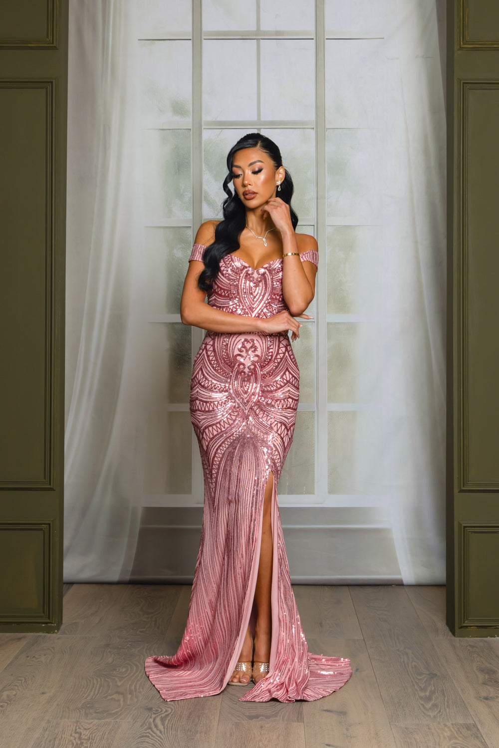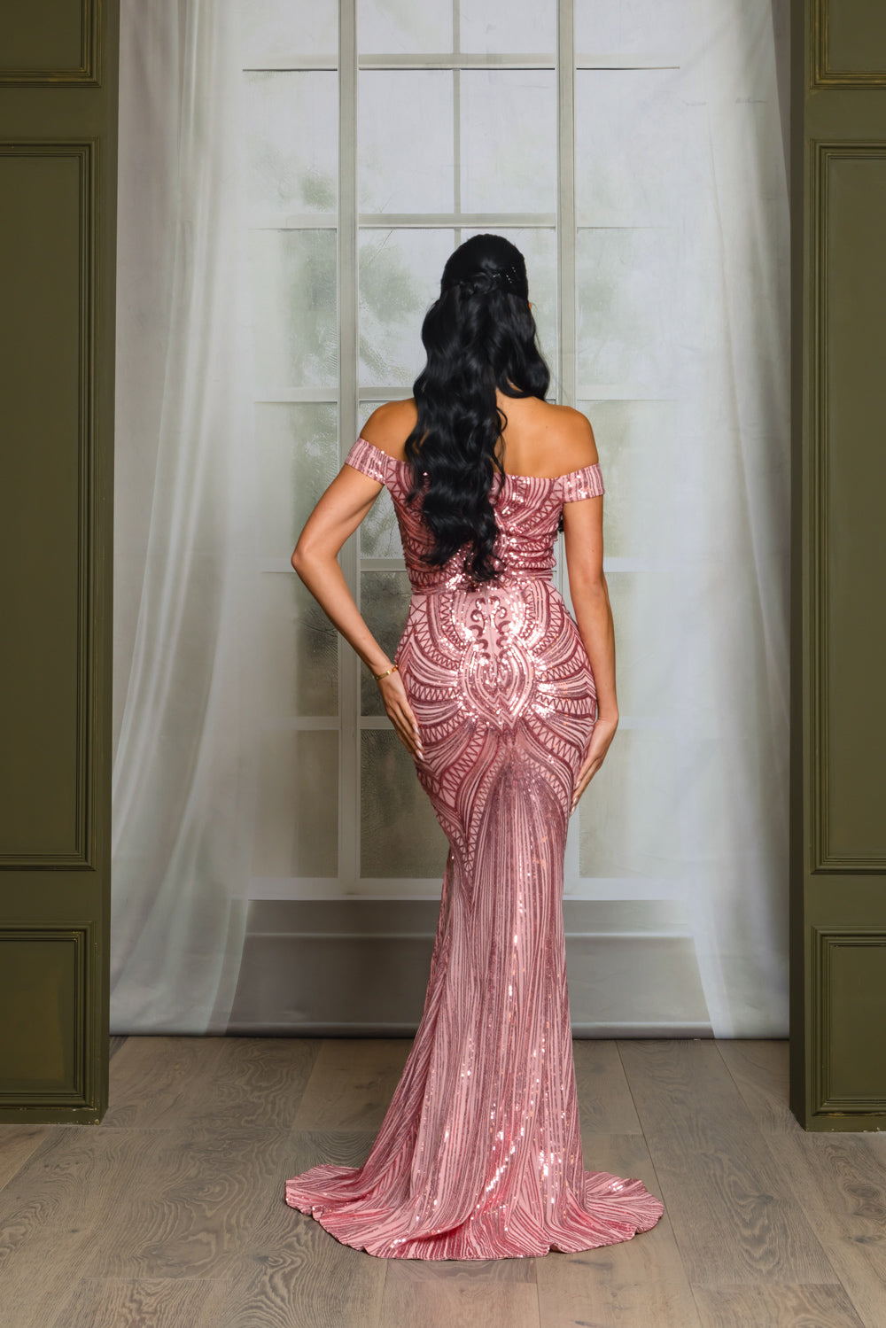Off-the-shoulder mermaid maxi dress with a slit in patterned sequins. Fully lined on top & skirt. Bra cups added. Invisible zipper at center. The fabric has good stretch.