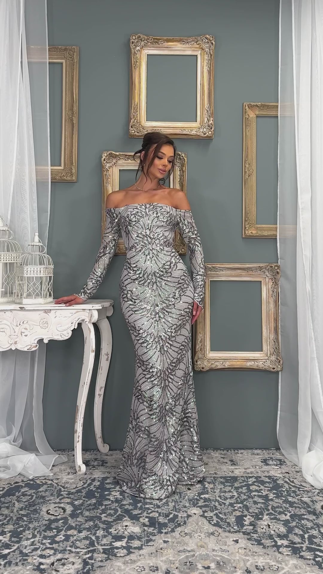Patterned sequin off shoulder long sleeve maxi dress with no slit, fully lined, back zipper, and very stretchy.