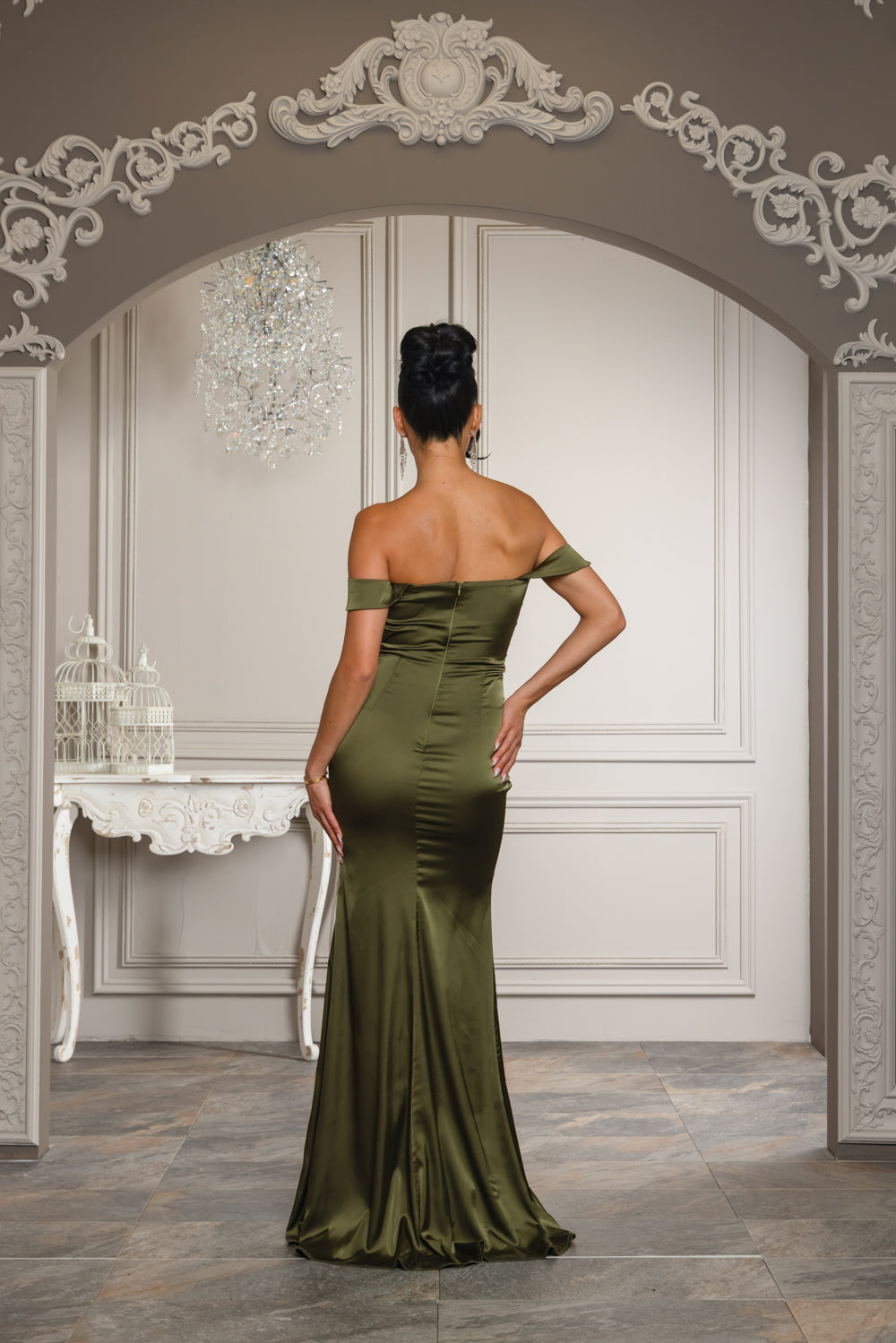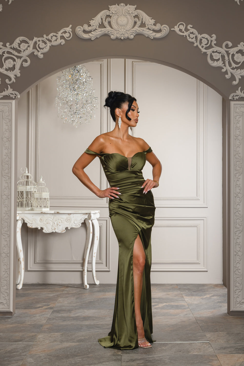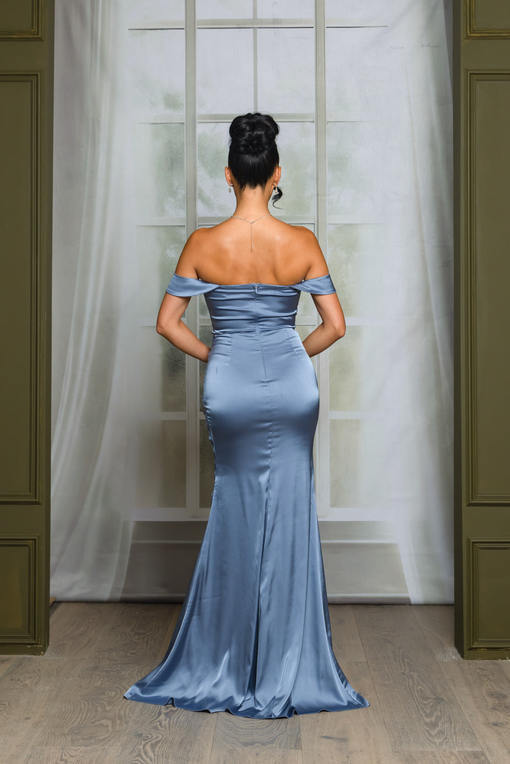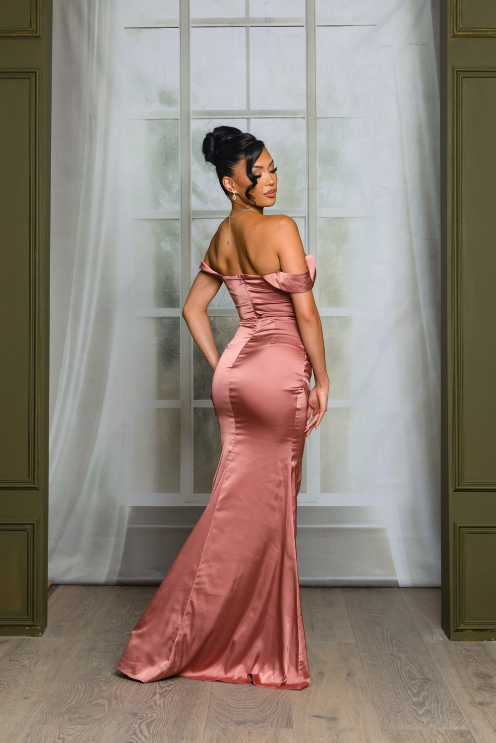 A captivating off-the-shoulder mermaid satin maxi dress in solid colors. Fully lined on top & skirt. Bra cups added. Invisible zipper at center.
