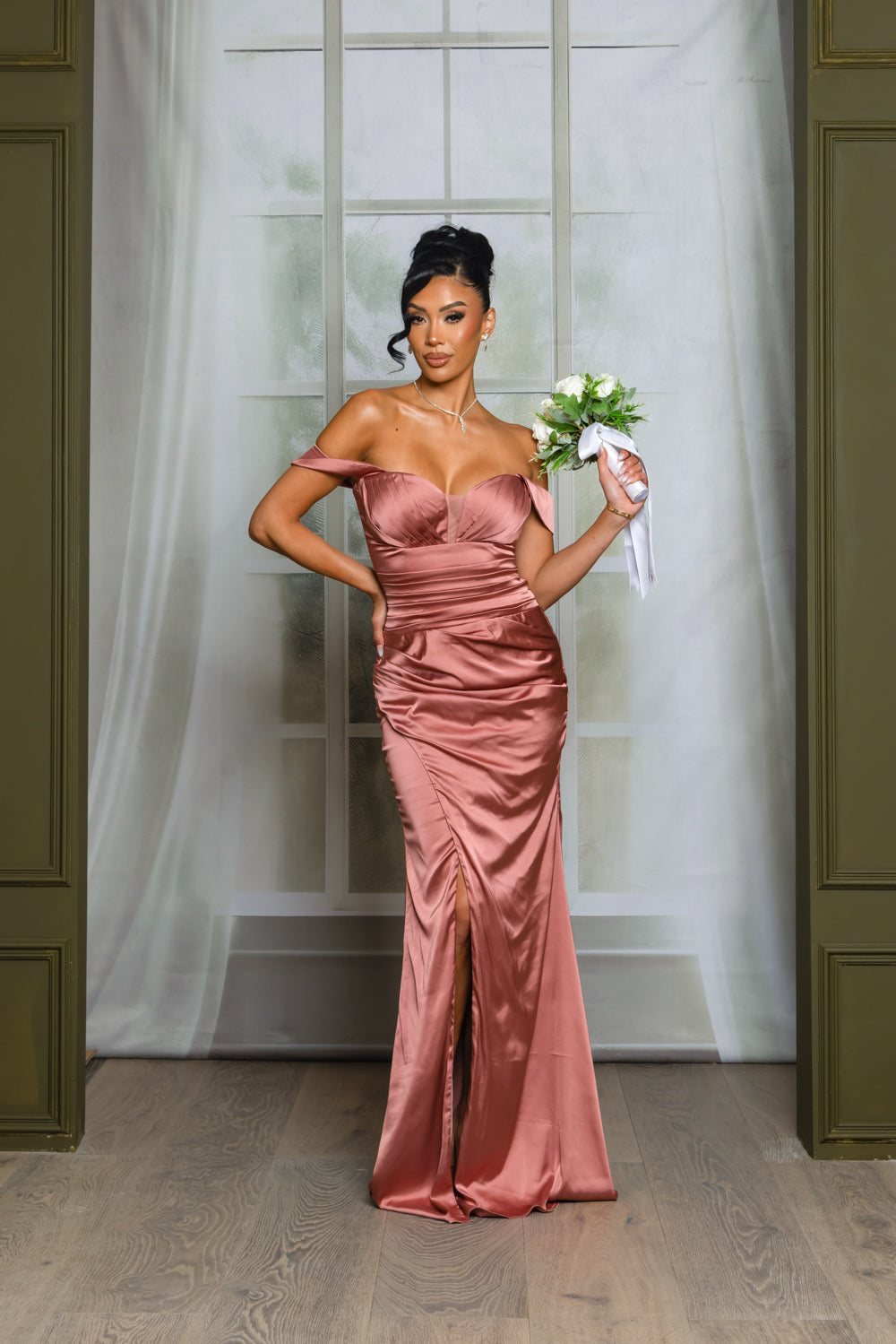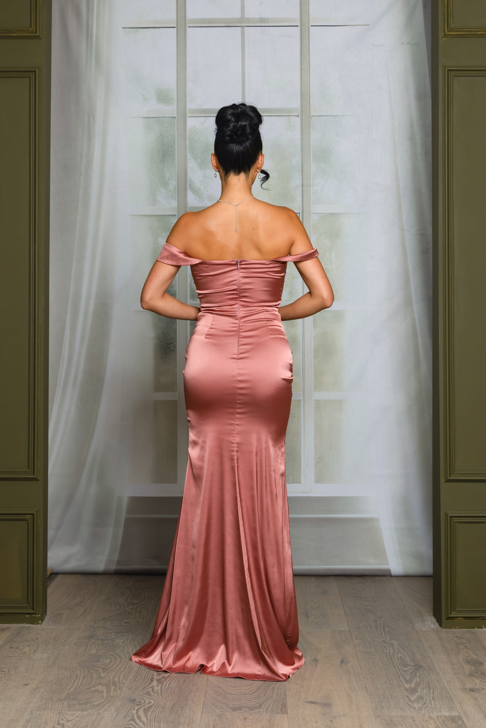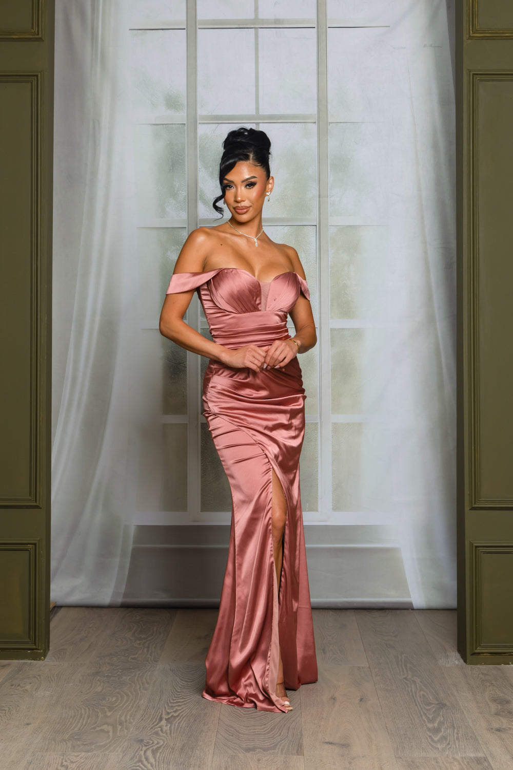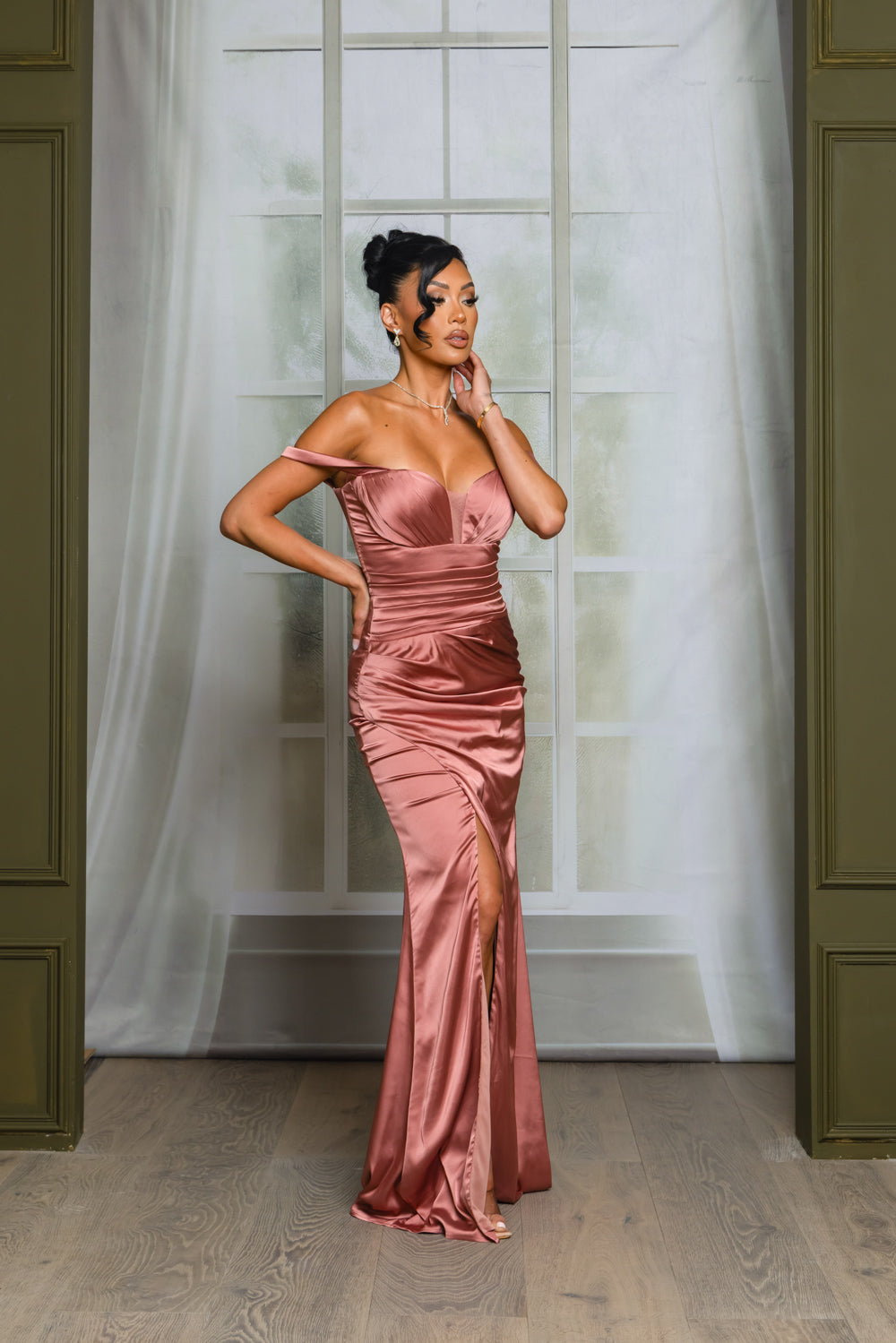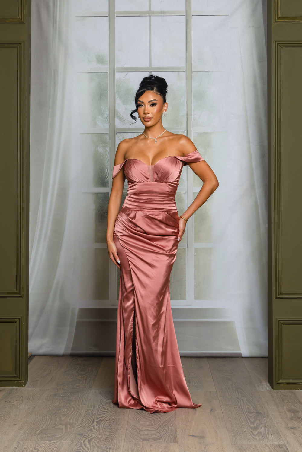 A captivating off-the-shoulder mermaid satin maxi dress in solid colors. Fully lined on top & skirt. Bra cups added. Invisible zipper at center.