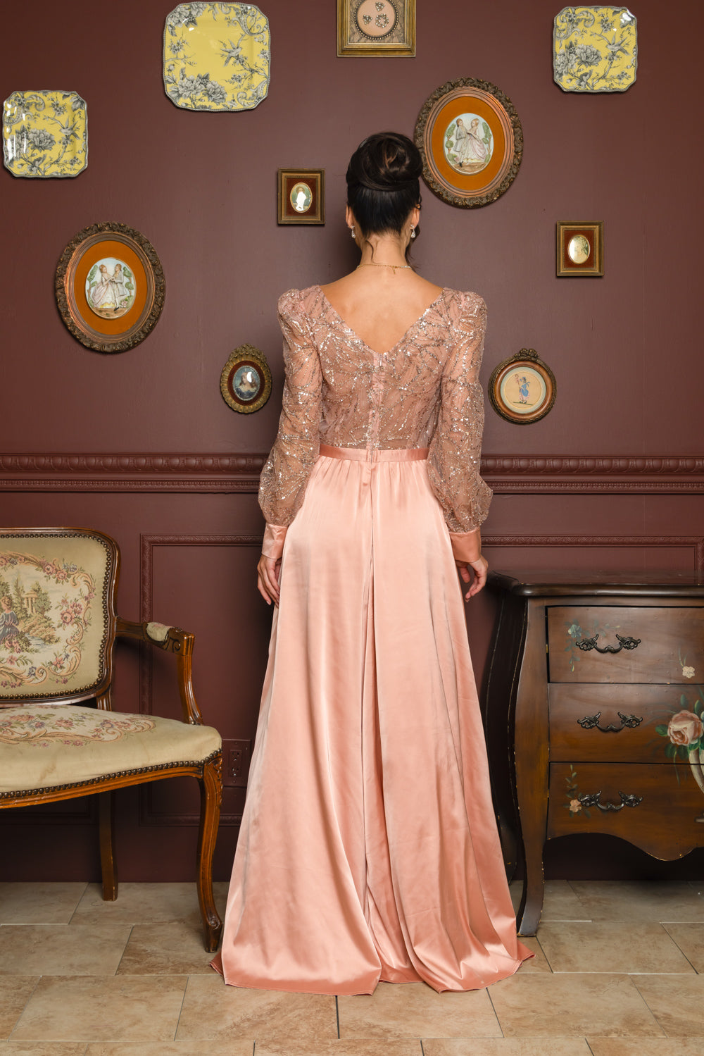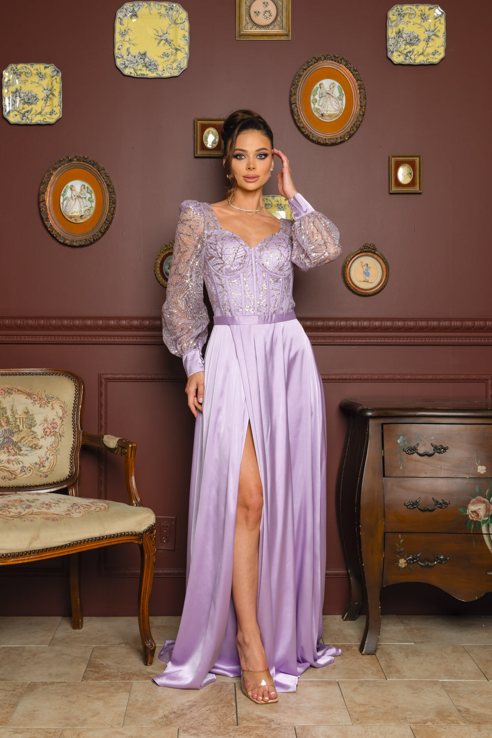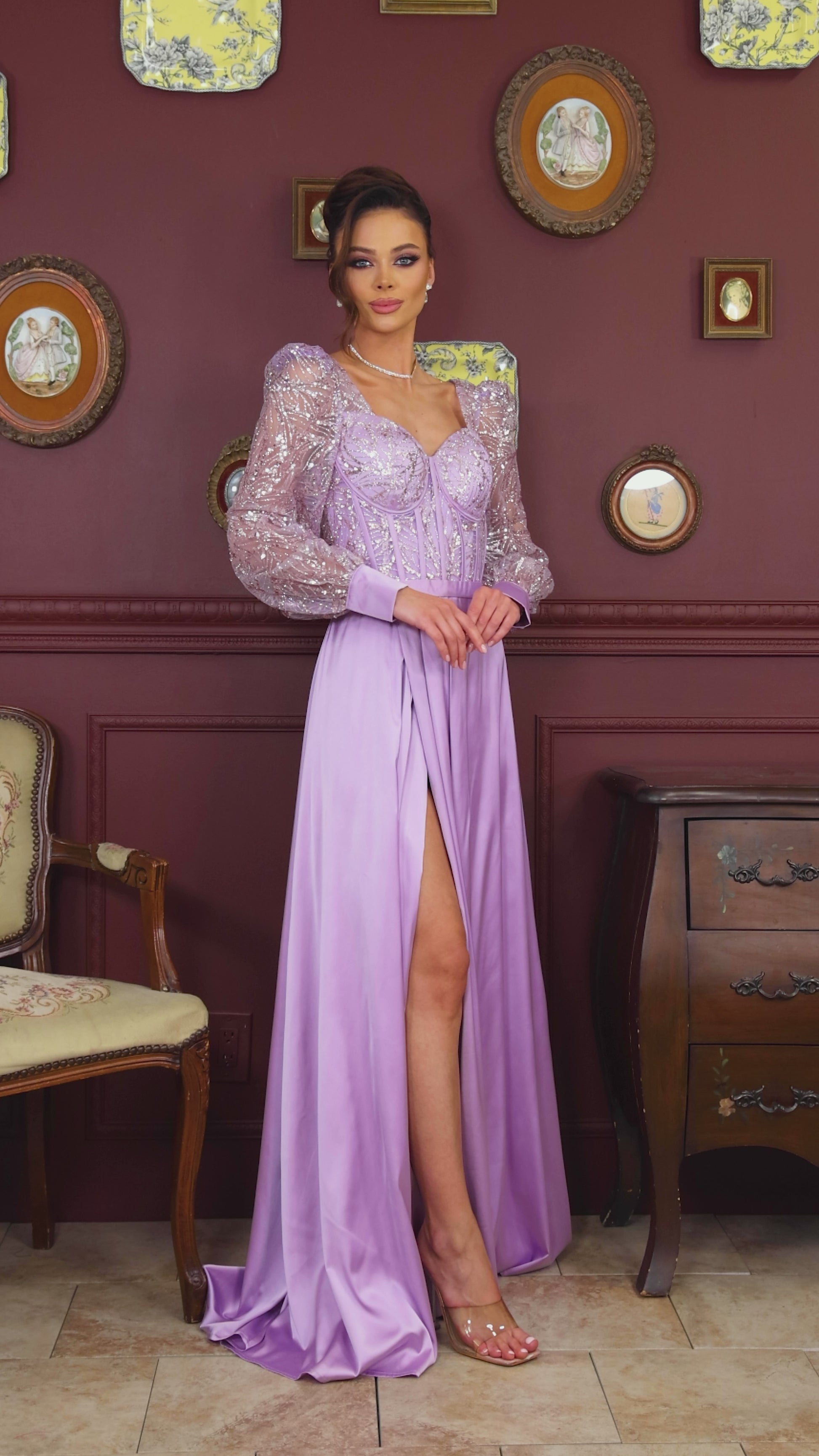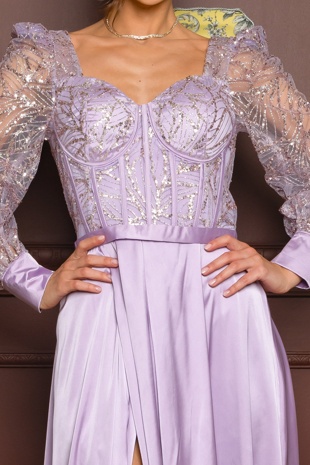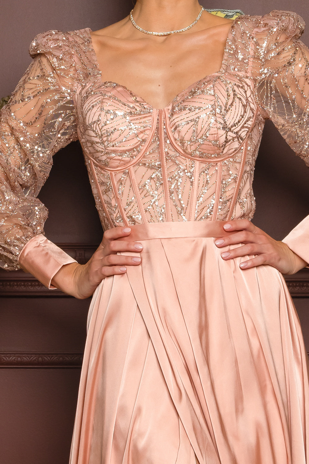 Long sleeve glitter corset top satin bottom maxi dress with cuffed sleeves, , back zipper, no stretch, and fully lined skirt.