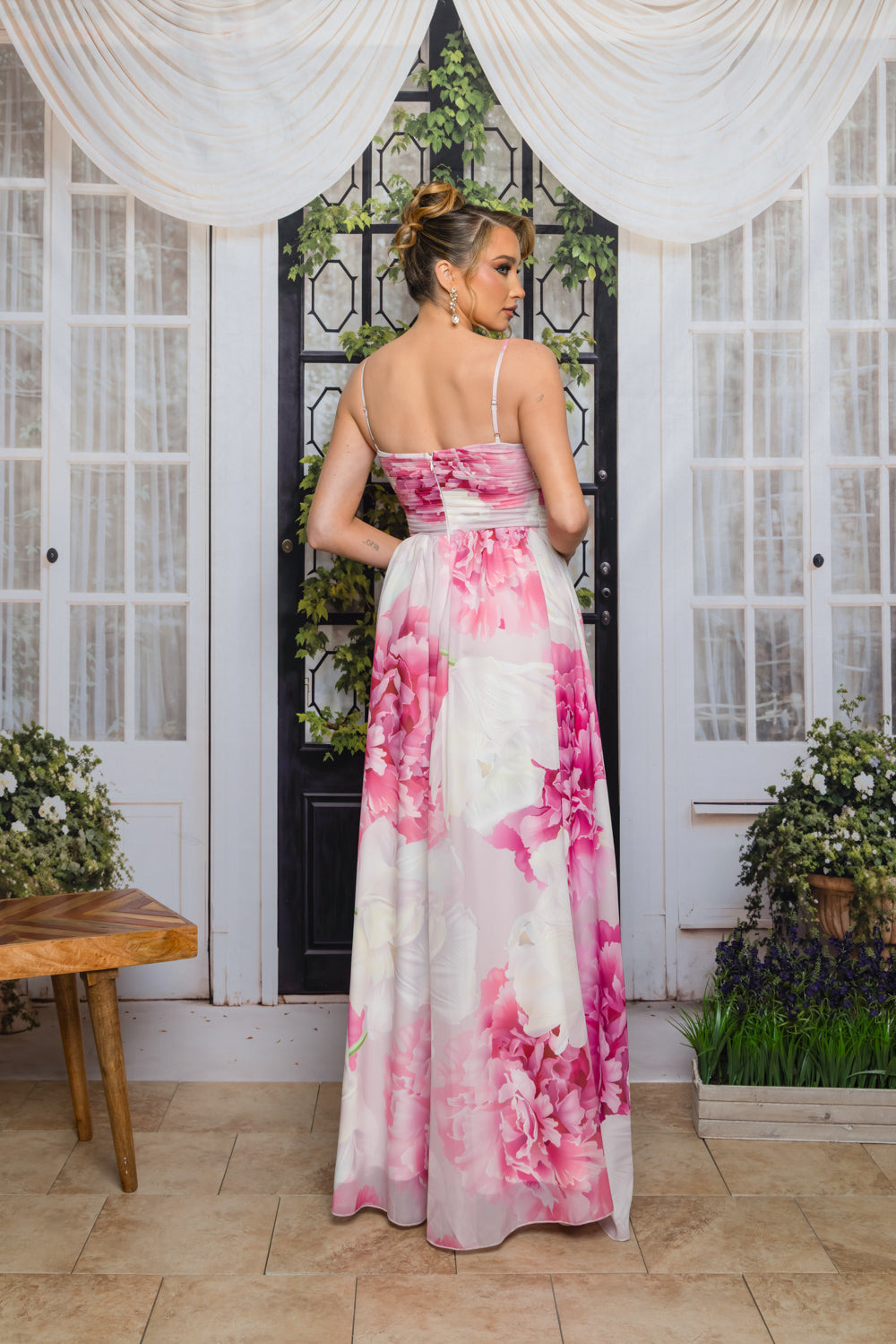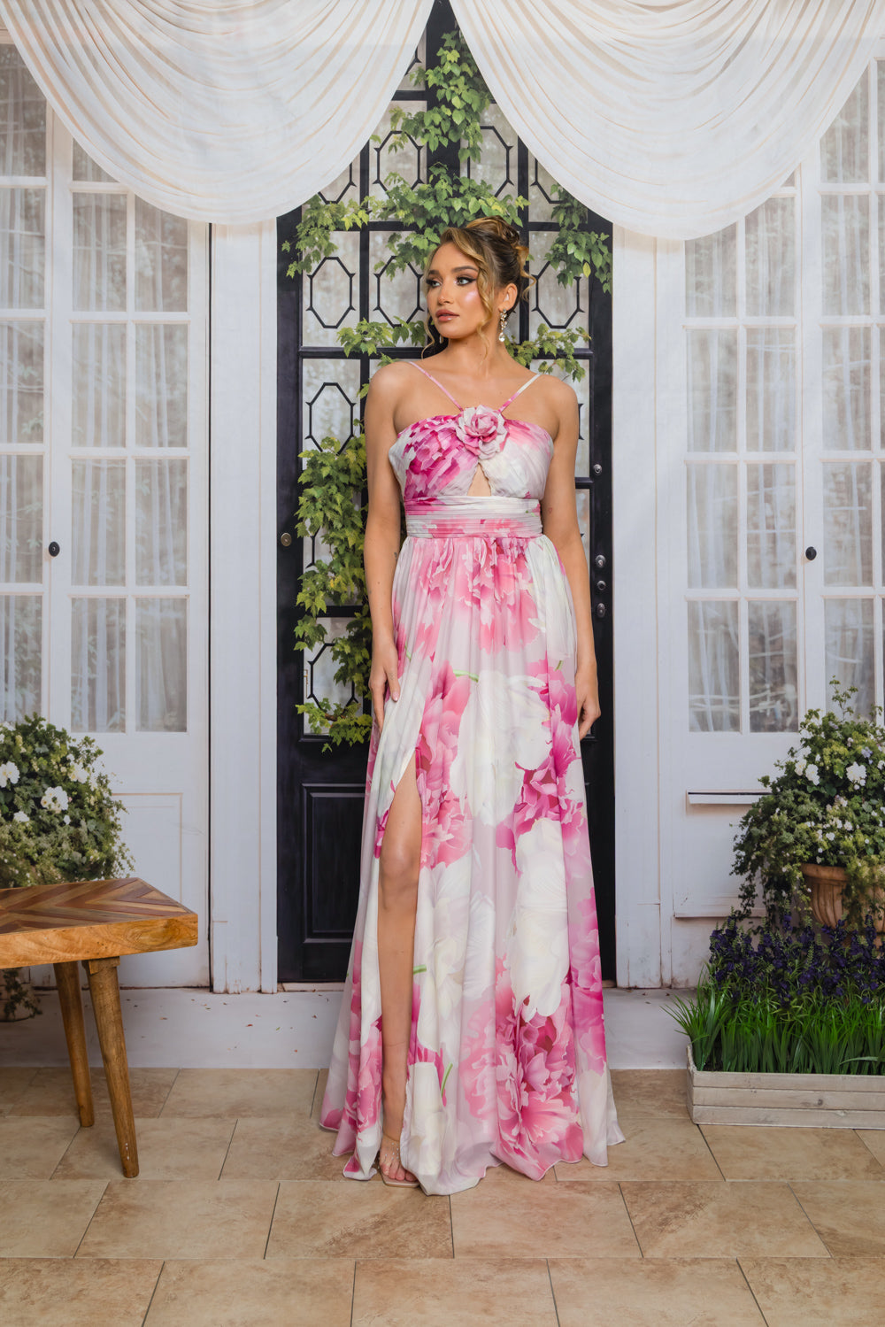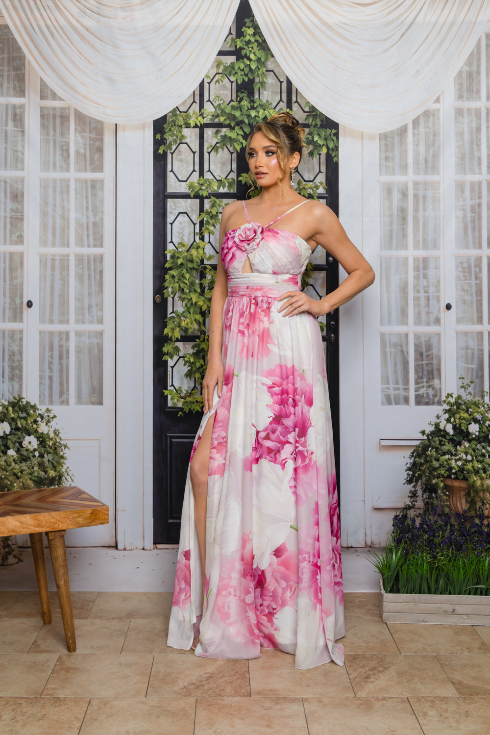 Floral chiffon print dress with halter adjustable straps, full lining, bra cups, front cut out and flower detail. Dress has slit and back zipper and no stretch in waist.
