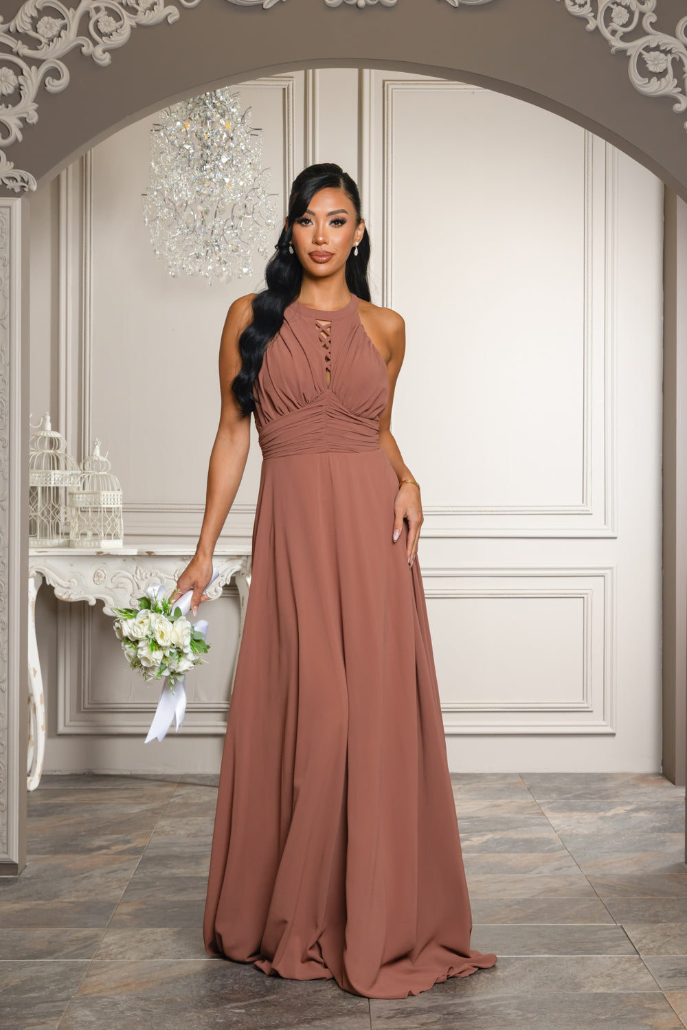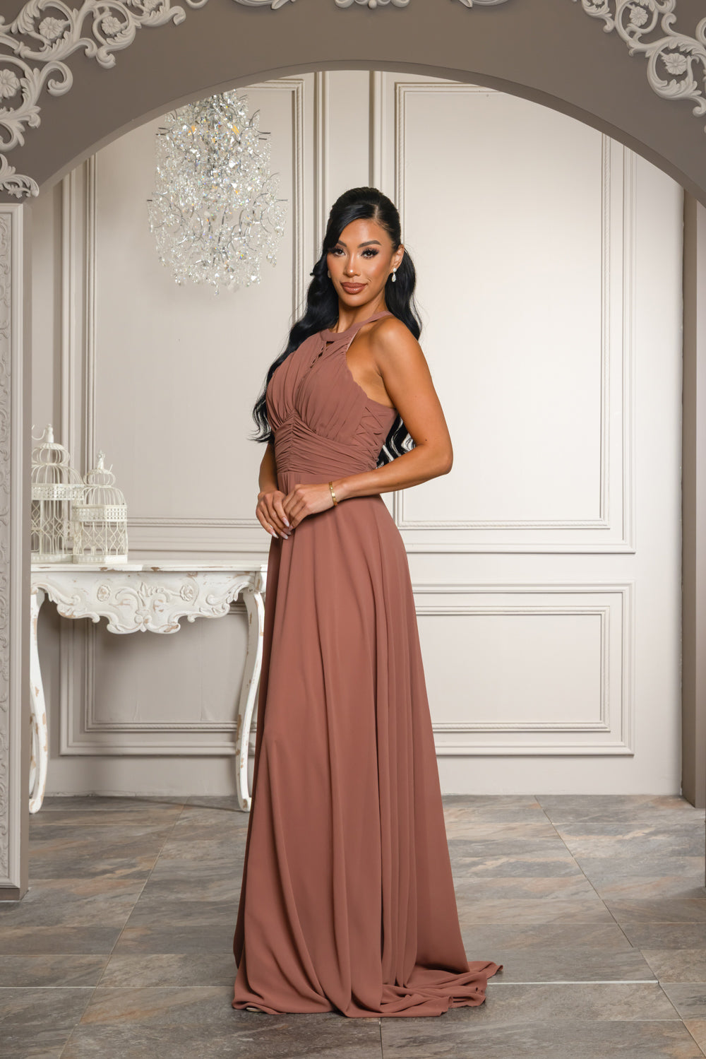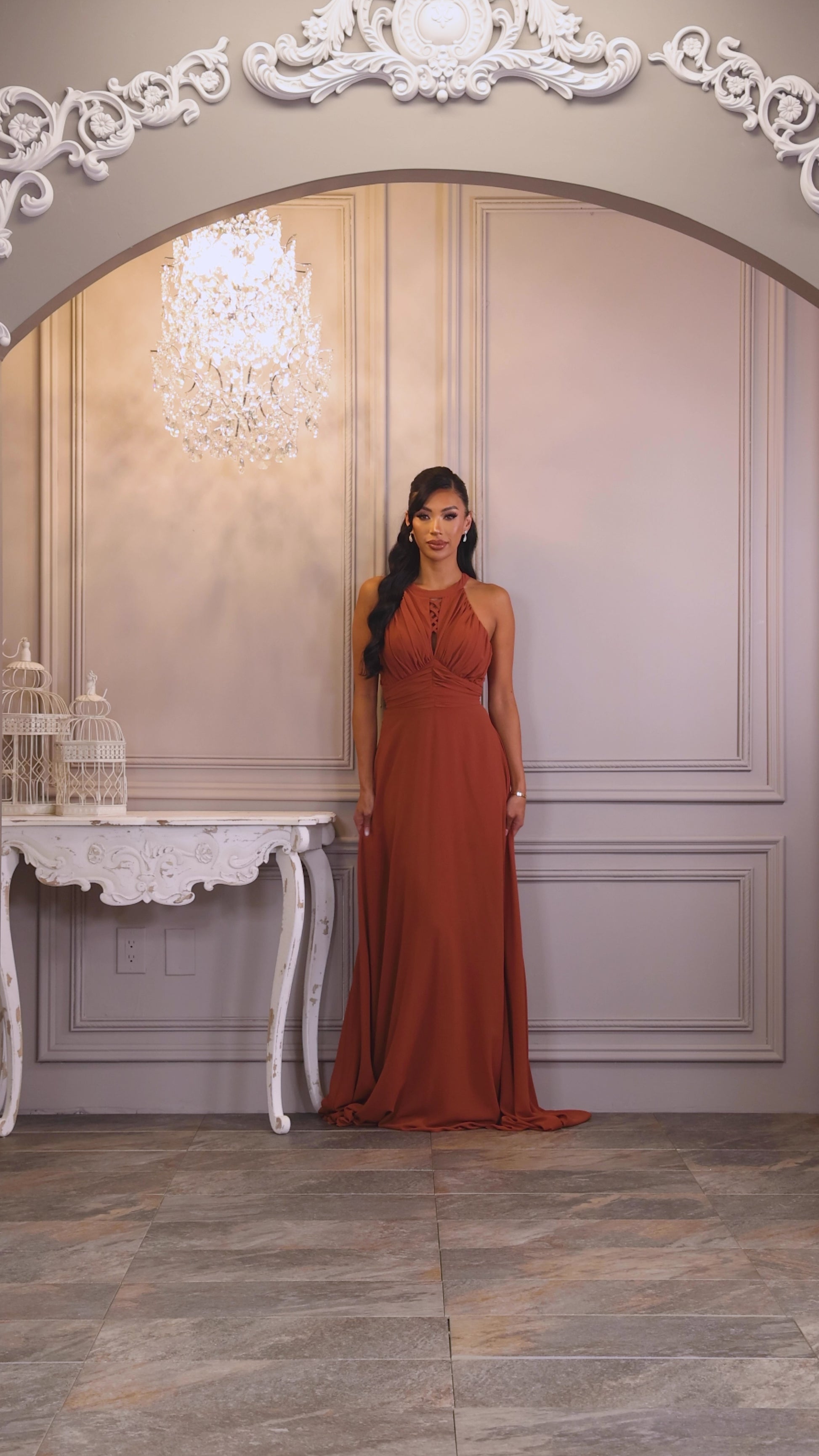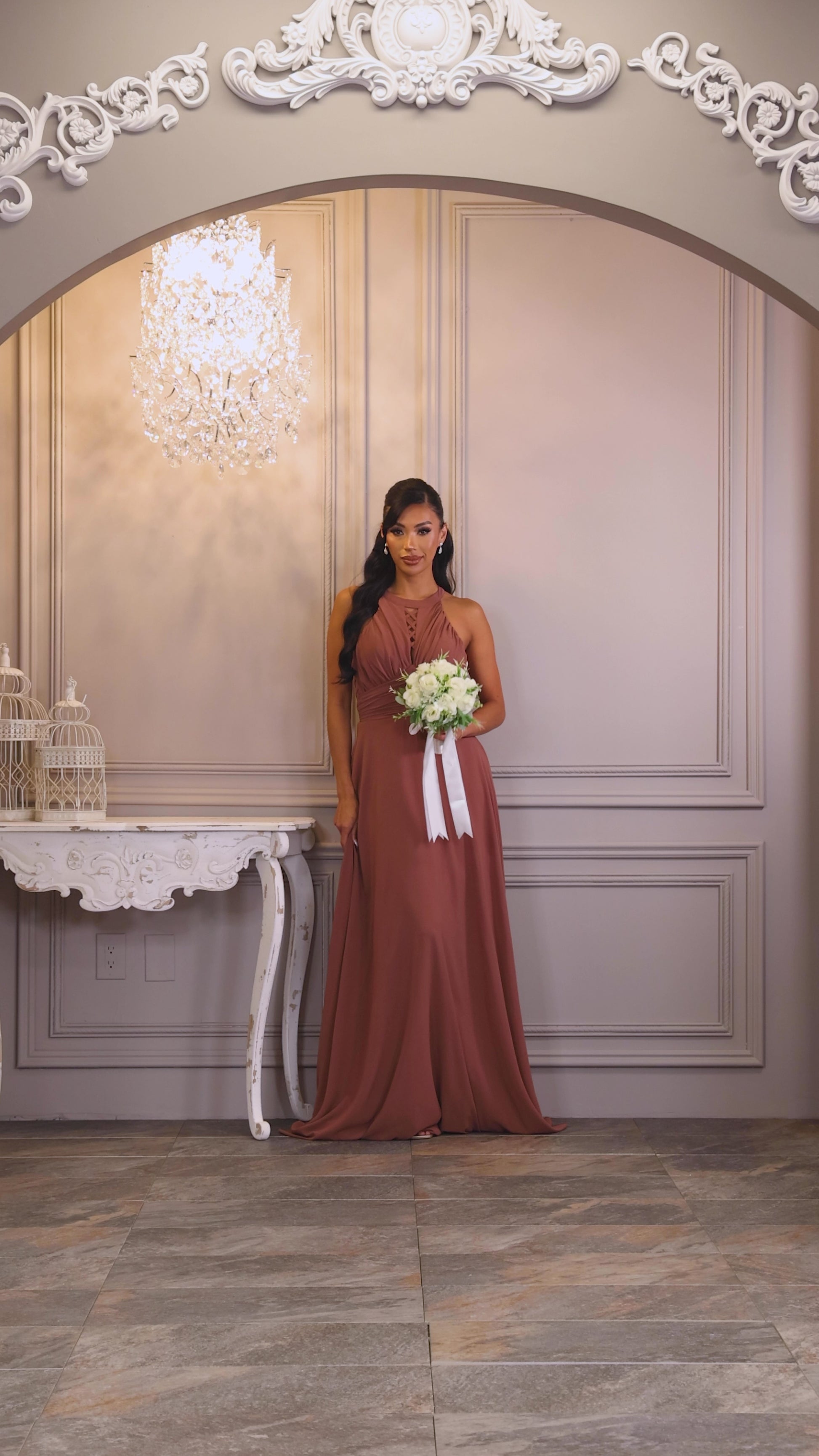 Solid color chiffon maxi dress with high sleeveless halter top, loose a line skirt, fully lined, and back zipper. Dress is not stretchy