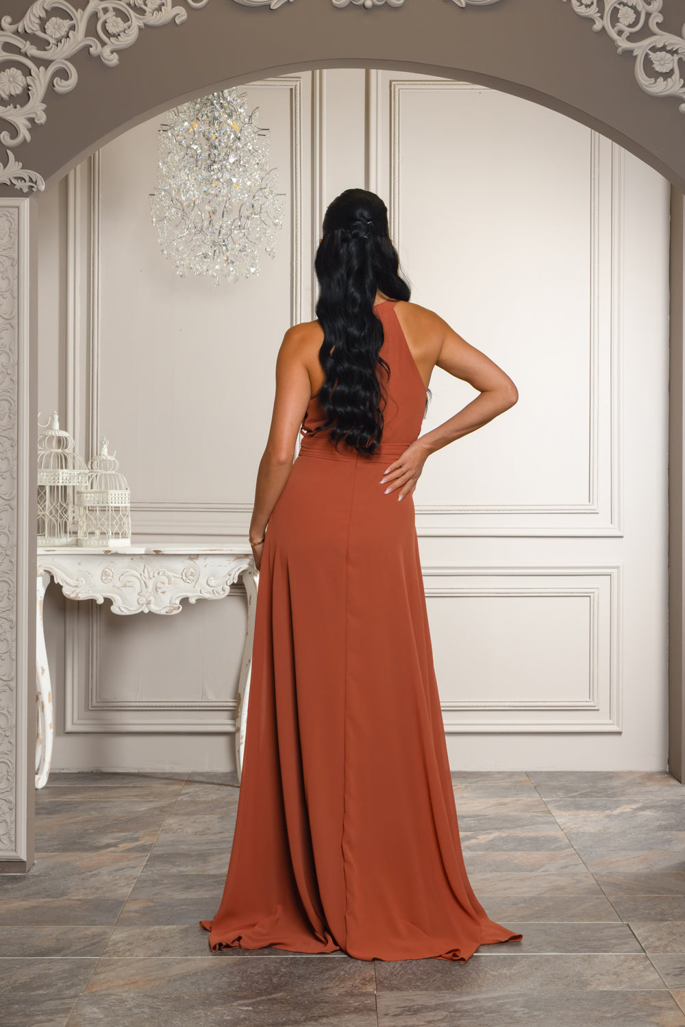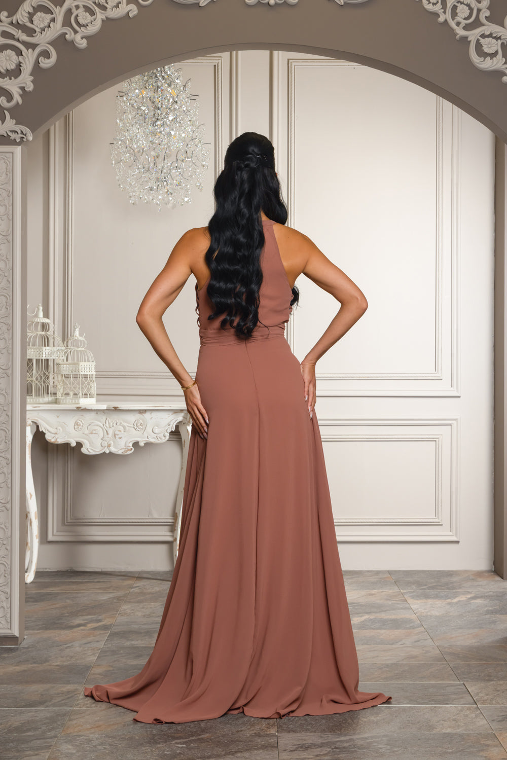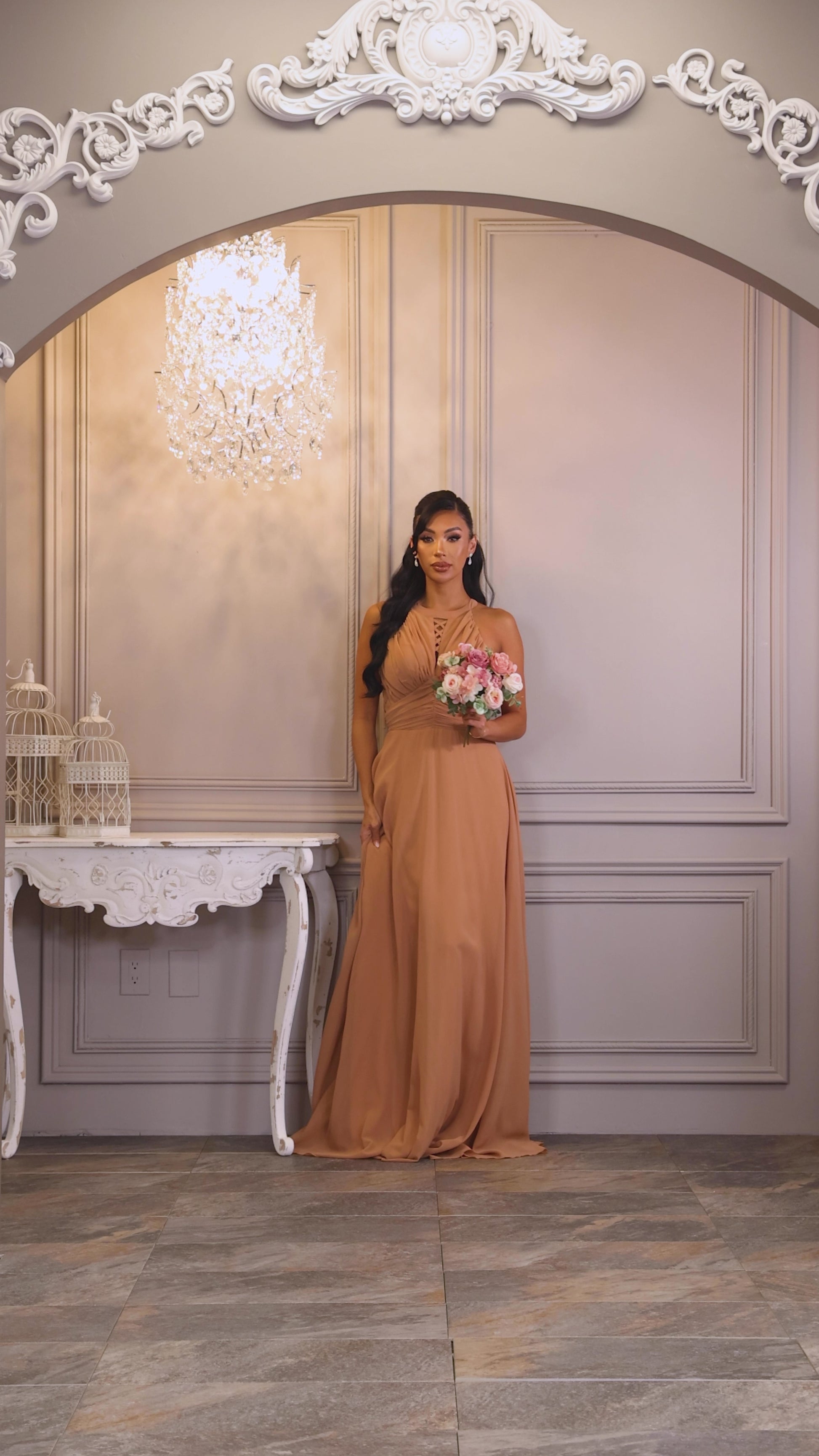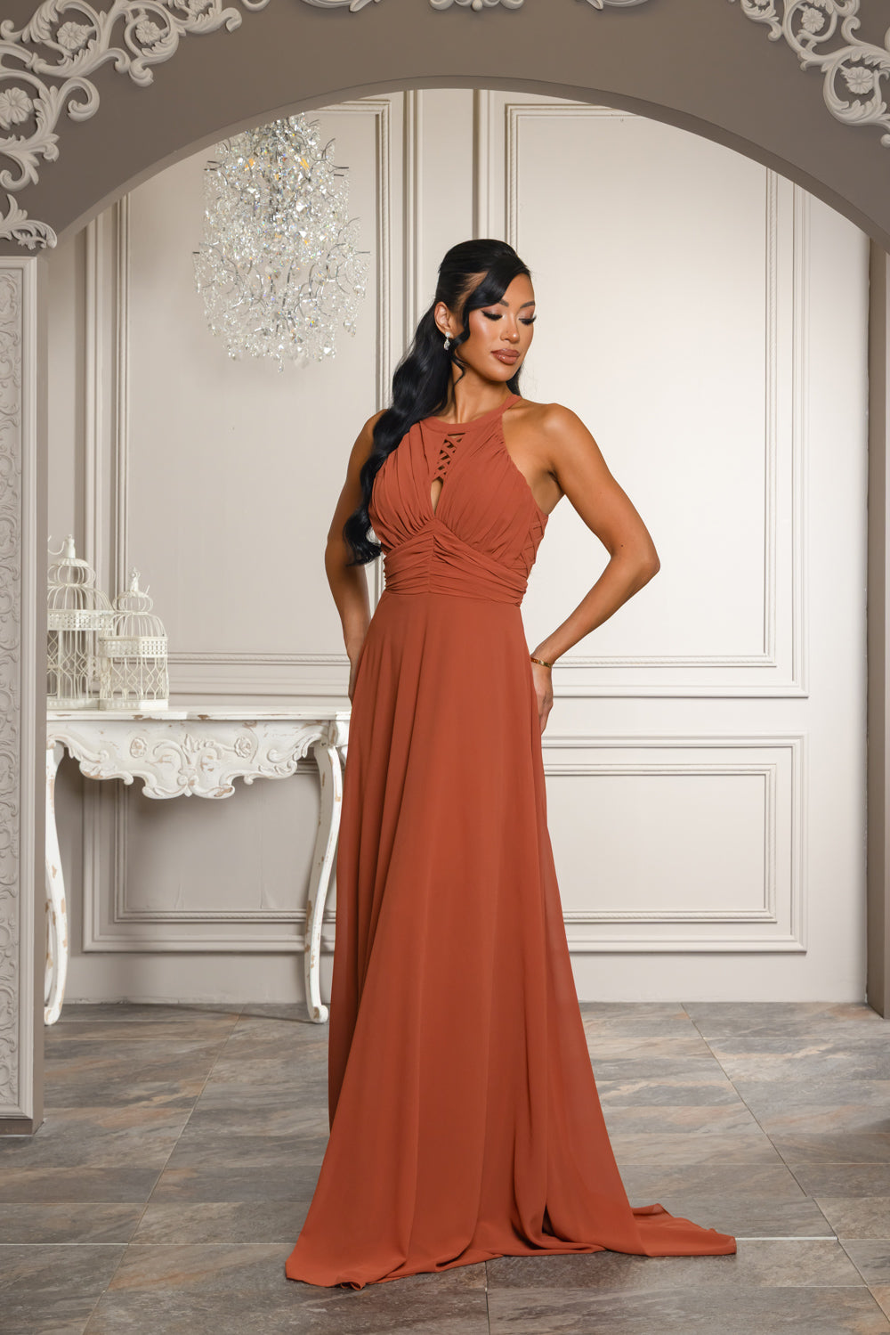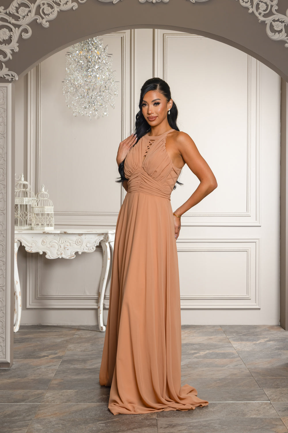 Solid color chiffon maxi dress with high sleeveless halter top, loose a line skirt, fully lined, and back zipper. Dress is not stretchy