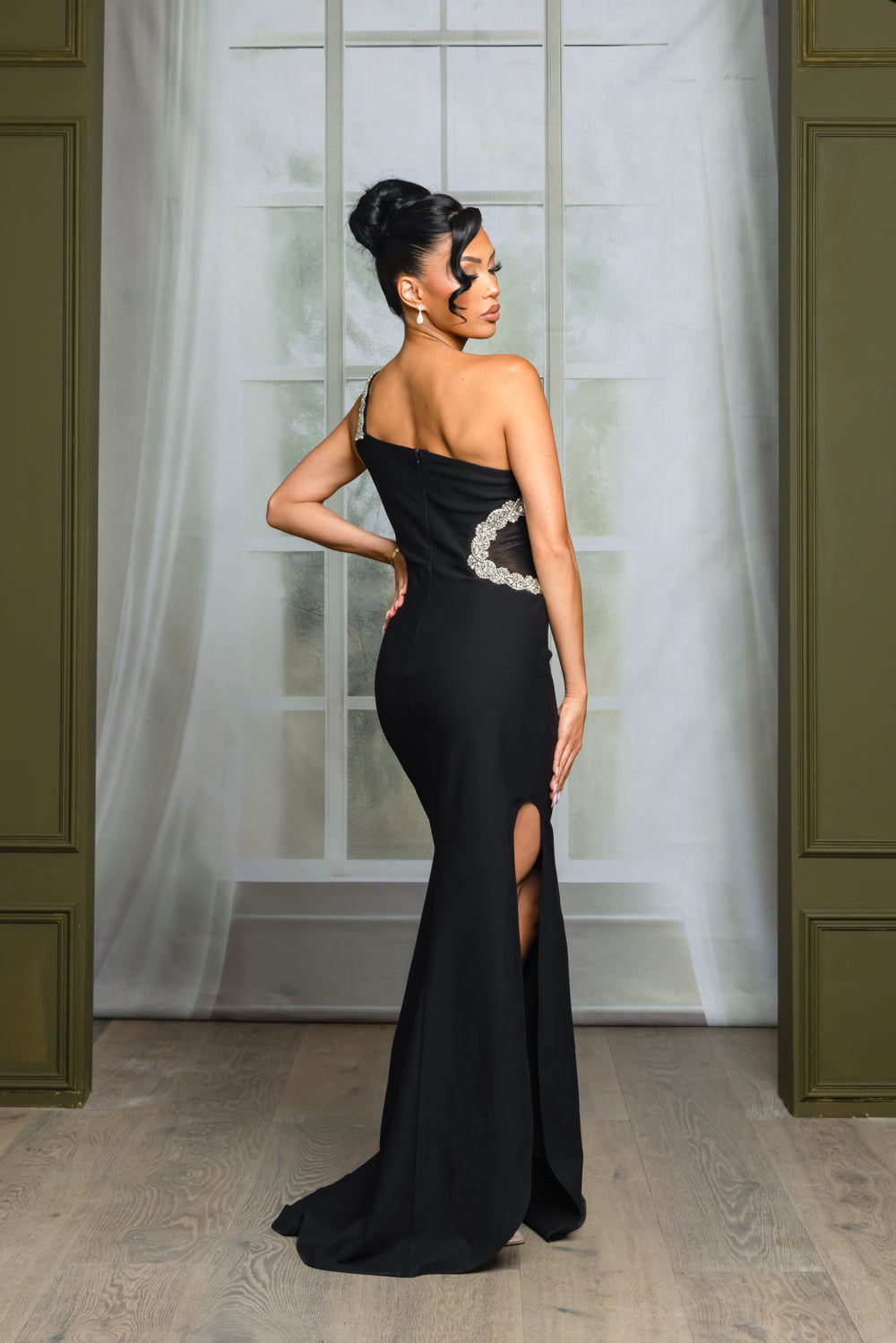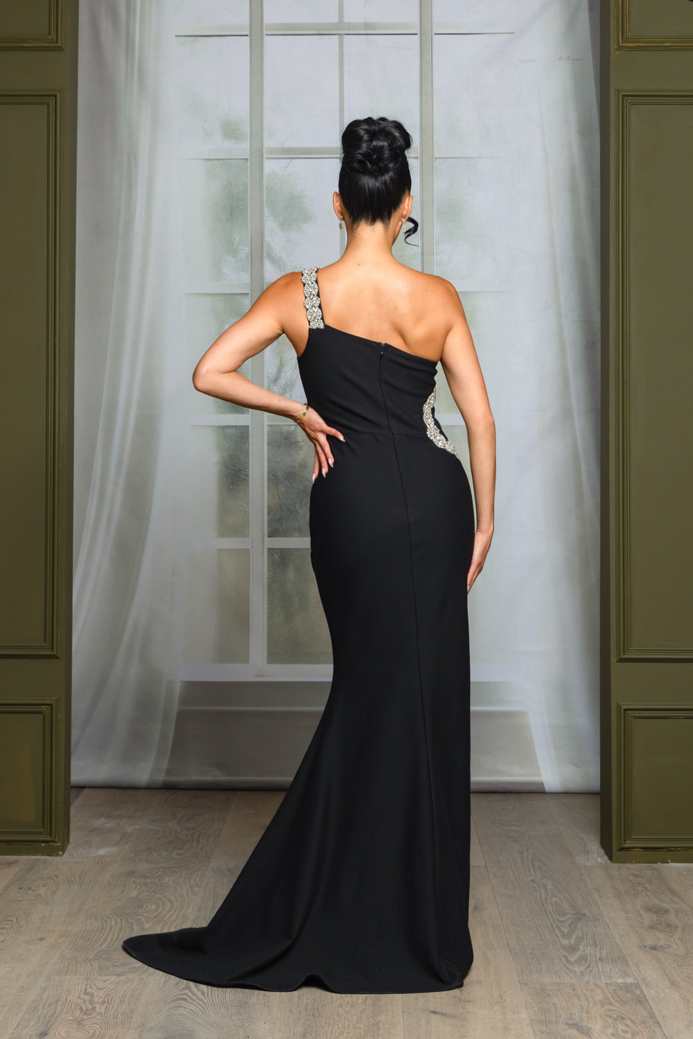 This stunning black one-shoulder maxi gown features a flattering silhouette that accentuates the figure with a sleek, floor-length cut and a dramatic mermaid-style hem that cascades into a graceful train.