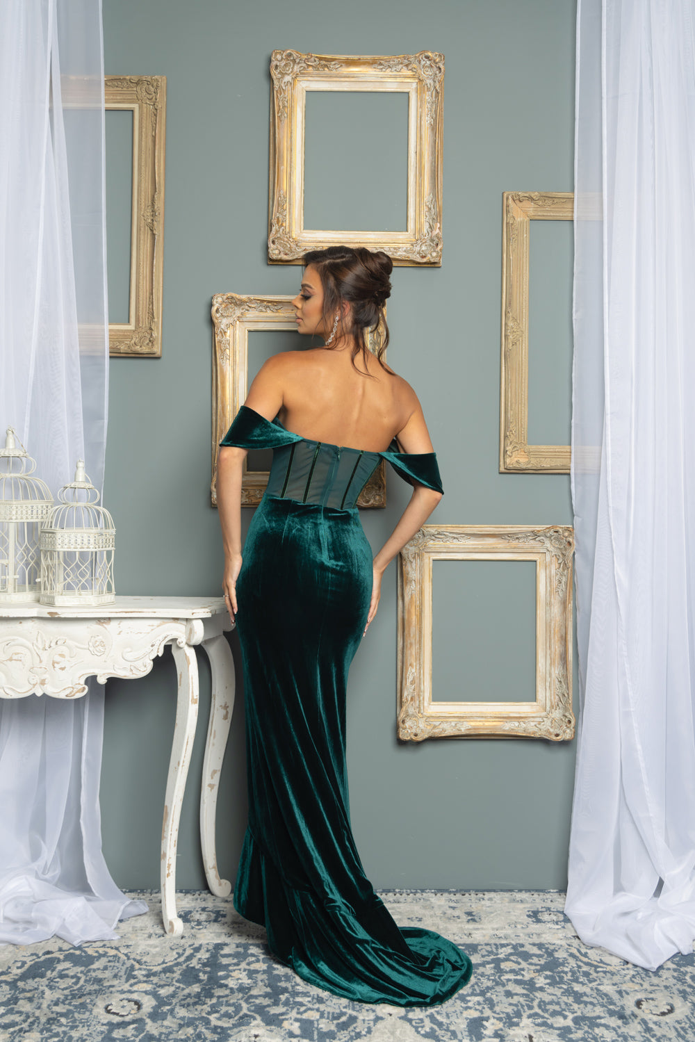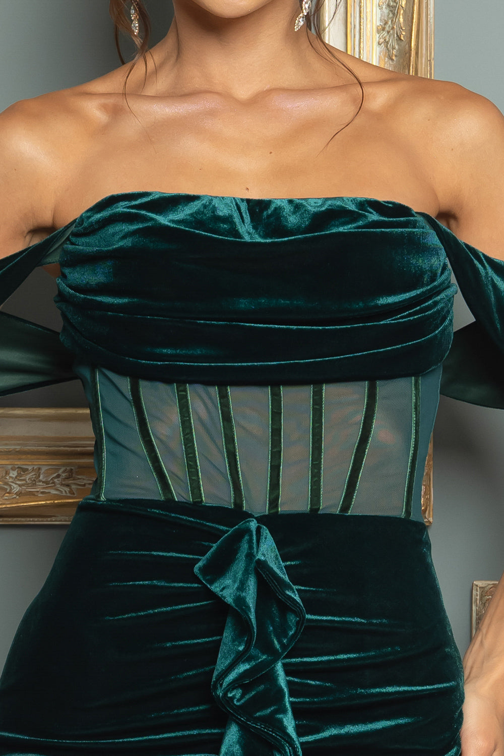 Solid color off the shoulder maxi velvet dress with a high low ruffle slit, cowl neck, back zipper, and mesh corset waist. Dress is fully lined except on mesh. Very stretchy.