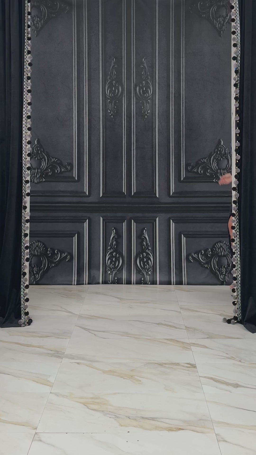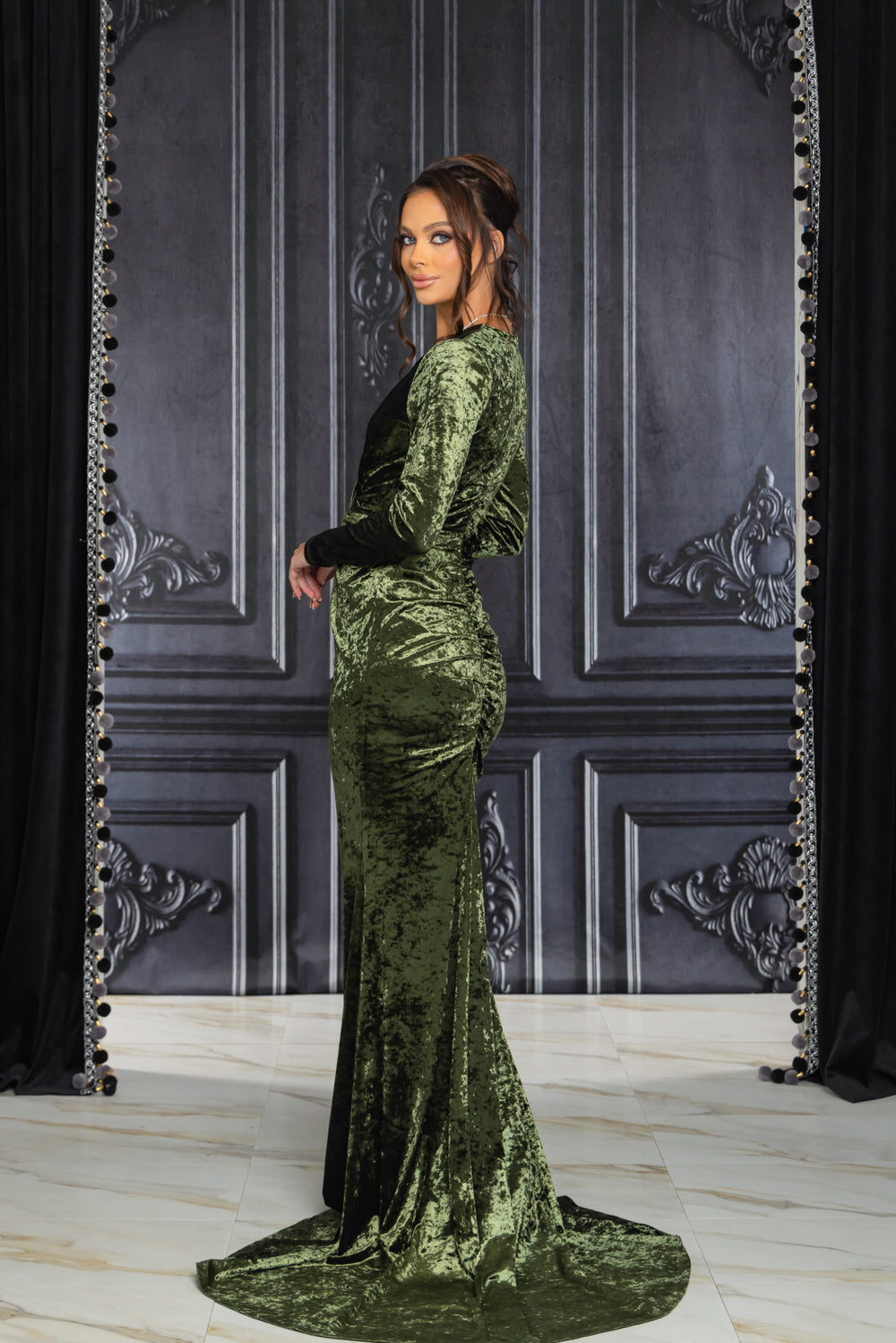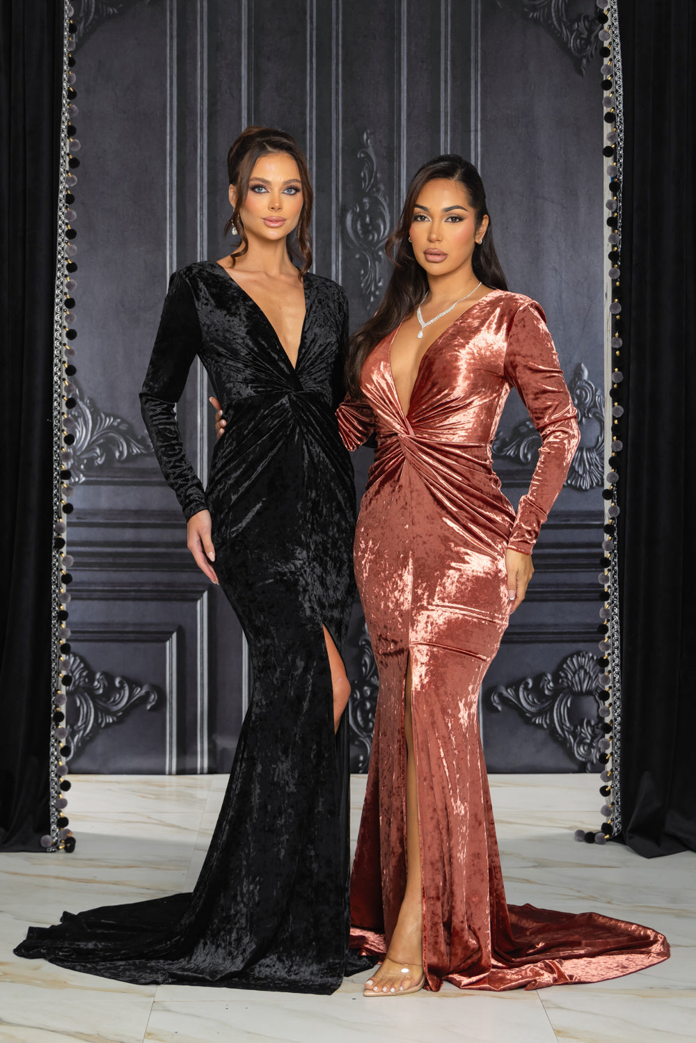 Solid color crushed velvet long sleeve maxi dress with full lining, deep v neck line, slit, and back zipper. Dress is very stretchy.