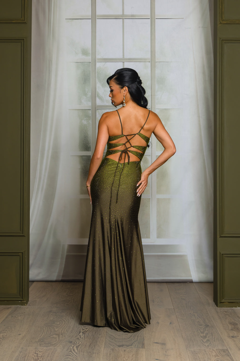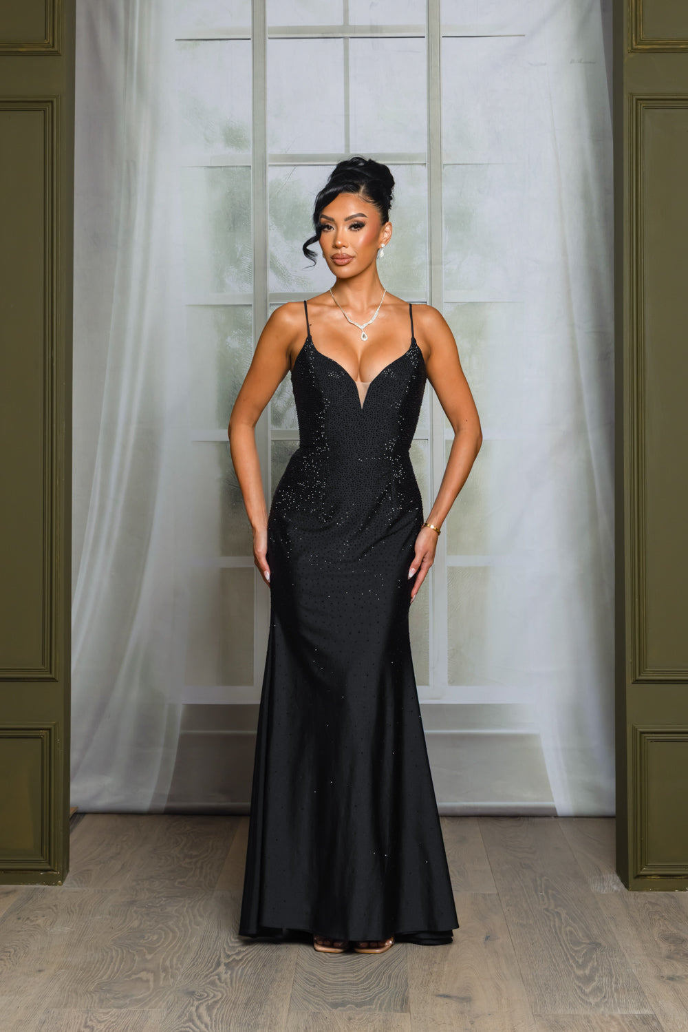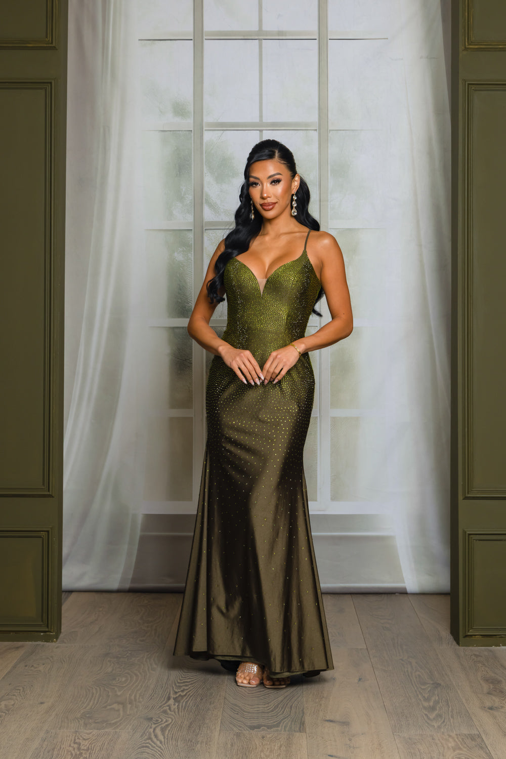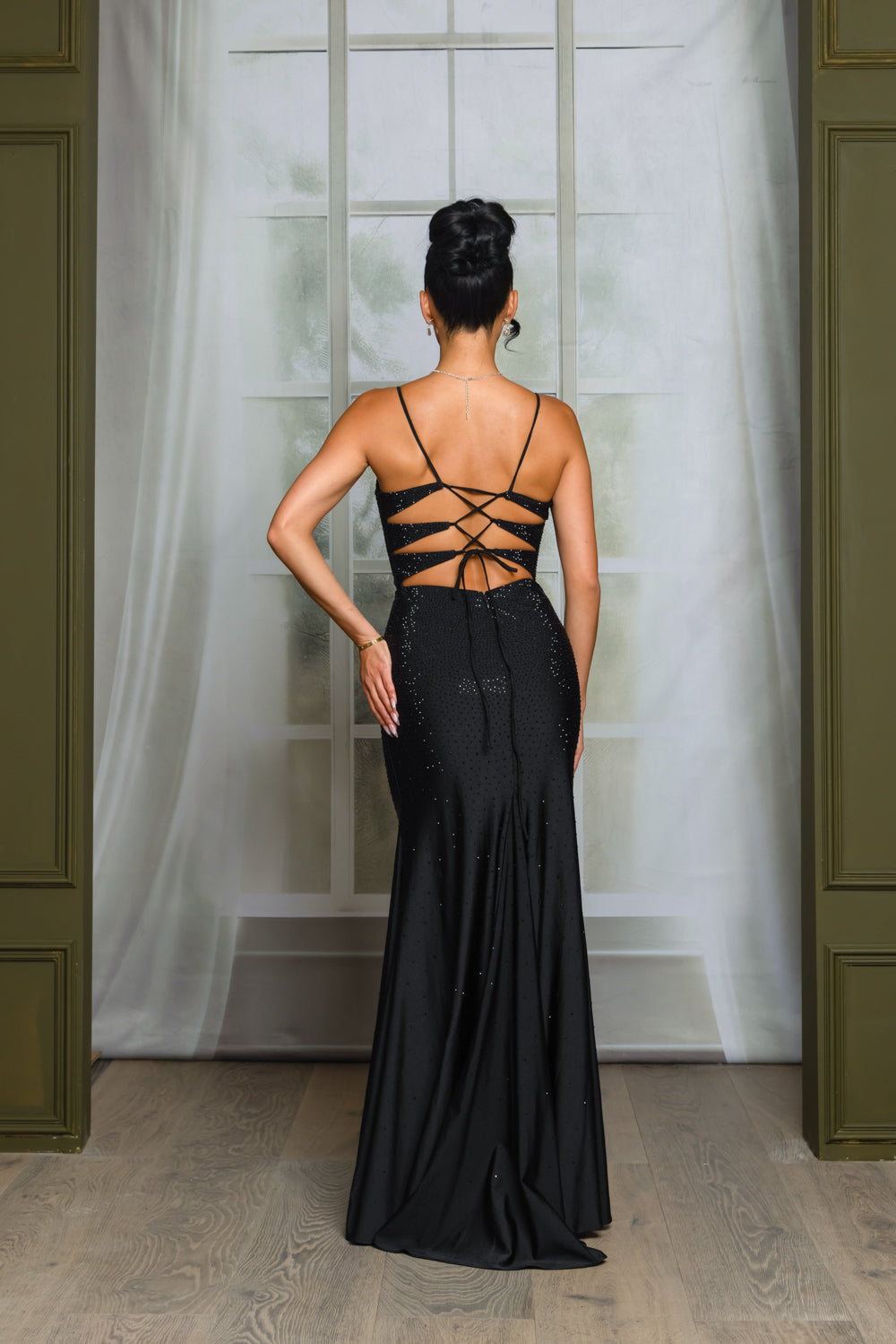 Rhinestone embellished spandex maxi dress with full lining, bra cups, no slit, cross tie back, and back zipper. Dress has very good stretch and straps stretch but are not adjustable.