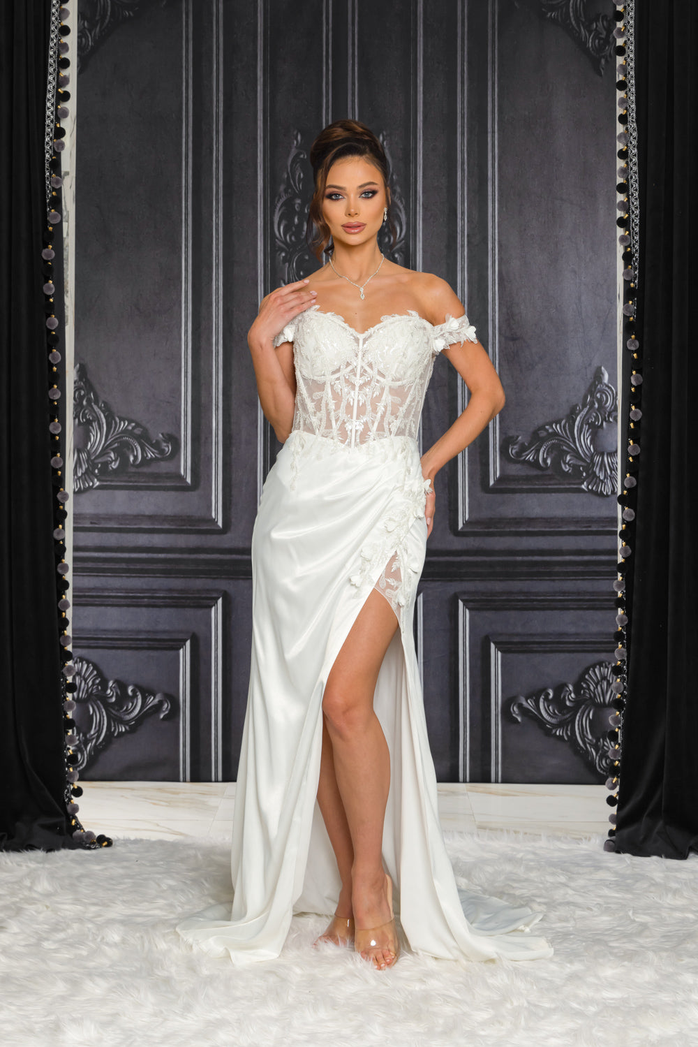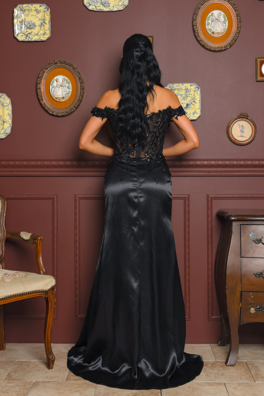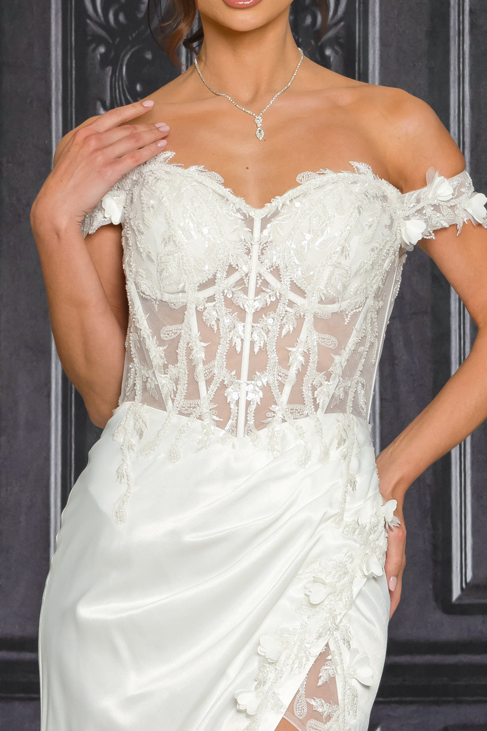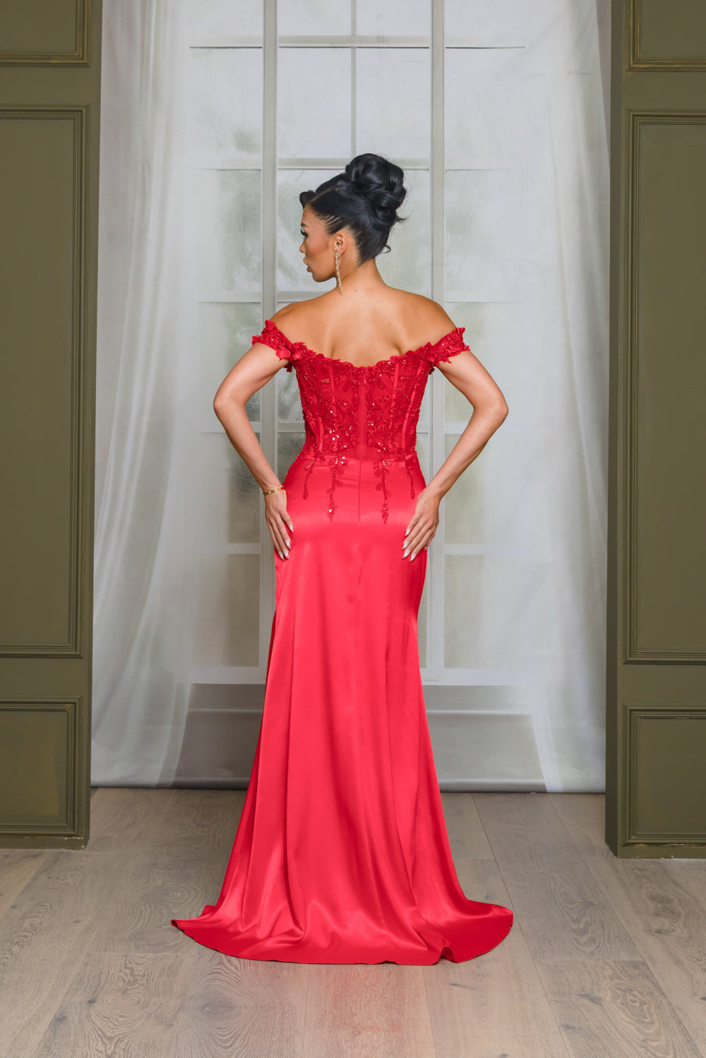 Off shoulder embroidered beaded sequin maxi dress with satin lined mermaid skirt, bra cups, and back zipper.