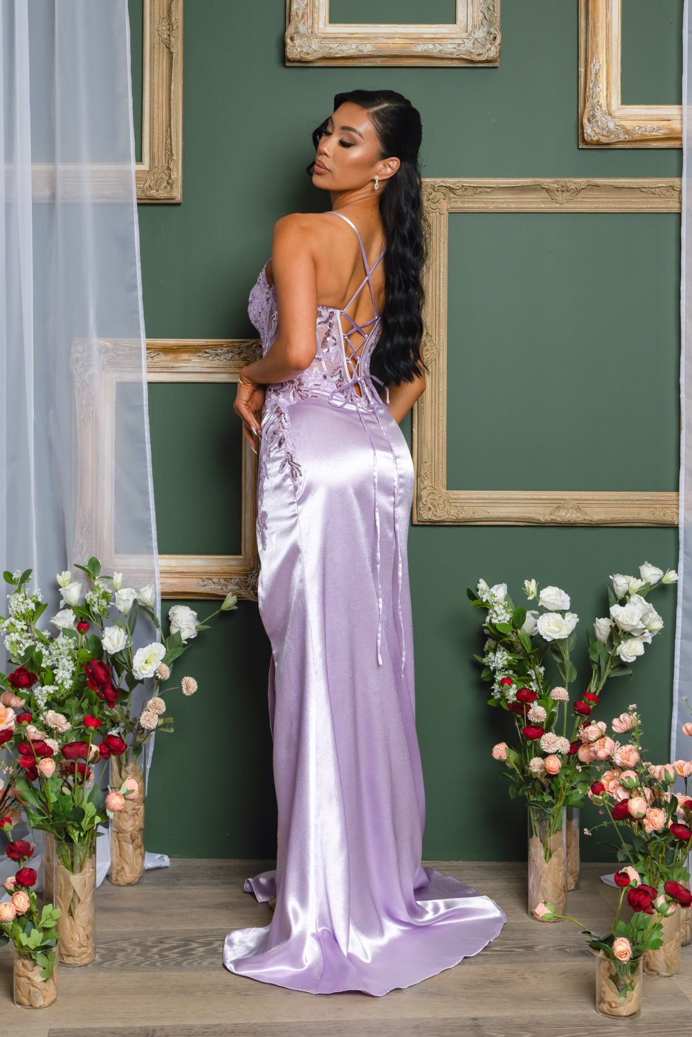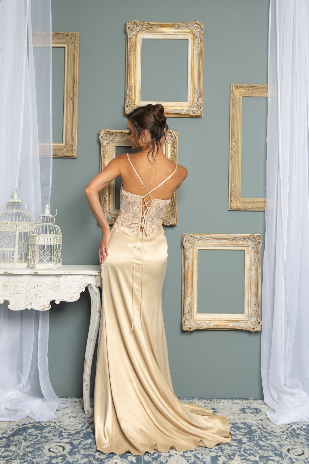 Embroidered beaded sequin maxi dress with satin lined mermaid skirt, bra cups, lace up back, and back zipper.