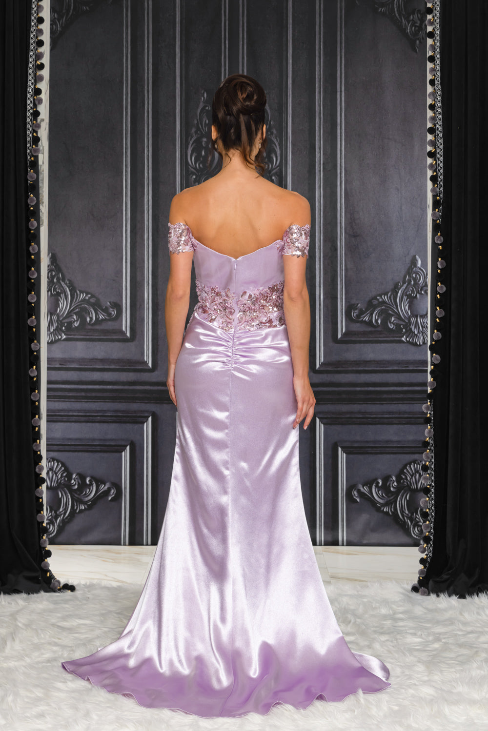 Off shoulder sweetheart neckline maxi dress with beads and embroidery on waist and sleeves. Dress is fully lined has a slit and a back zipper. Dress has little stretch.