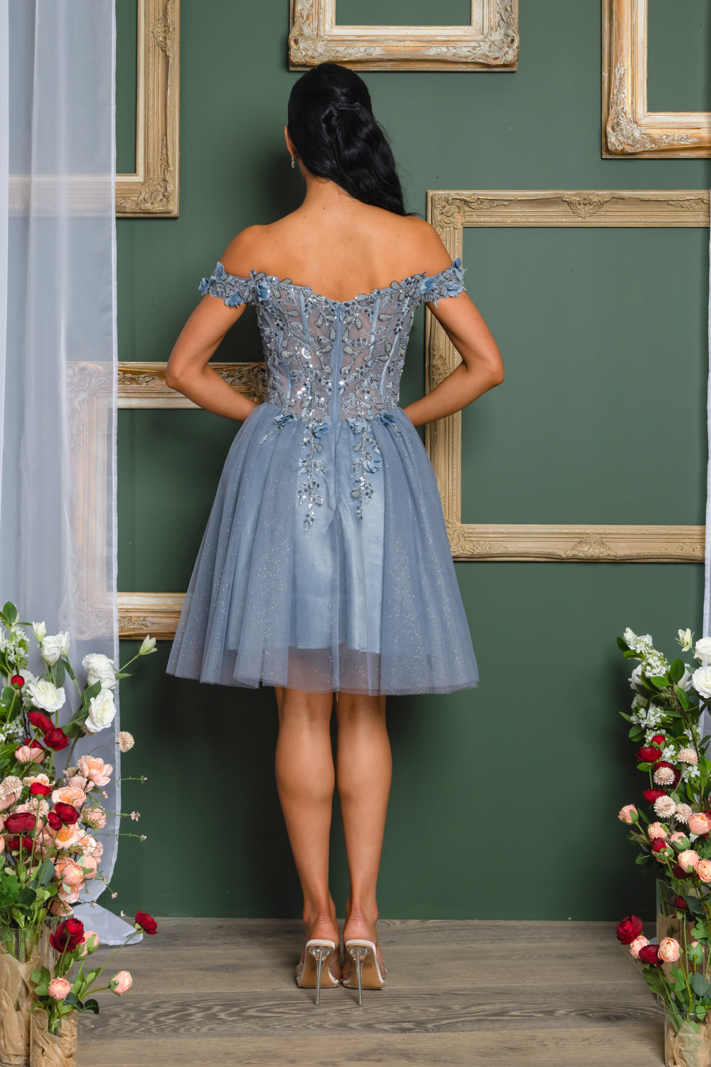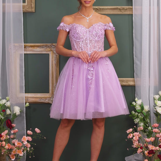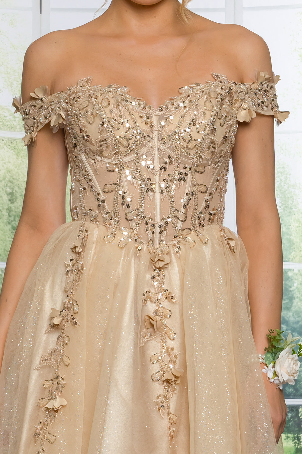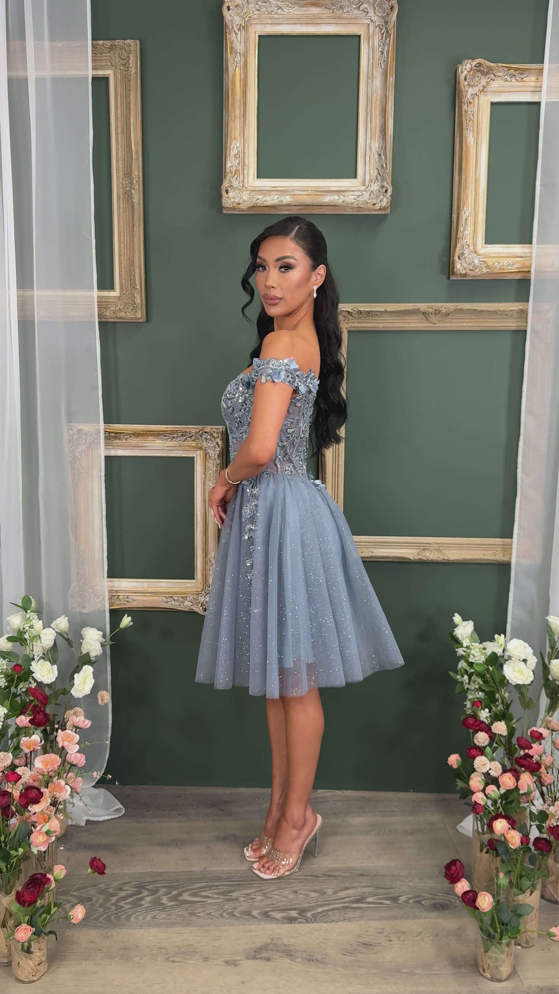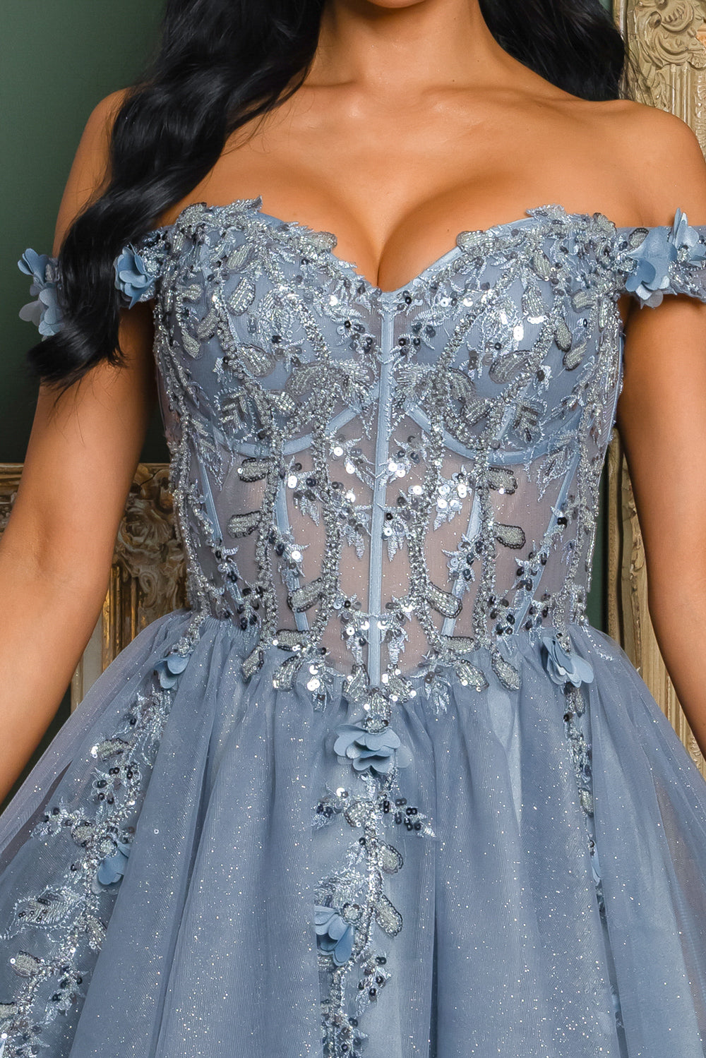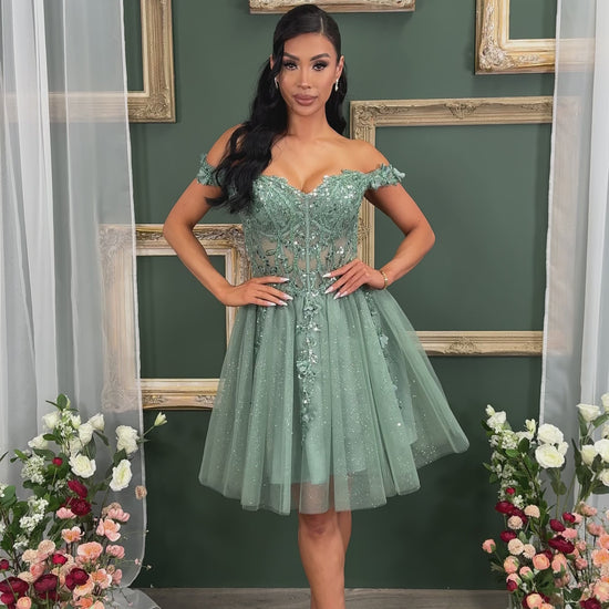 Short off the shoulder embroidered, beaded and sequin dress with bra cups, and back zipper. Skirt on dress has glitter top back of dress has no lining.