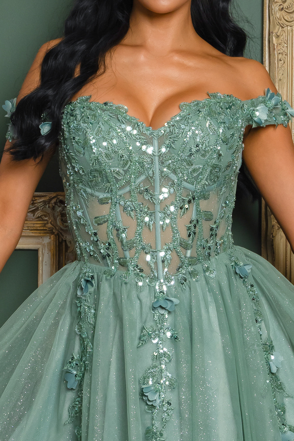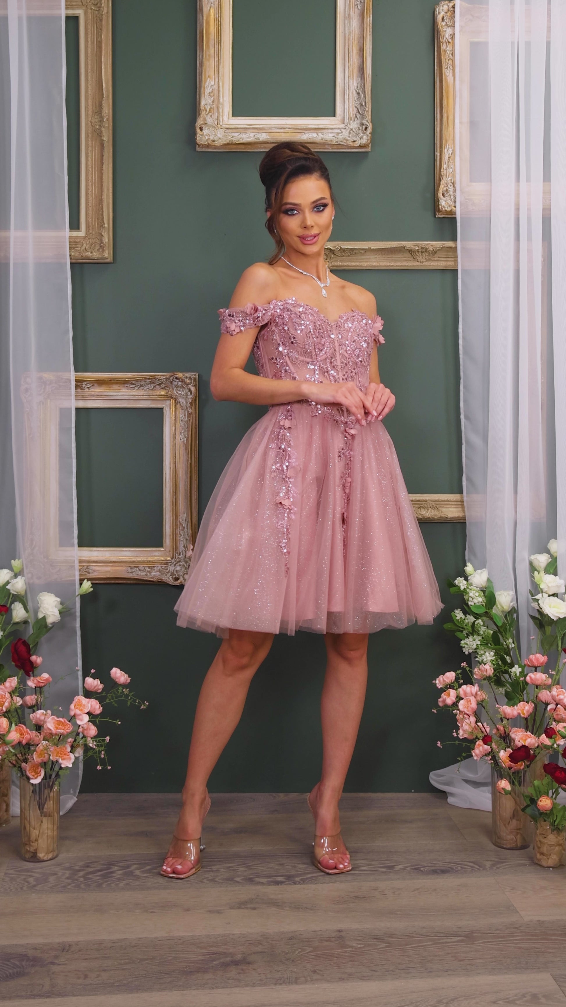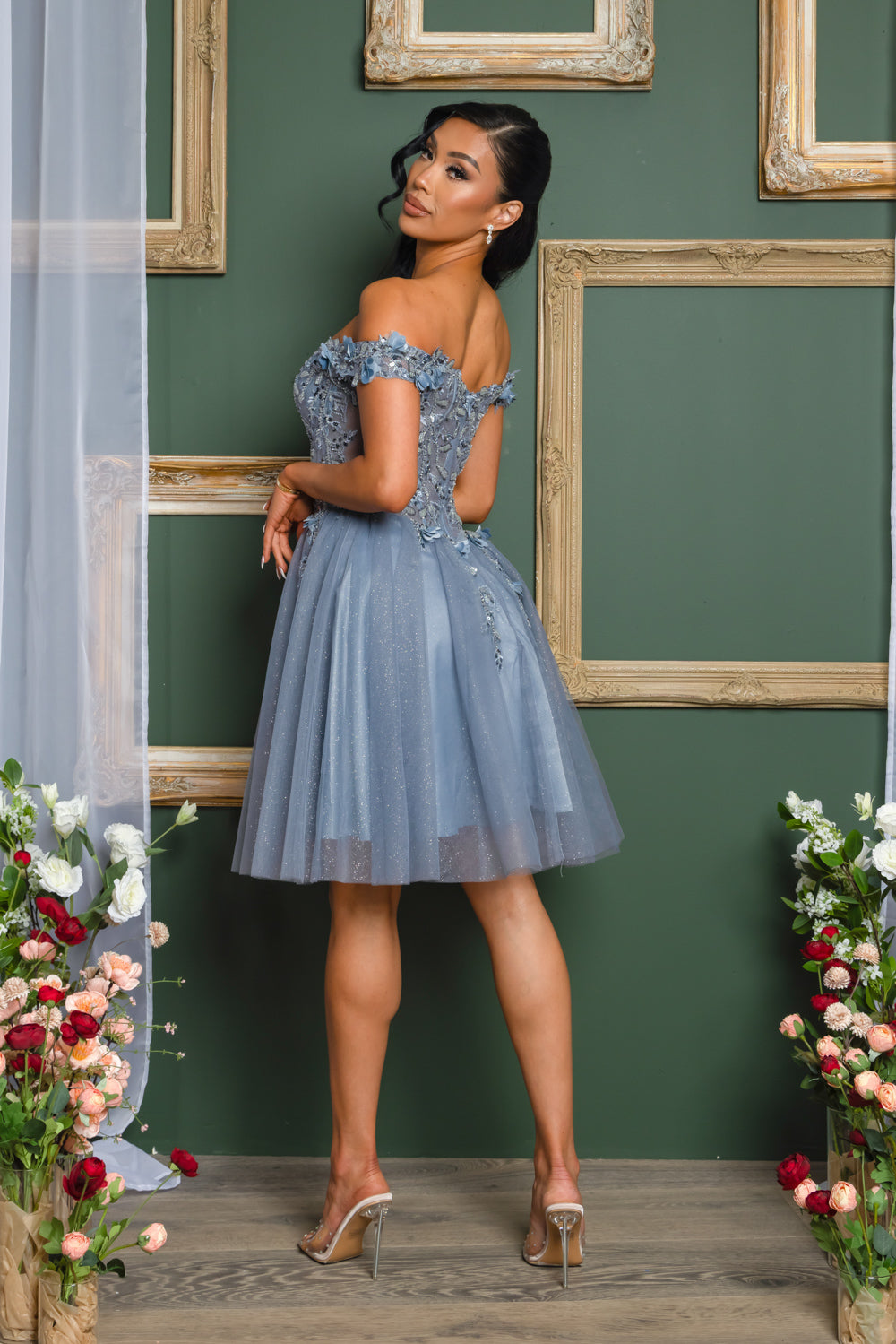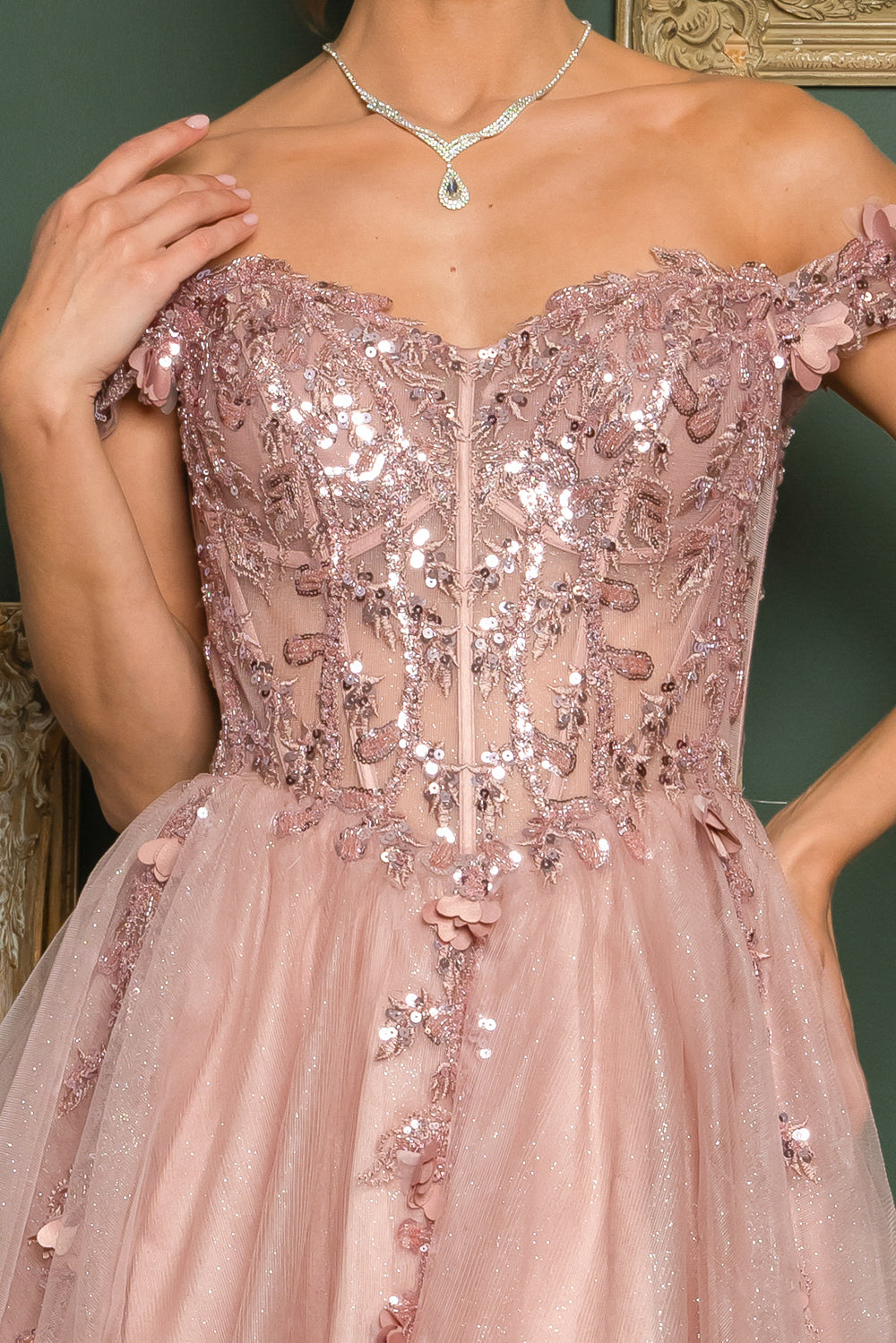 Short off the shoulder embroidered, beaded and sequin dress with bra cups, and back zipper. Skirt on dress has glitter top back of dress has no lining.