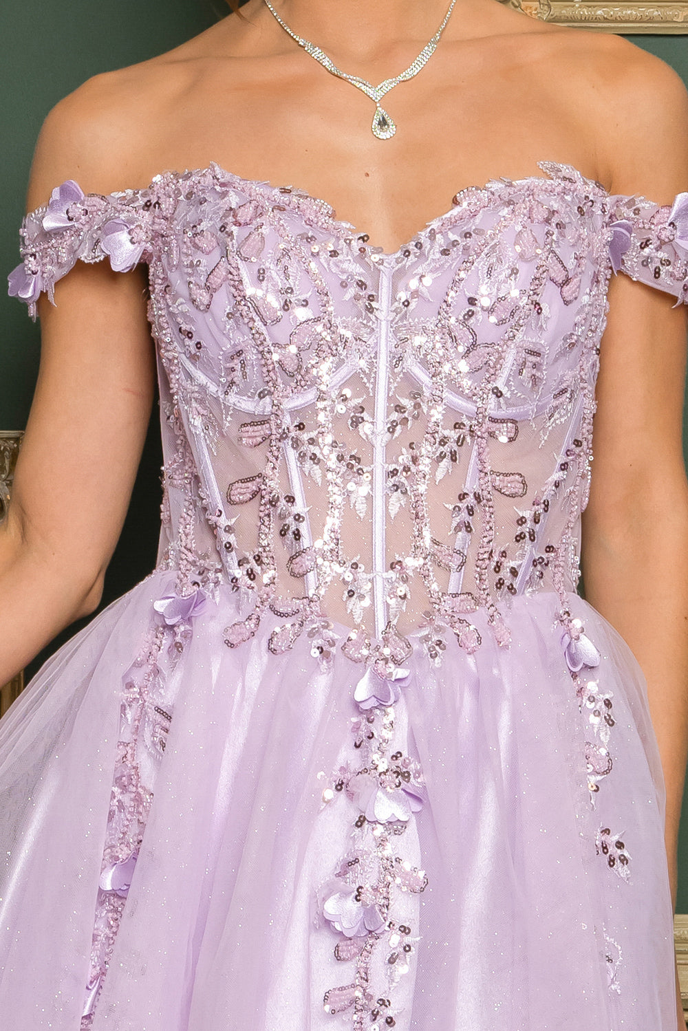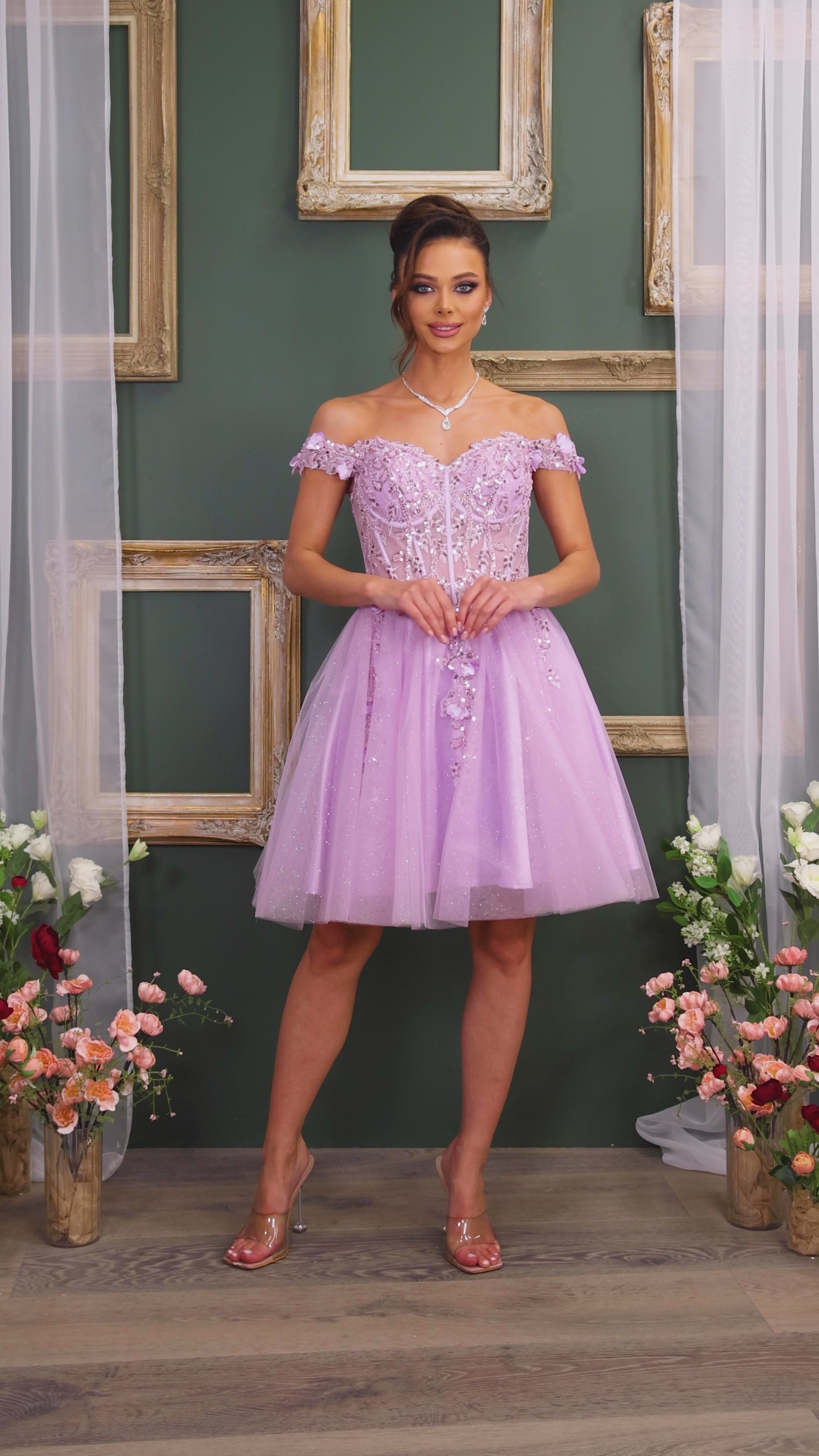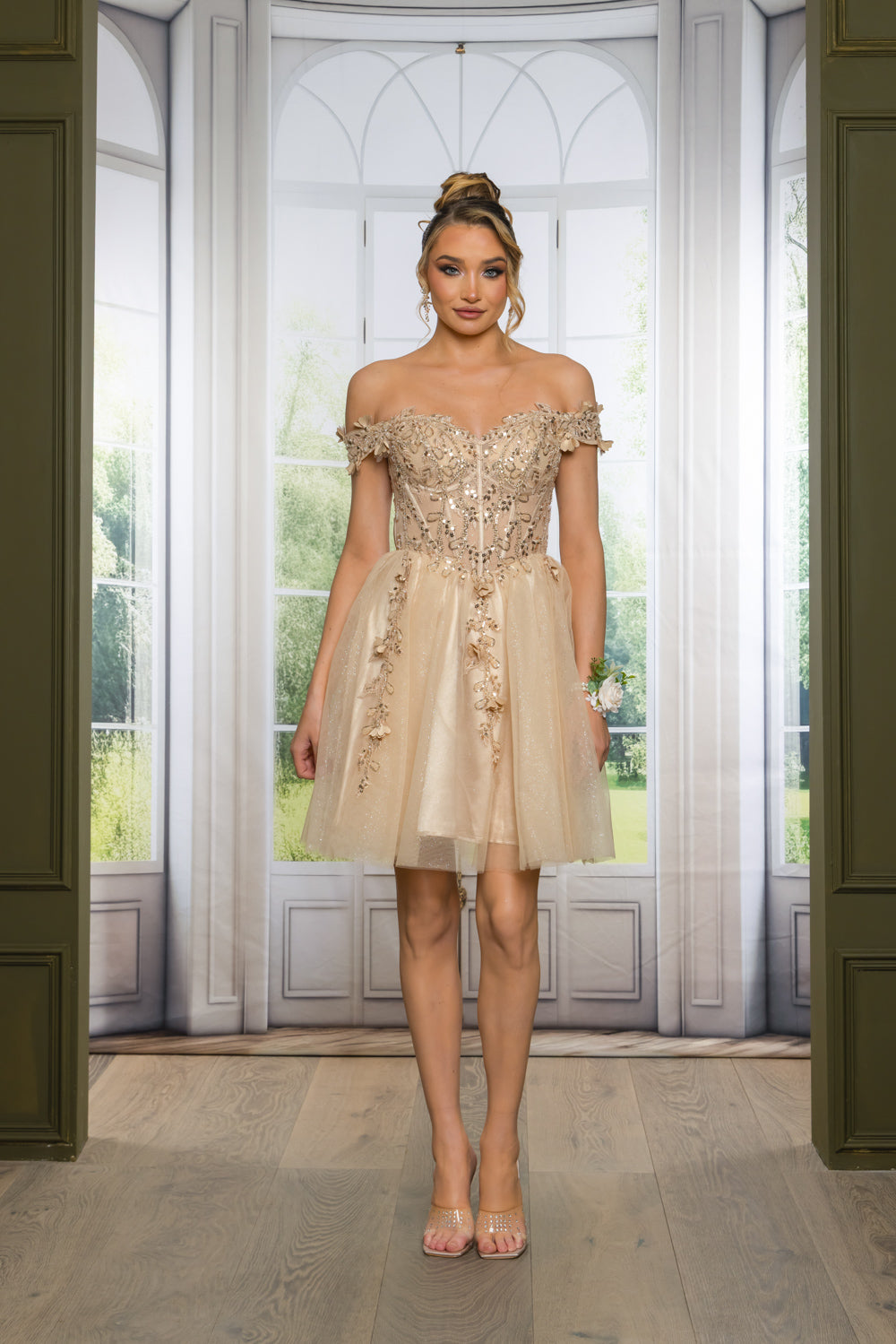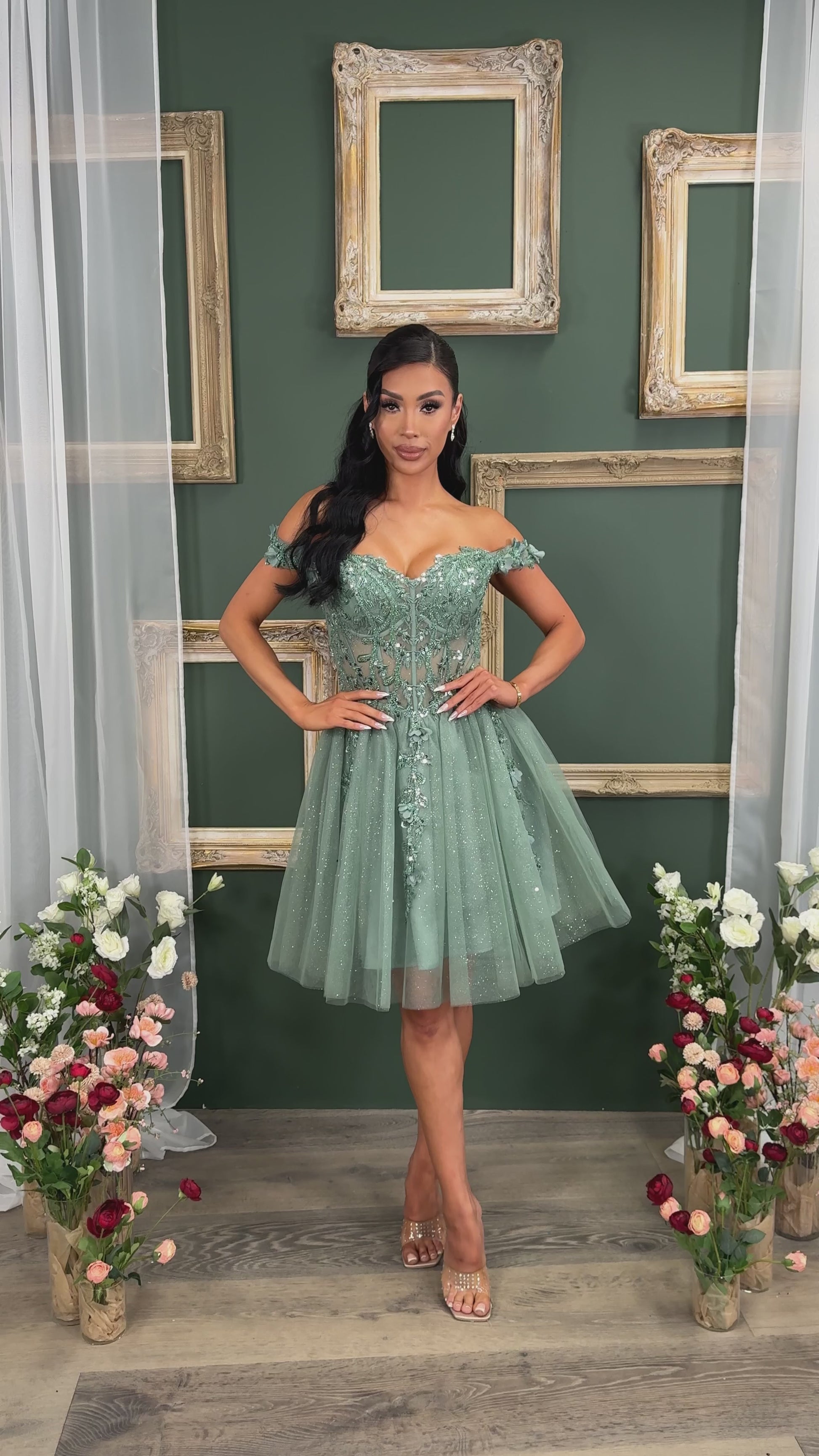 Short off the shoulder embroidered, beaded and sequin dress with bra cups, and back zipper. Skirt on dress has glitter top back of dress has no lining.