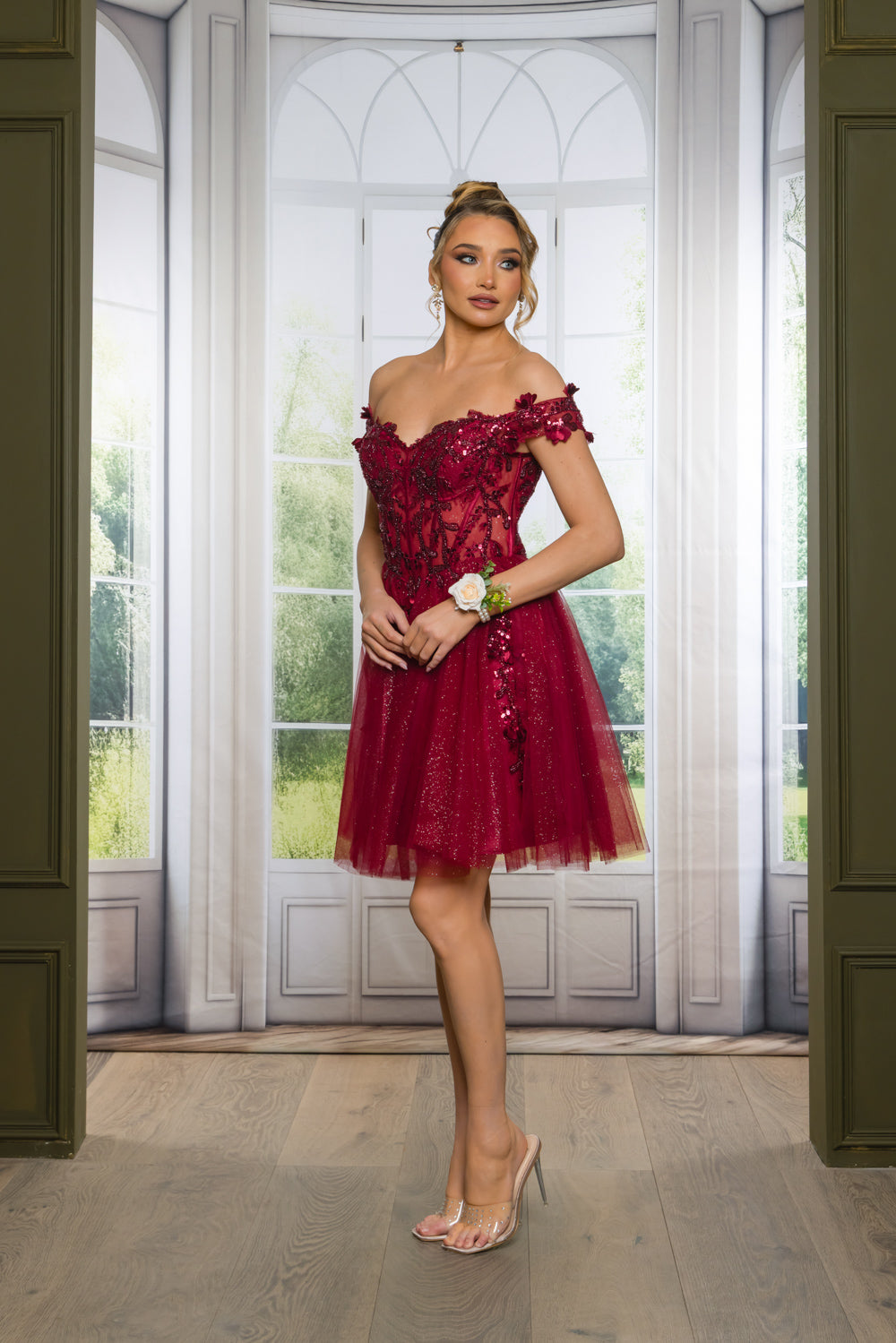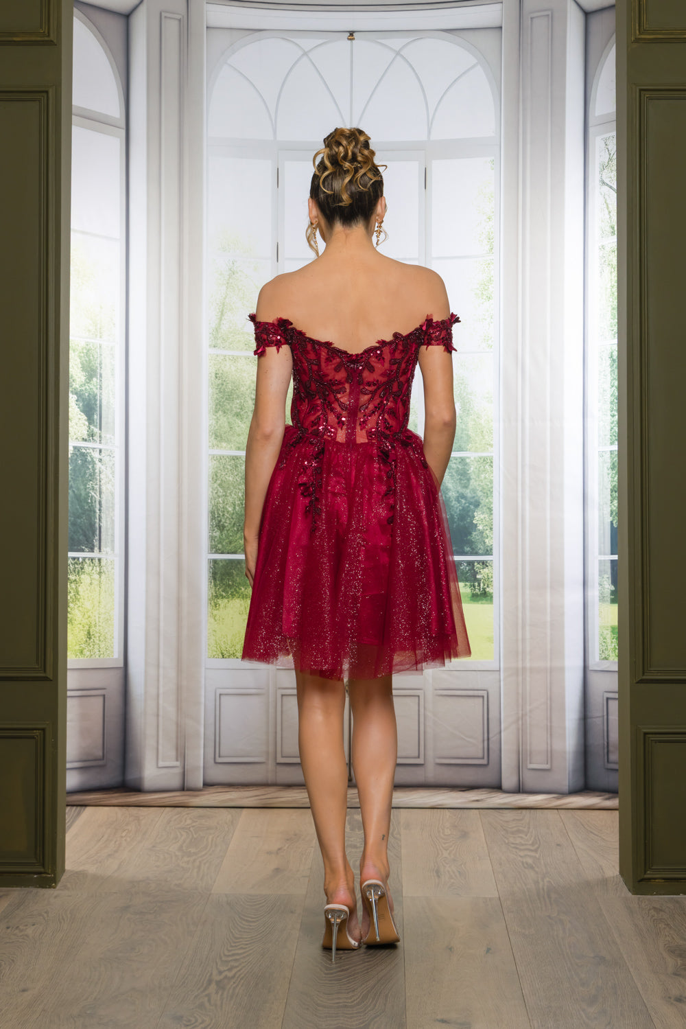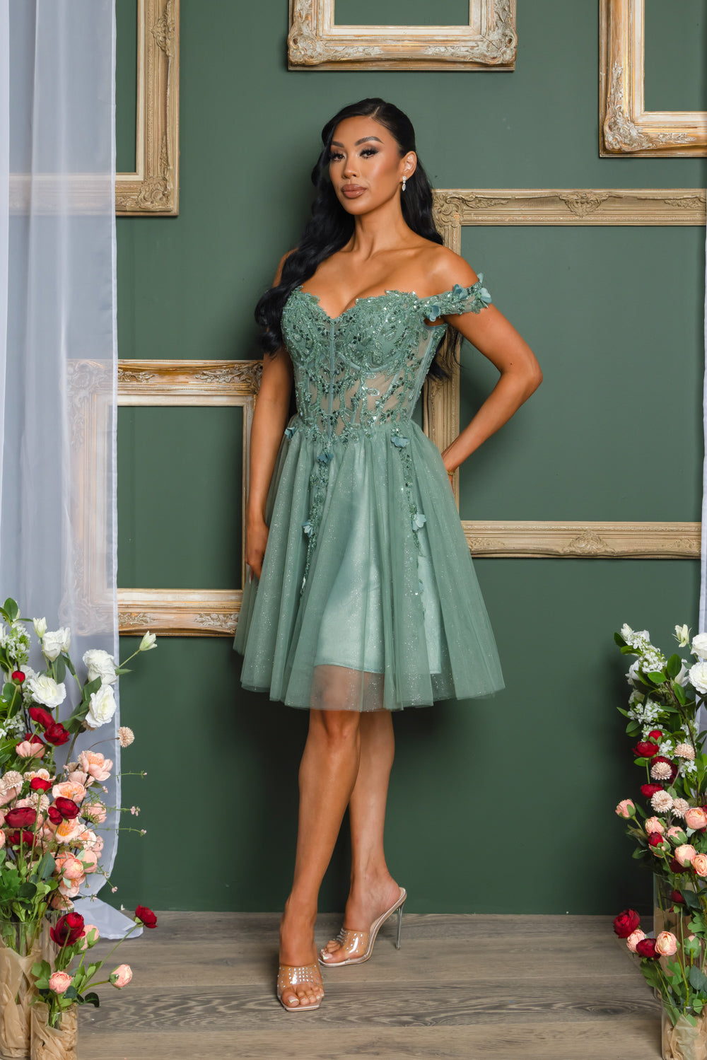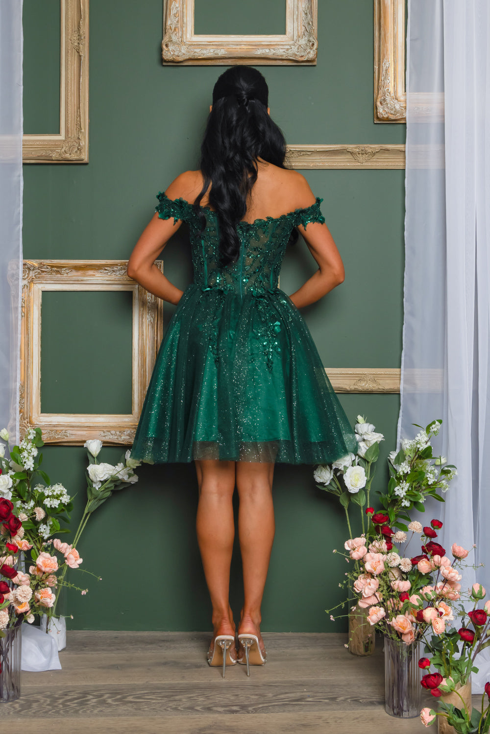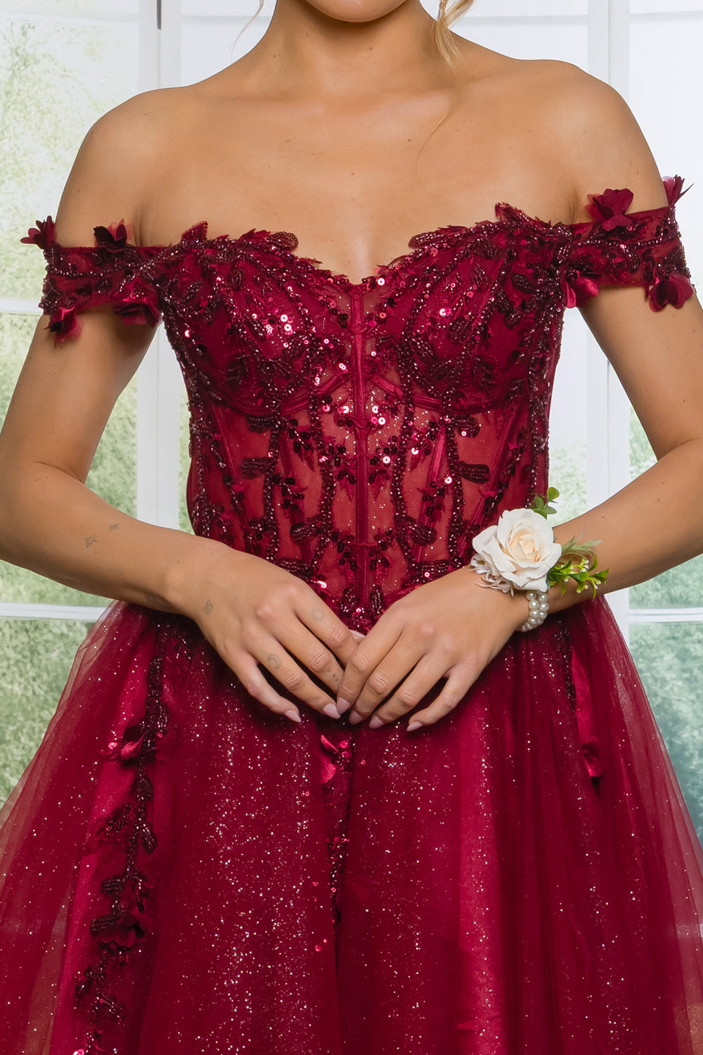 Short off the shoulder embroidered, beaded and sequin dress with bra cups, and back zipper. Skirt on dress has glitter top back of dress has no lining.