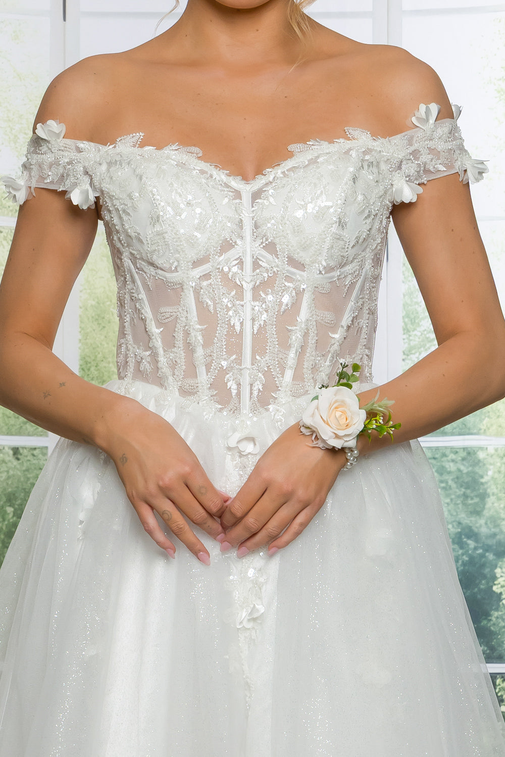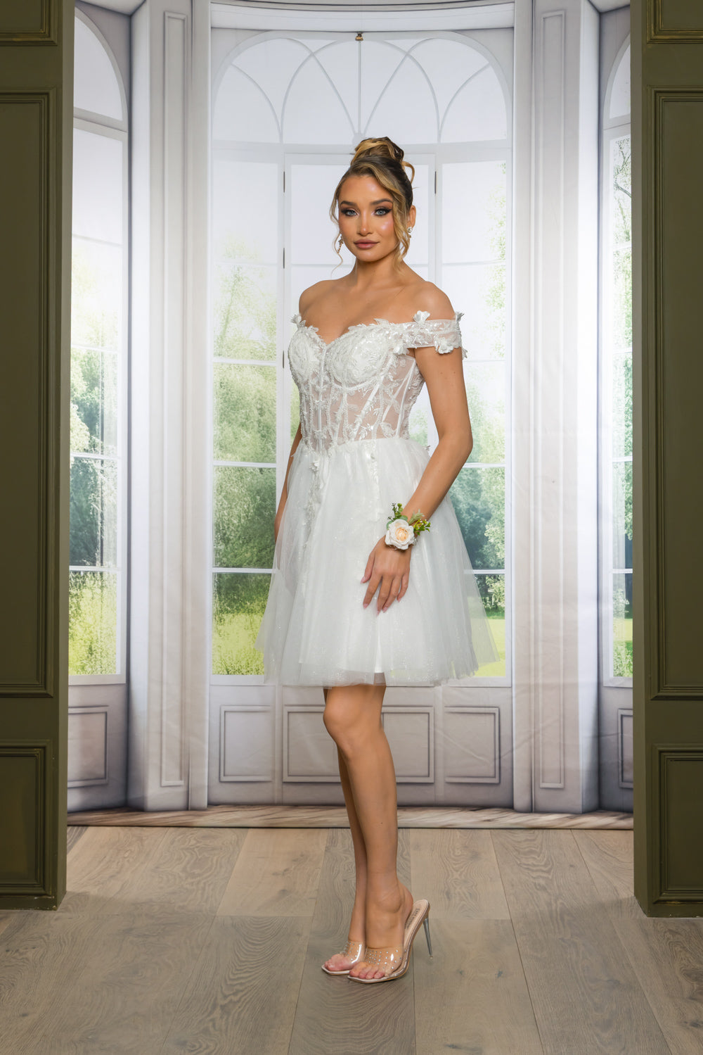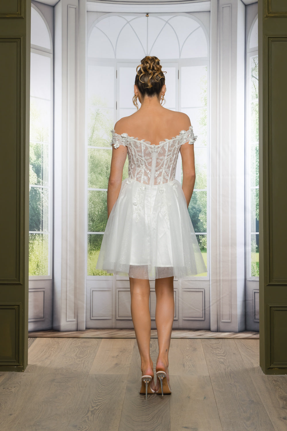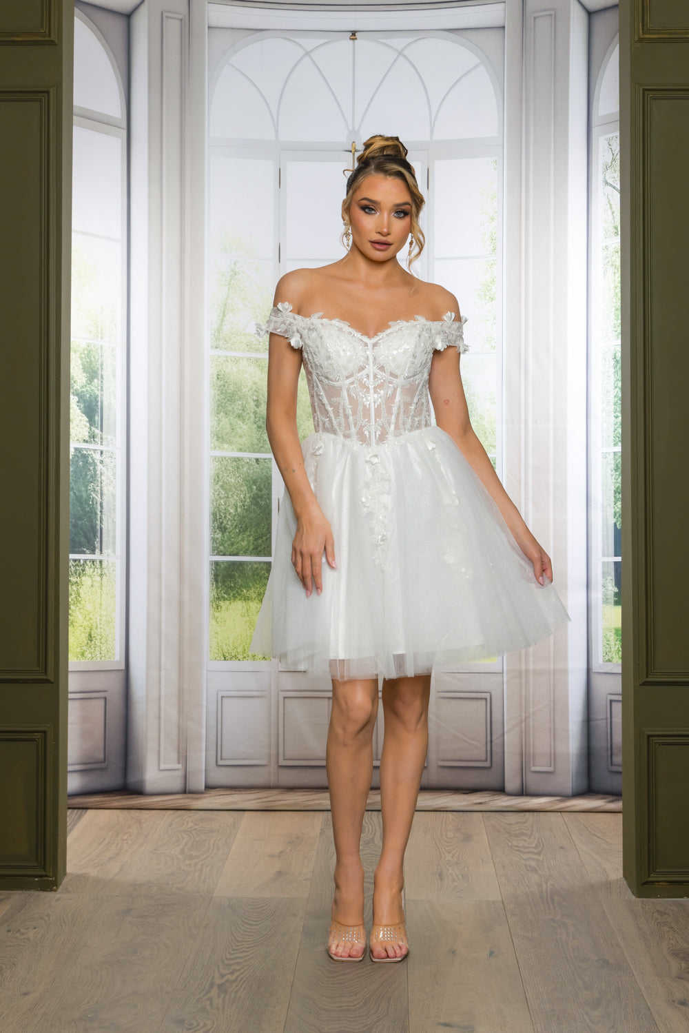 Short off the shoulder embroidered, beaded and sequin dress with bra cups, and back zipper. Skirt on dress has glitter top back of dress has no lining.