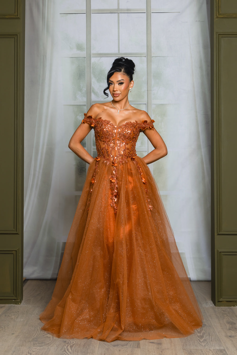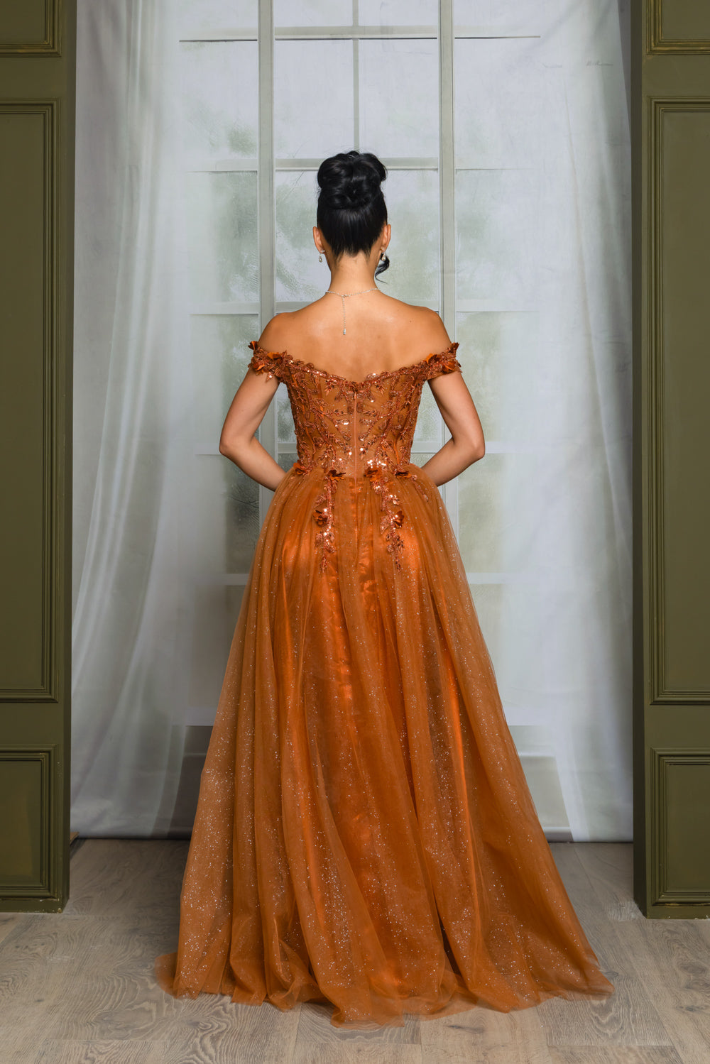 Off the shoulder embroidered, beaded and sequin dress with bra cups, and back zipper. Skirt on dress has glitter top back of dress has no lining.