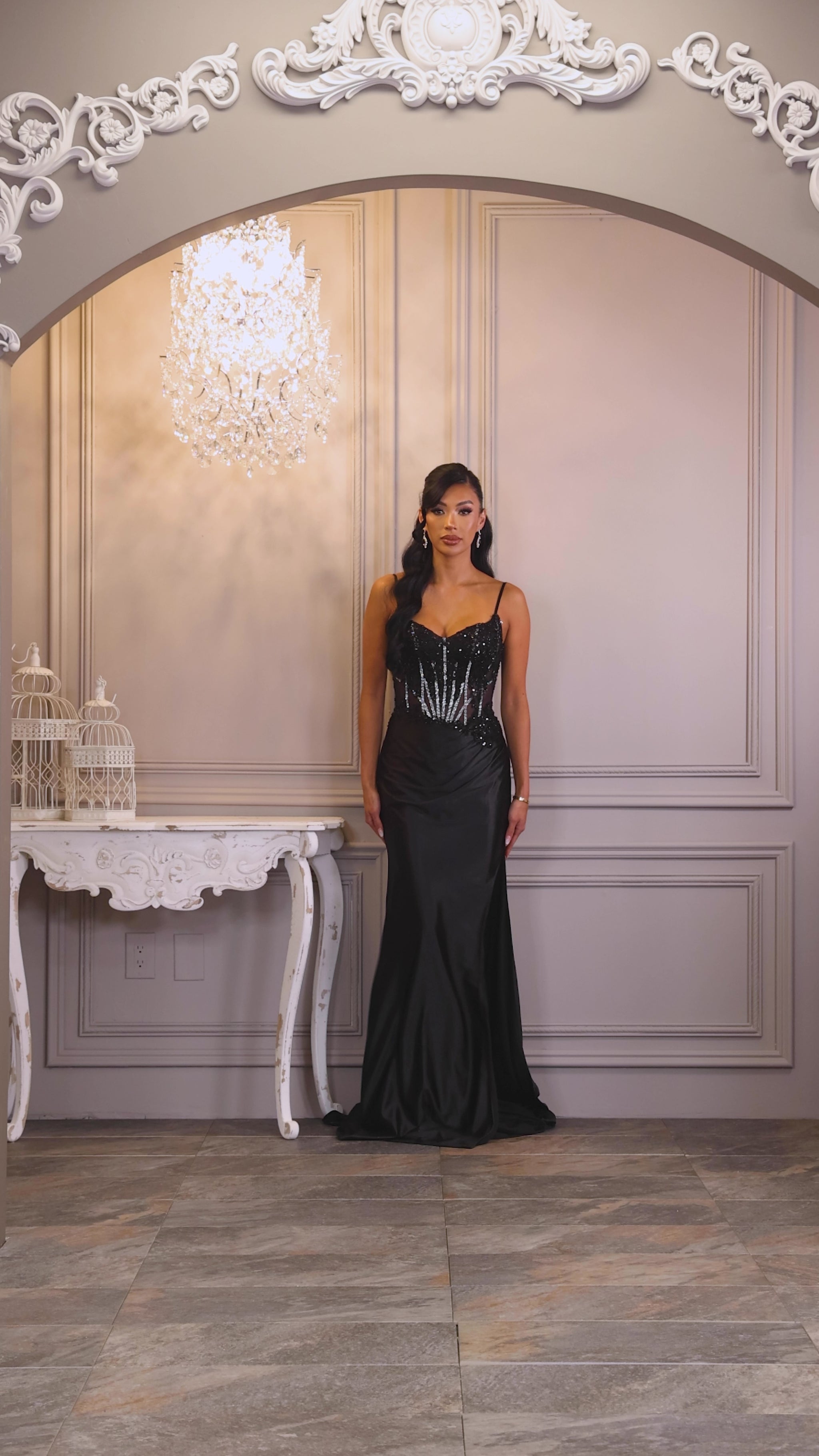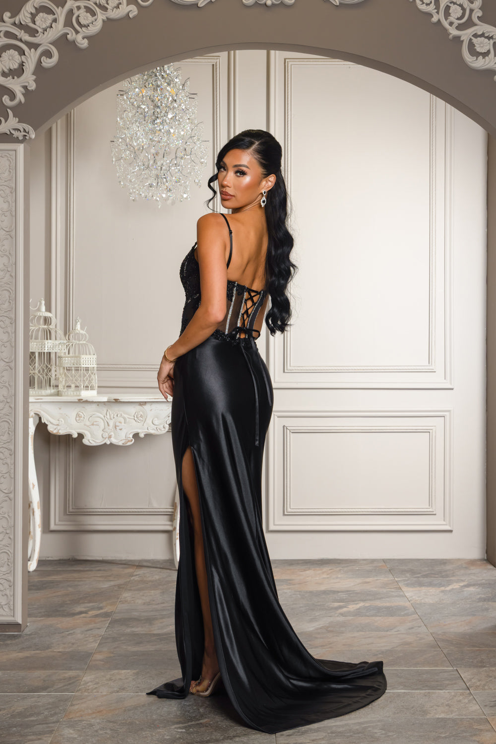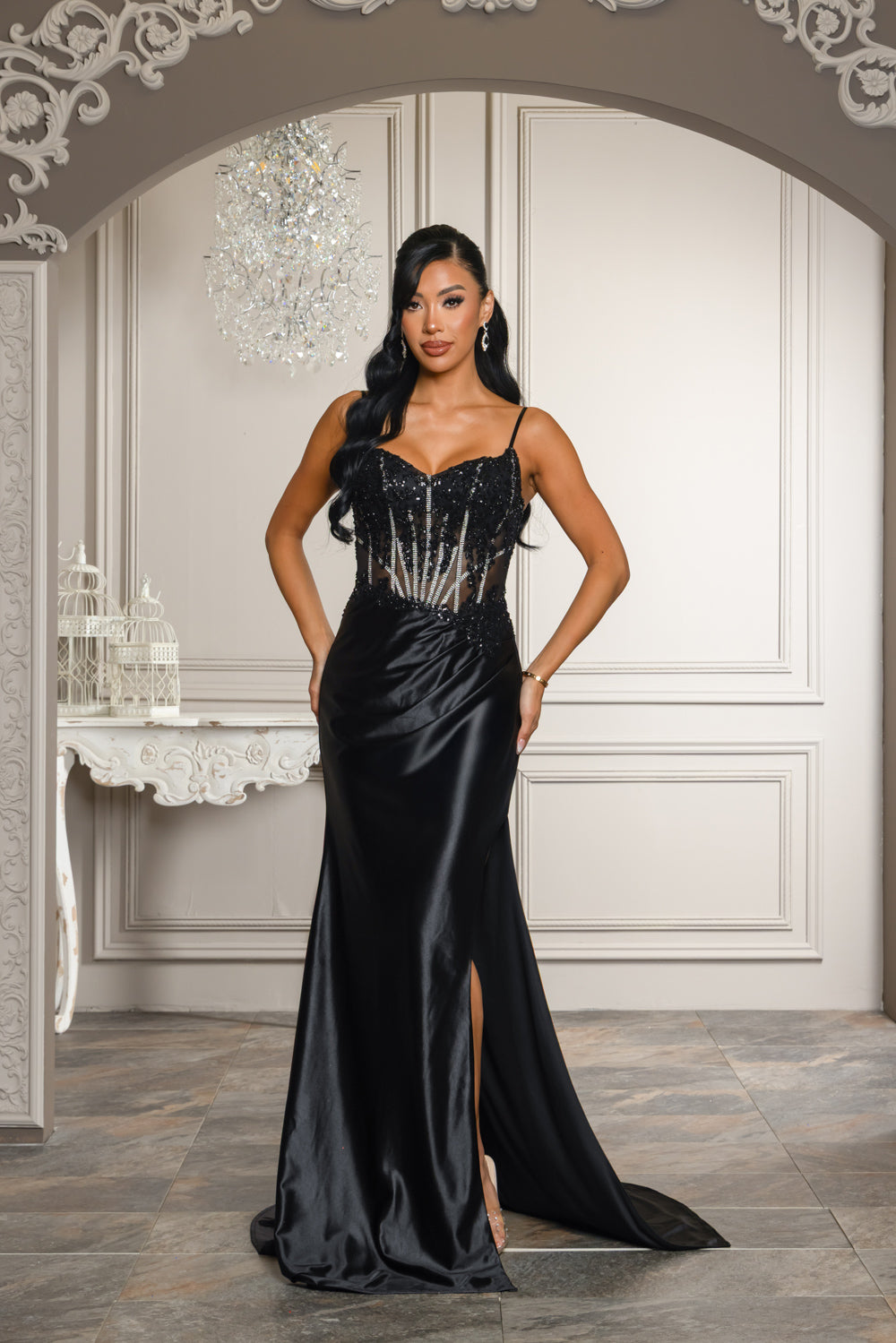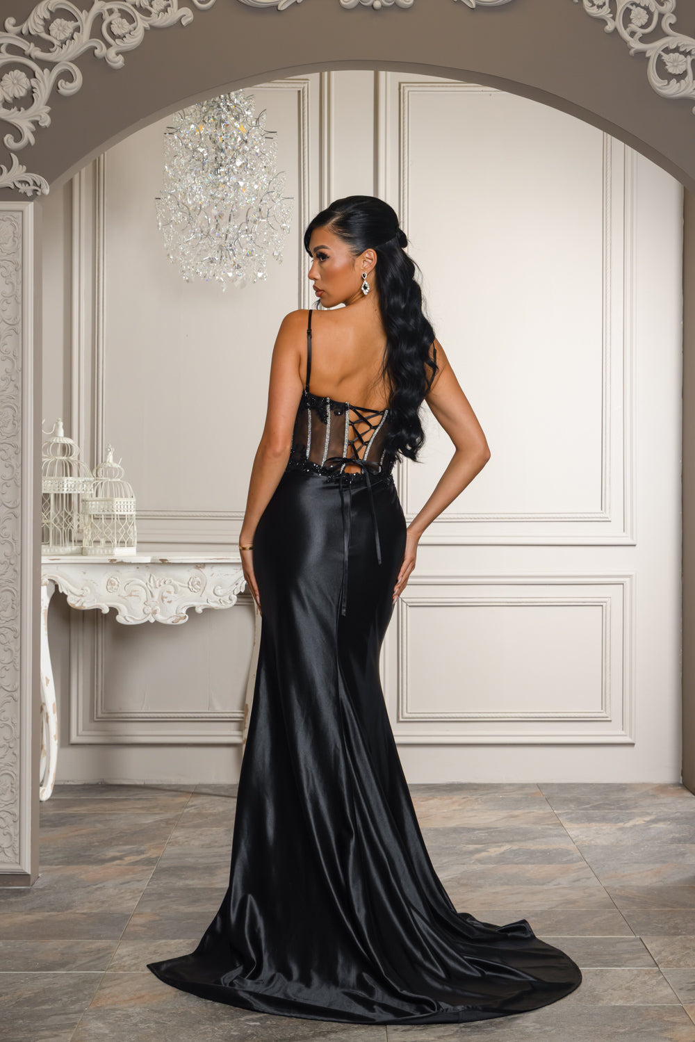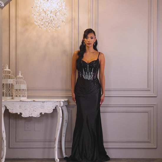 Black with rhinestone and bead detail on tope of dress. Skirt of dress is very stretchy and has a side slit. Dress is lined on skirt, has bra cups, adjustable straps, back zipper and lace up back.