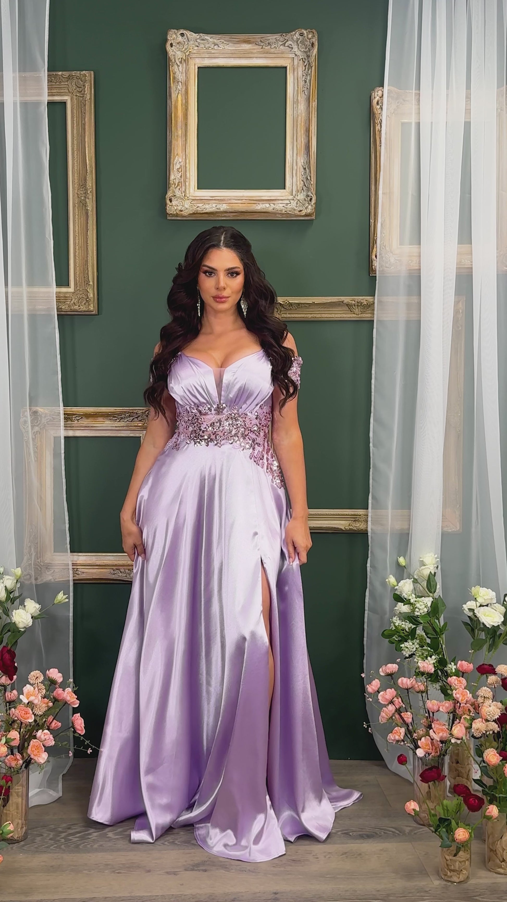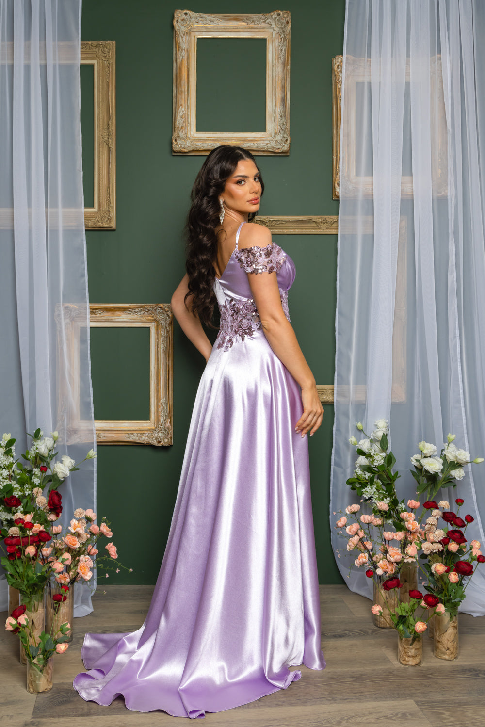 Off shoulder embroidered beaded sequin maxi dress with satin A-lined skirt, bra cups, and back zipper.