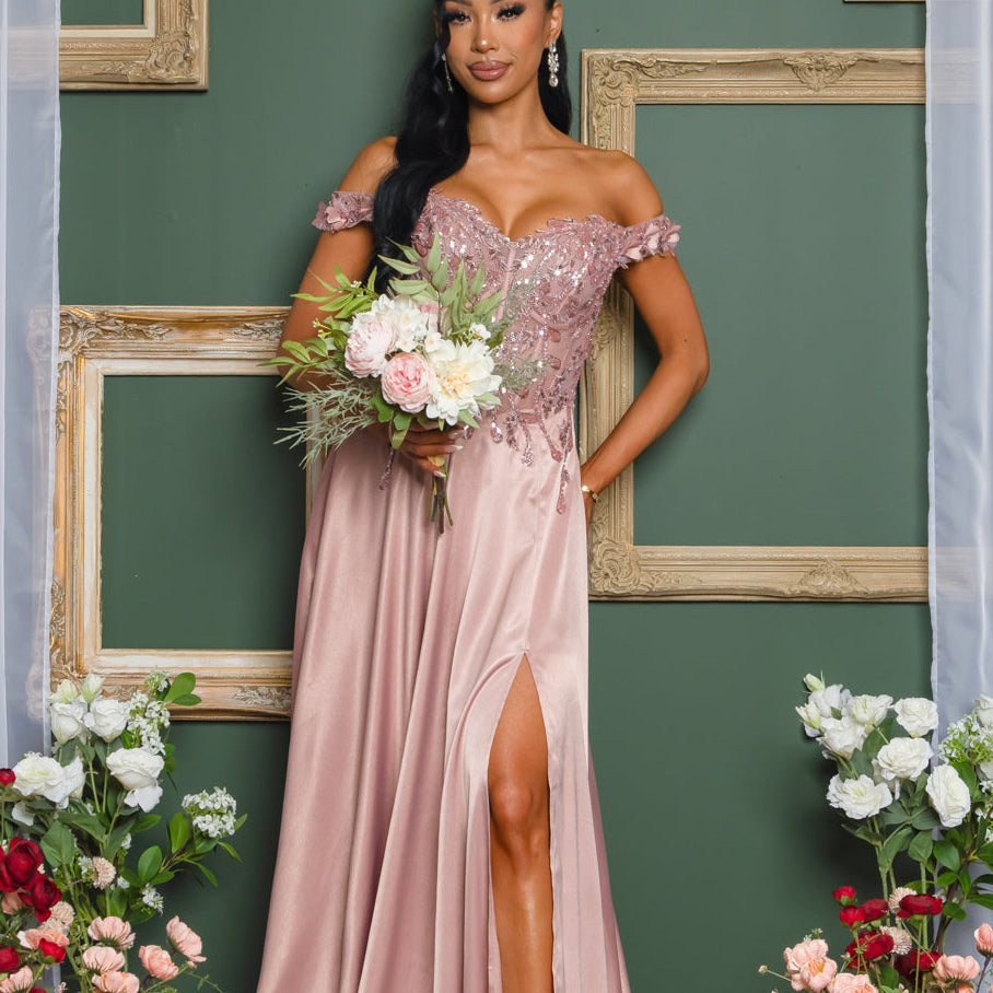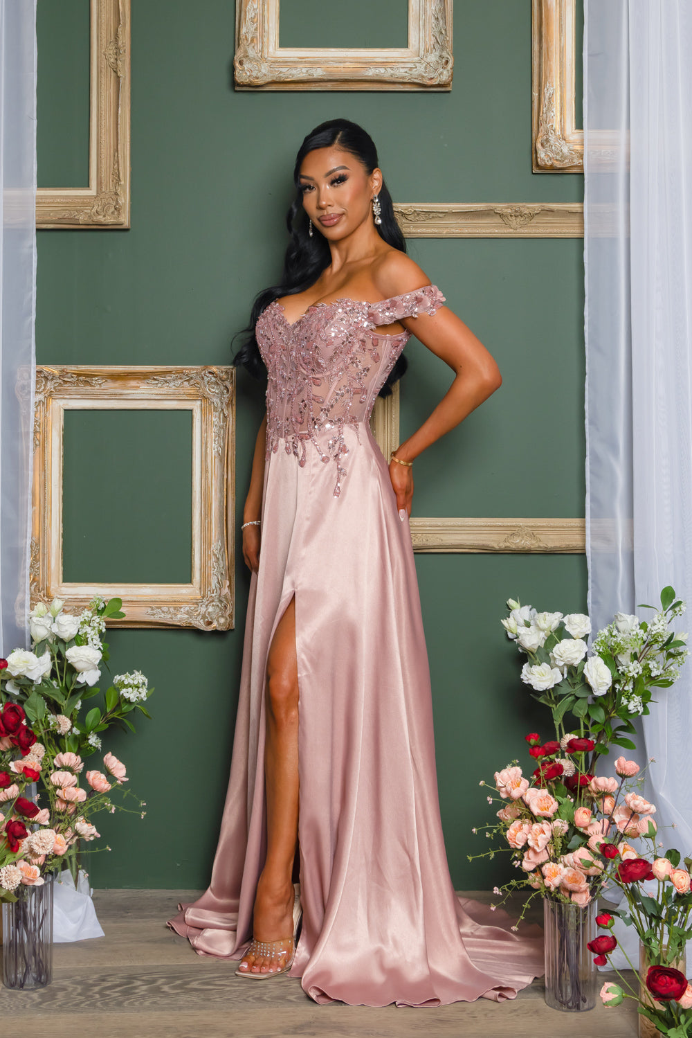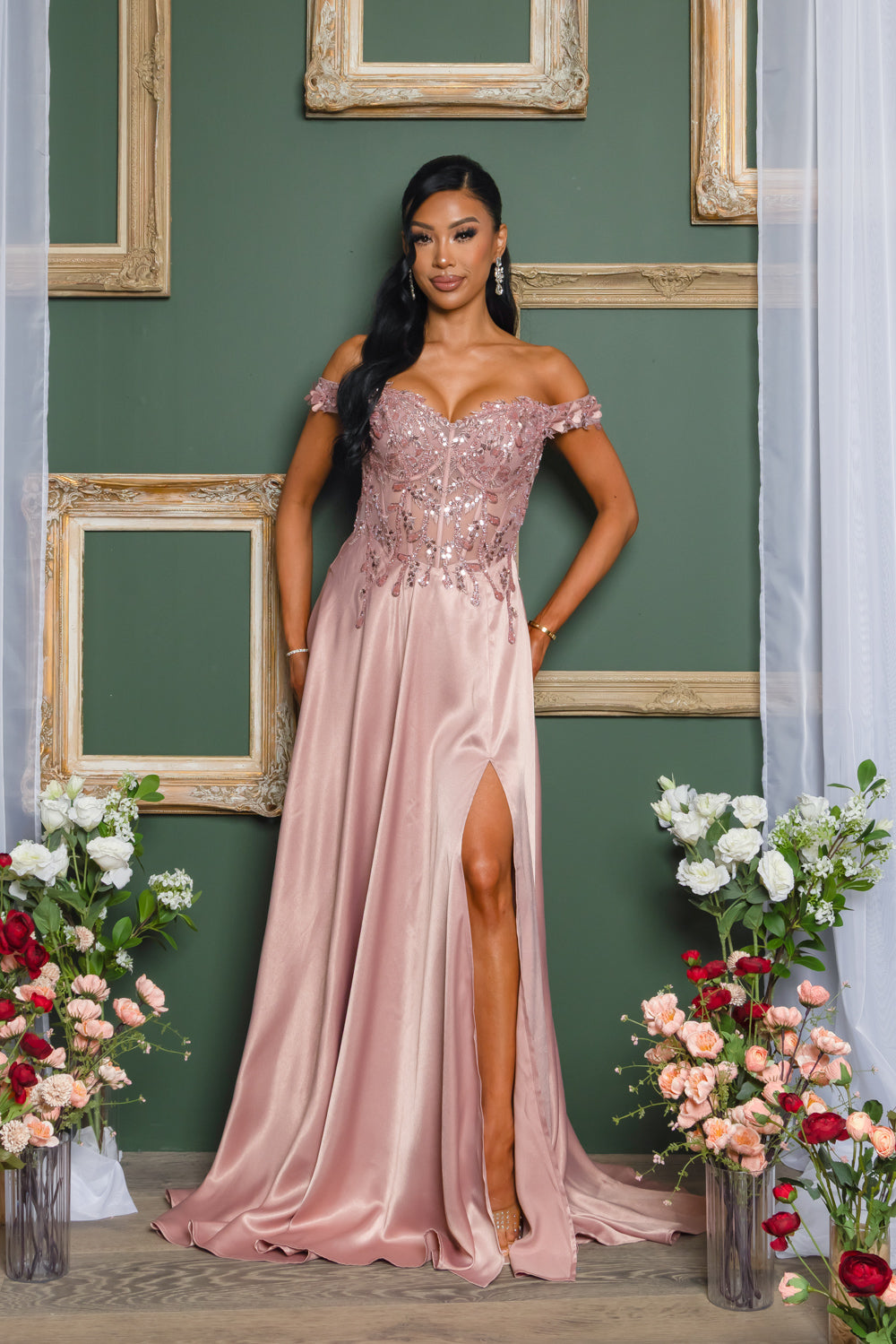 Off shoulder A-line embroidered beaded sequin maxi dress with satin mermaid skirt, bra cups, and back zipper. SKIRT HAS NO LINING BUT IS NOT TRASPARENT