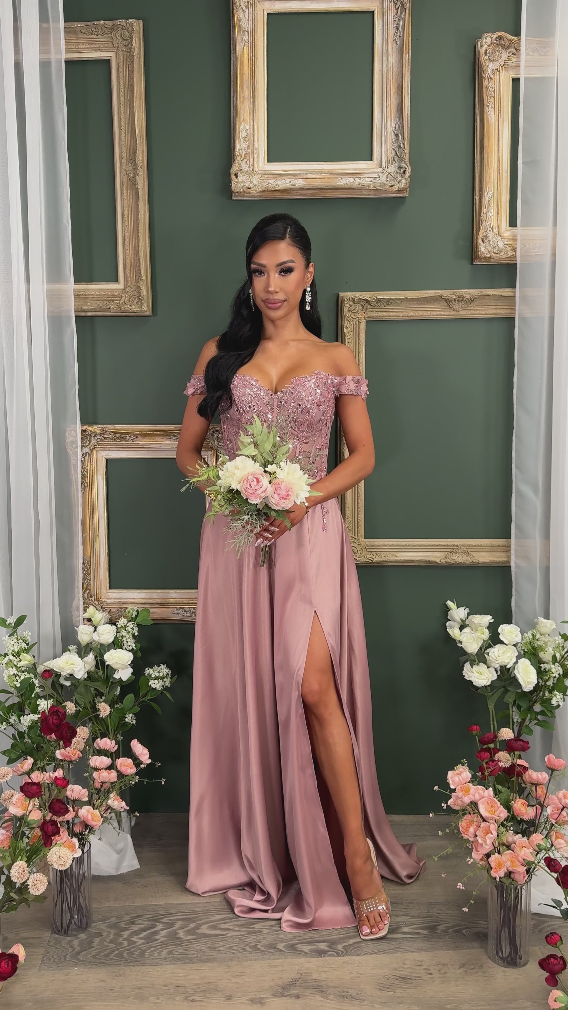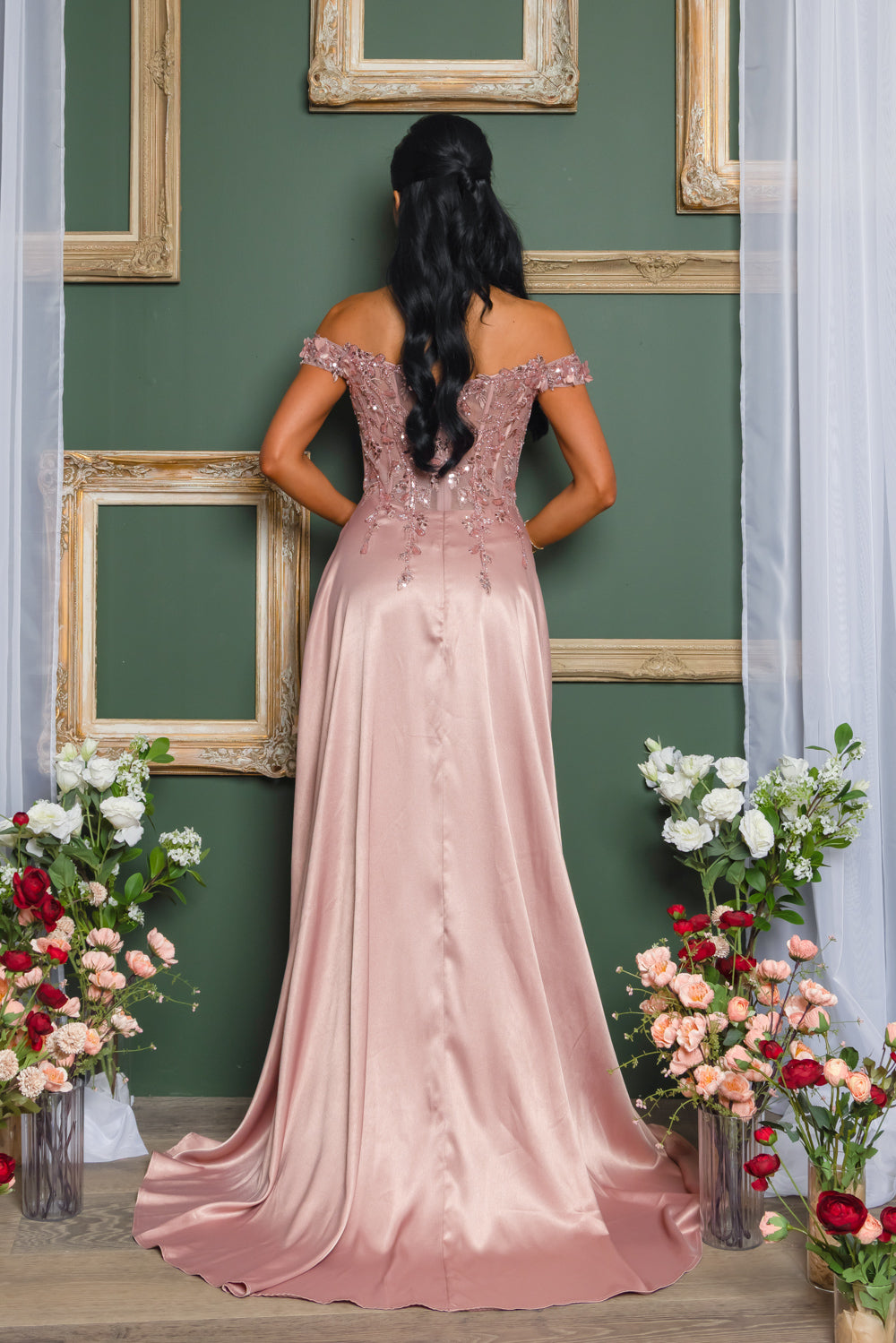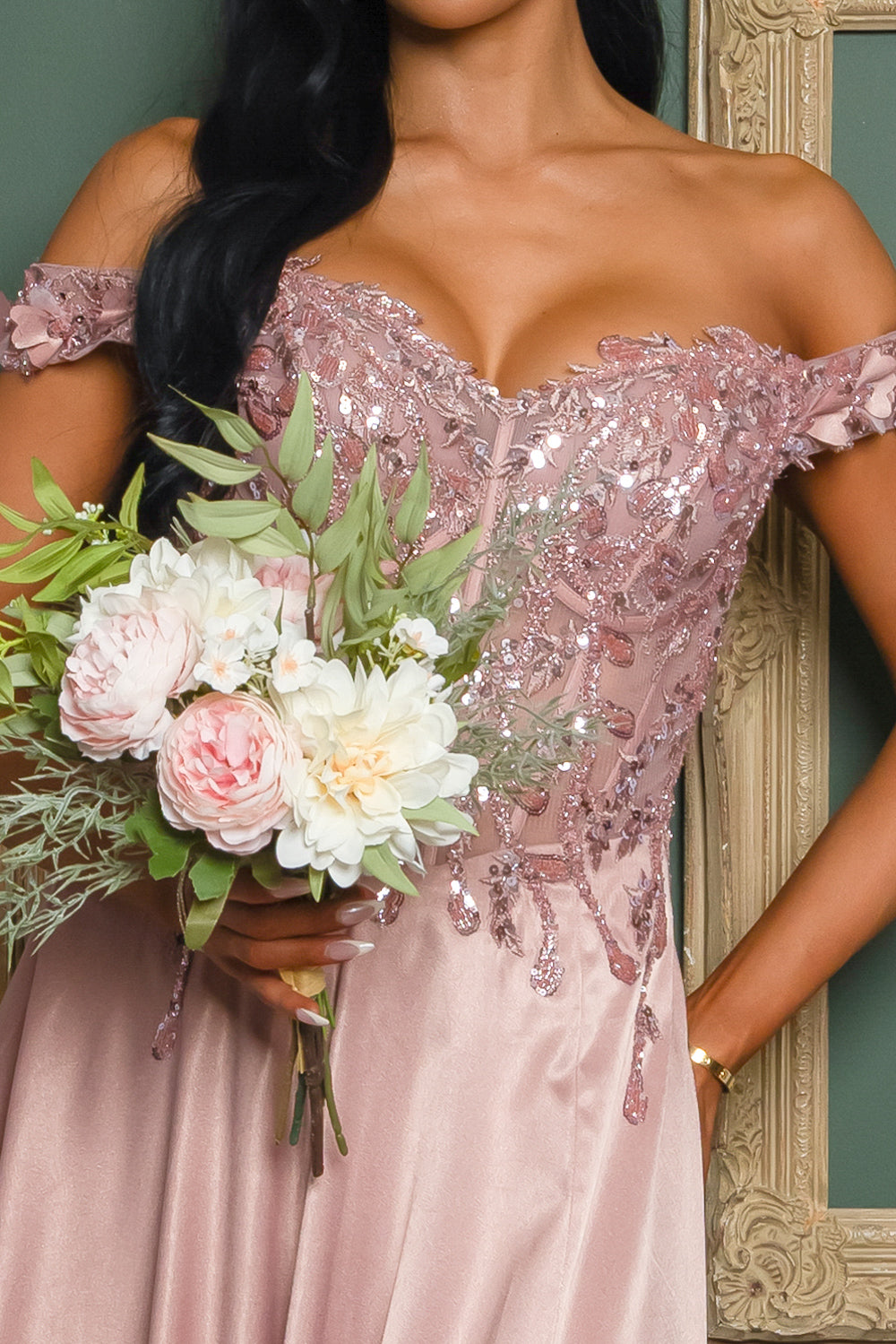 Off shoulder A-line embroidered beaded sequin maxi dress with satin mermaid skirt, bra cups, and back zipper. SKIRT HAS NO LINING BUT IS NOT TRASPARENT