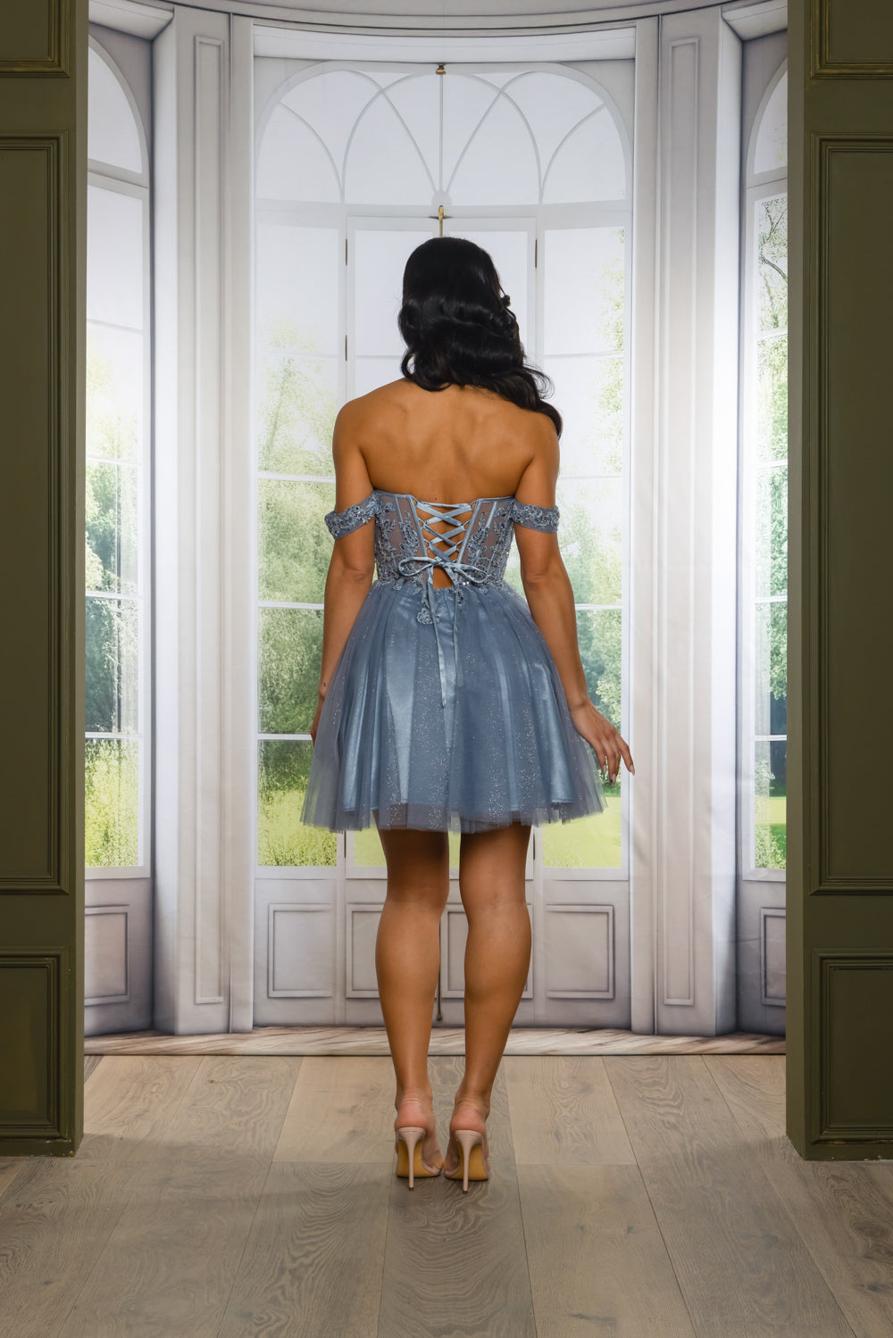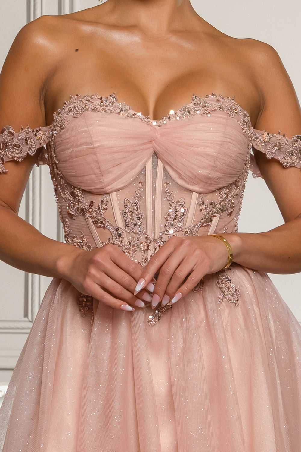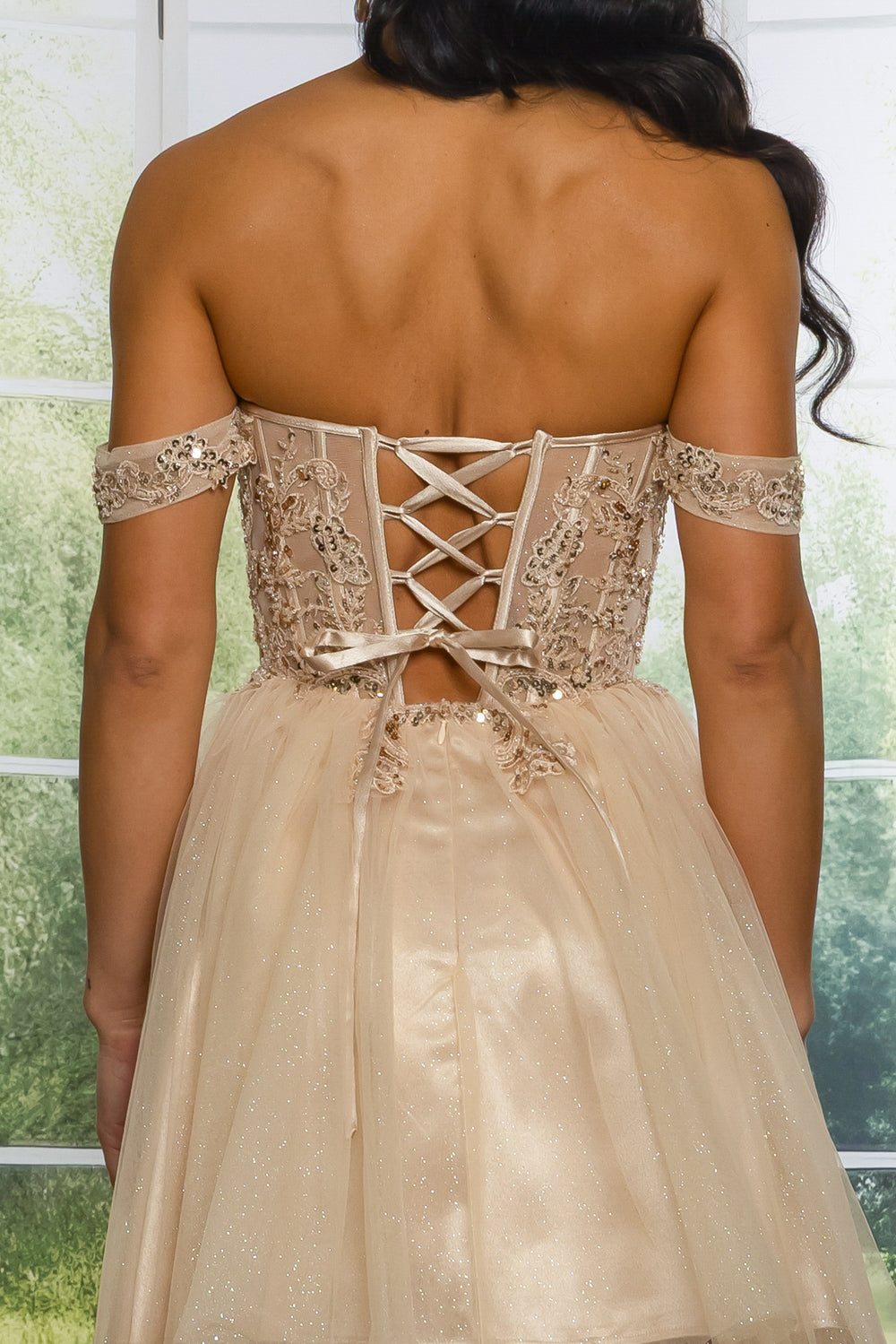 Off the shoulder short dress with sequins, beads and embroidery details. With bra cups, lace up back and back zipper.