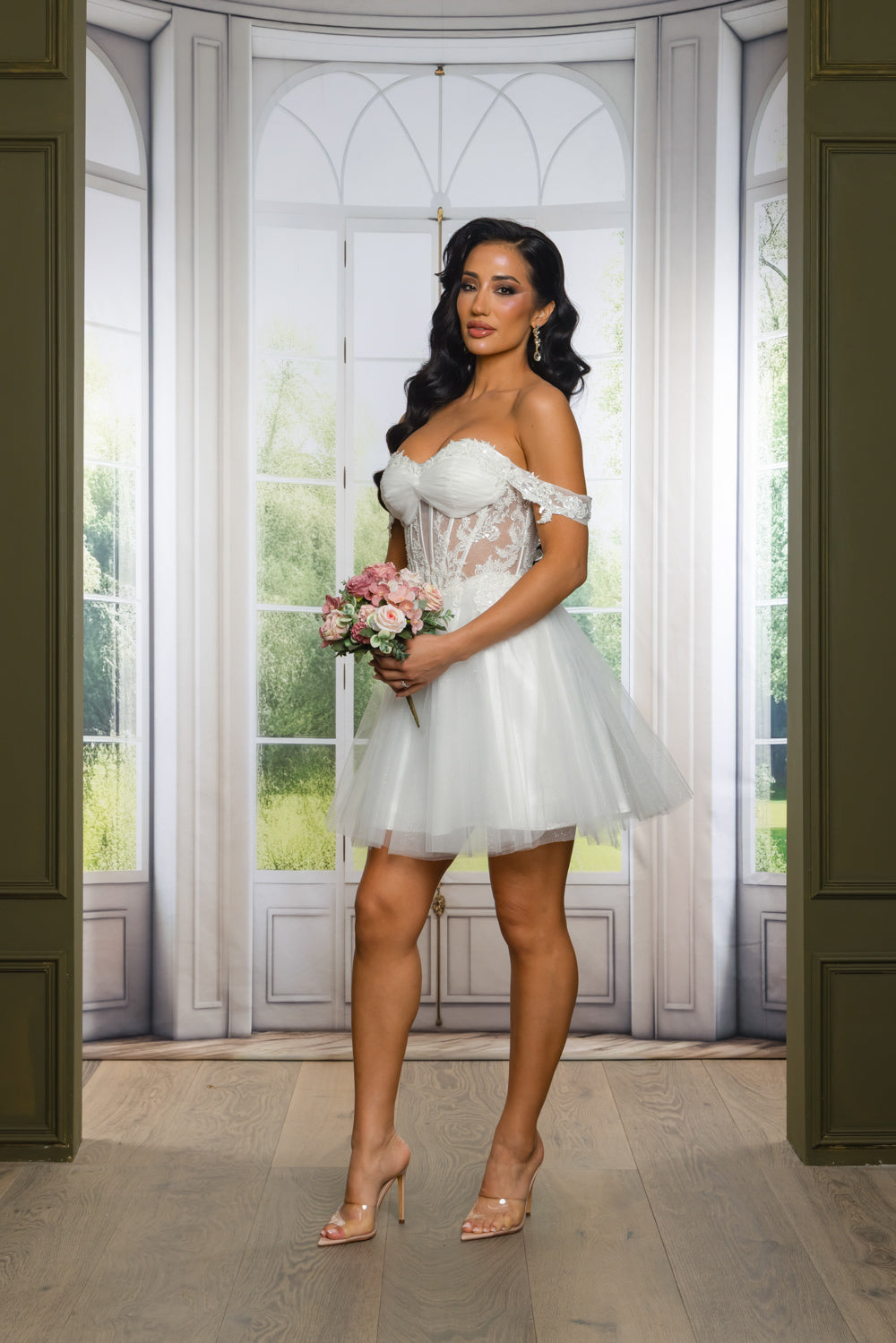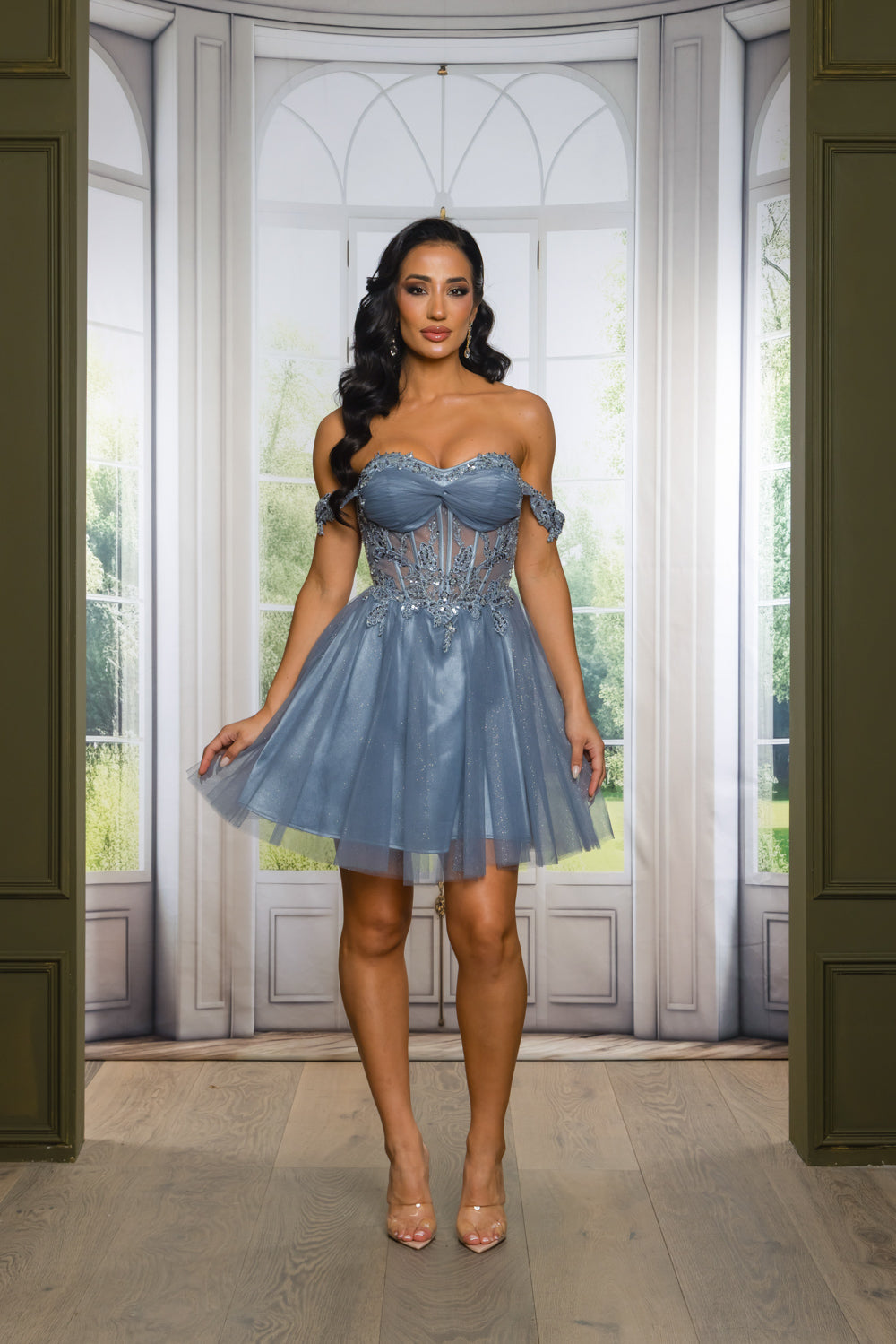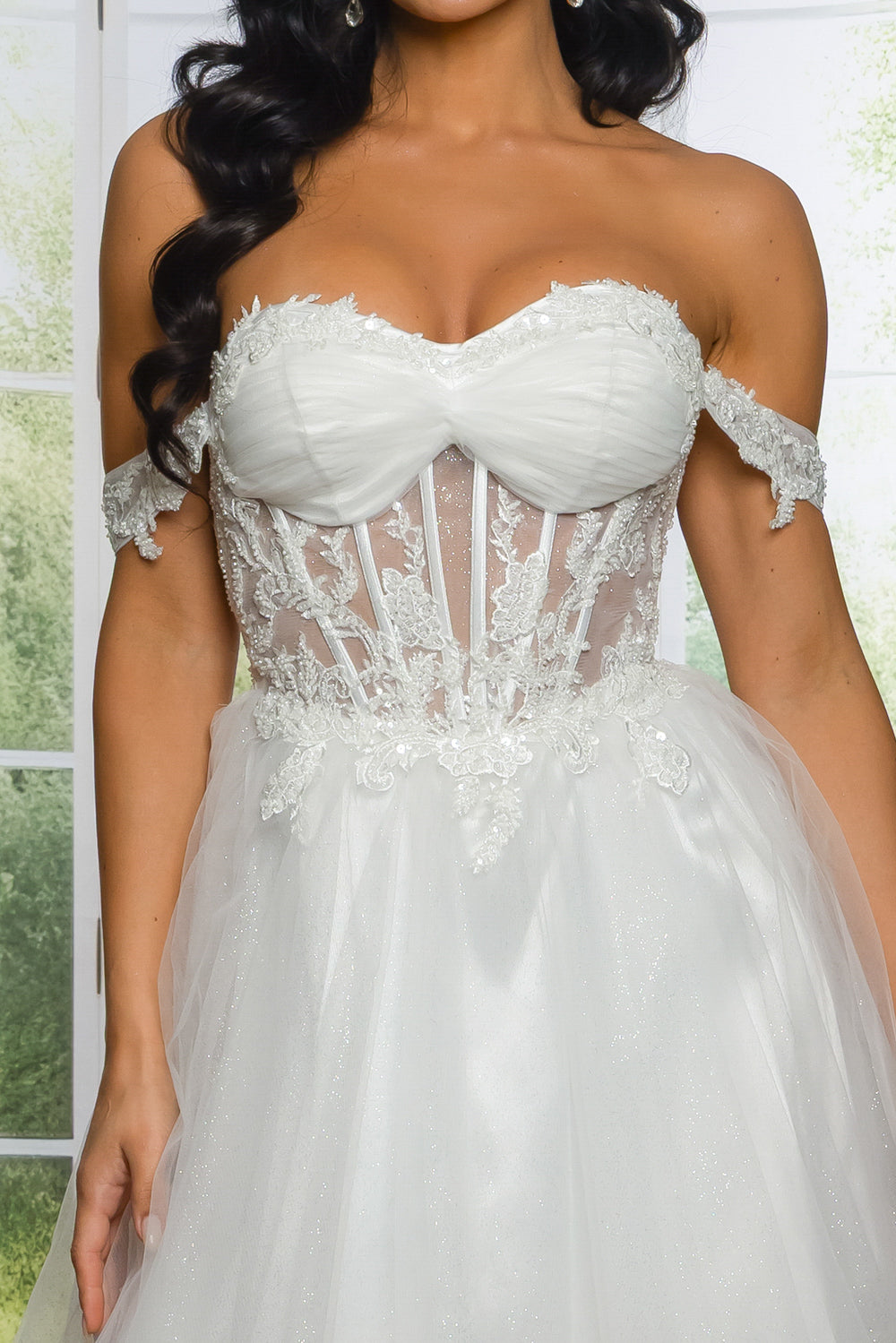 Off the shoulder short dress with sequins, beads and embroidery details. With bra cups, lace up back and back zipper.