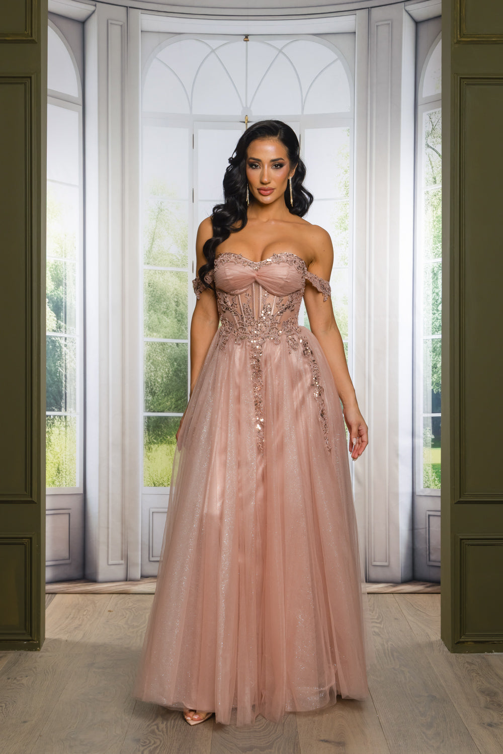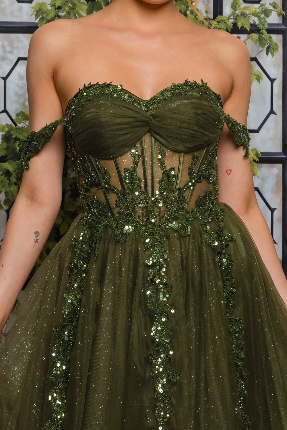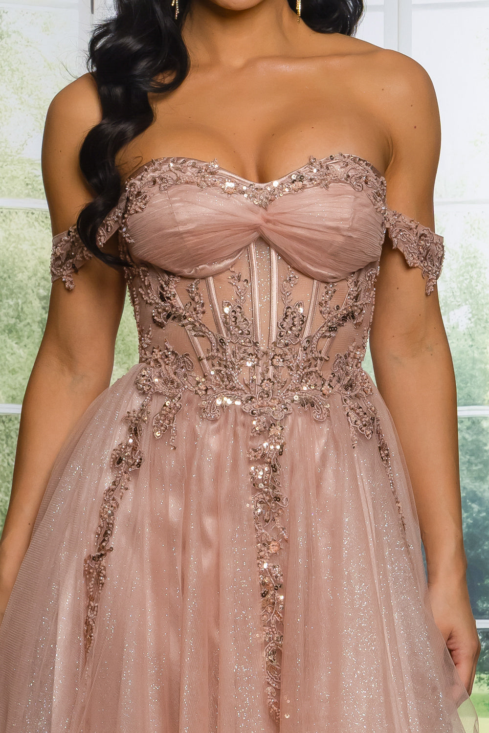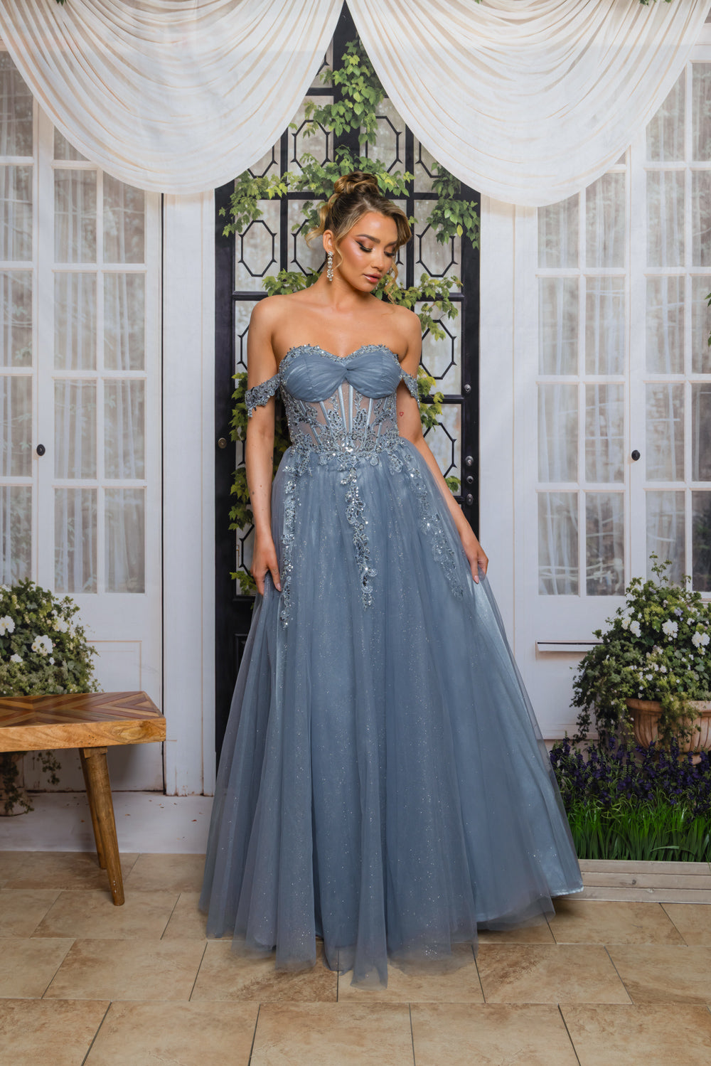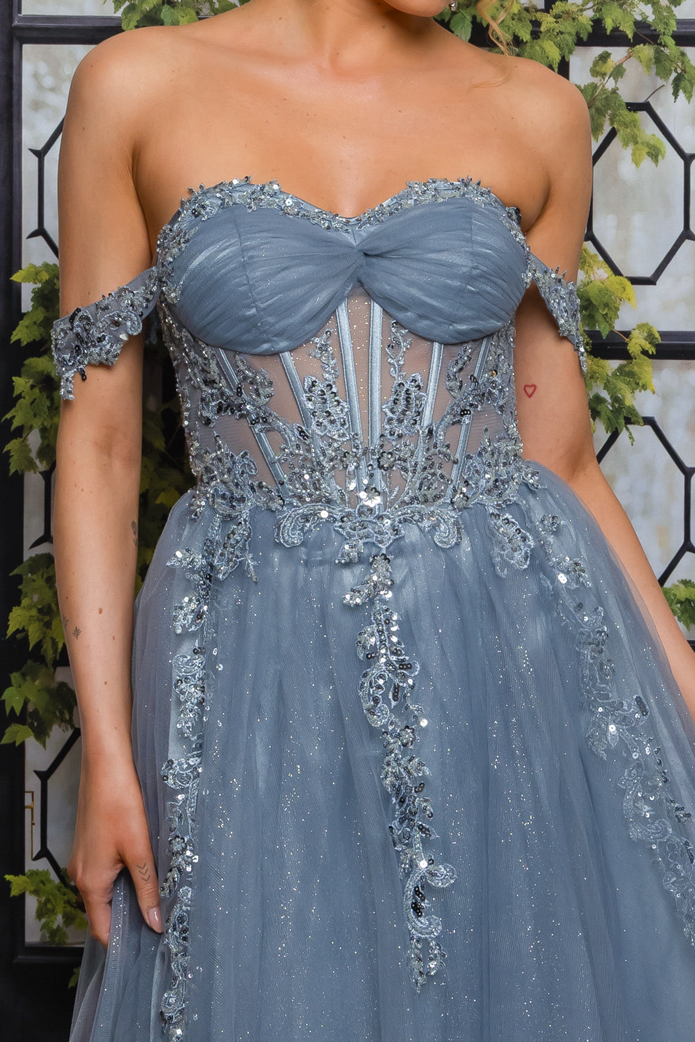 Off shoulder prom maxi dress with floral embroidery, beading and sequin details. Dress is fully lined, has bra cups, boning on waist with a lace up back and zipper.