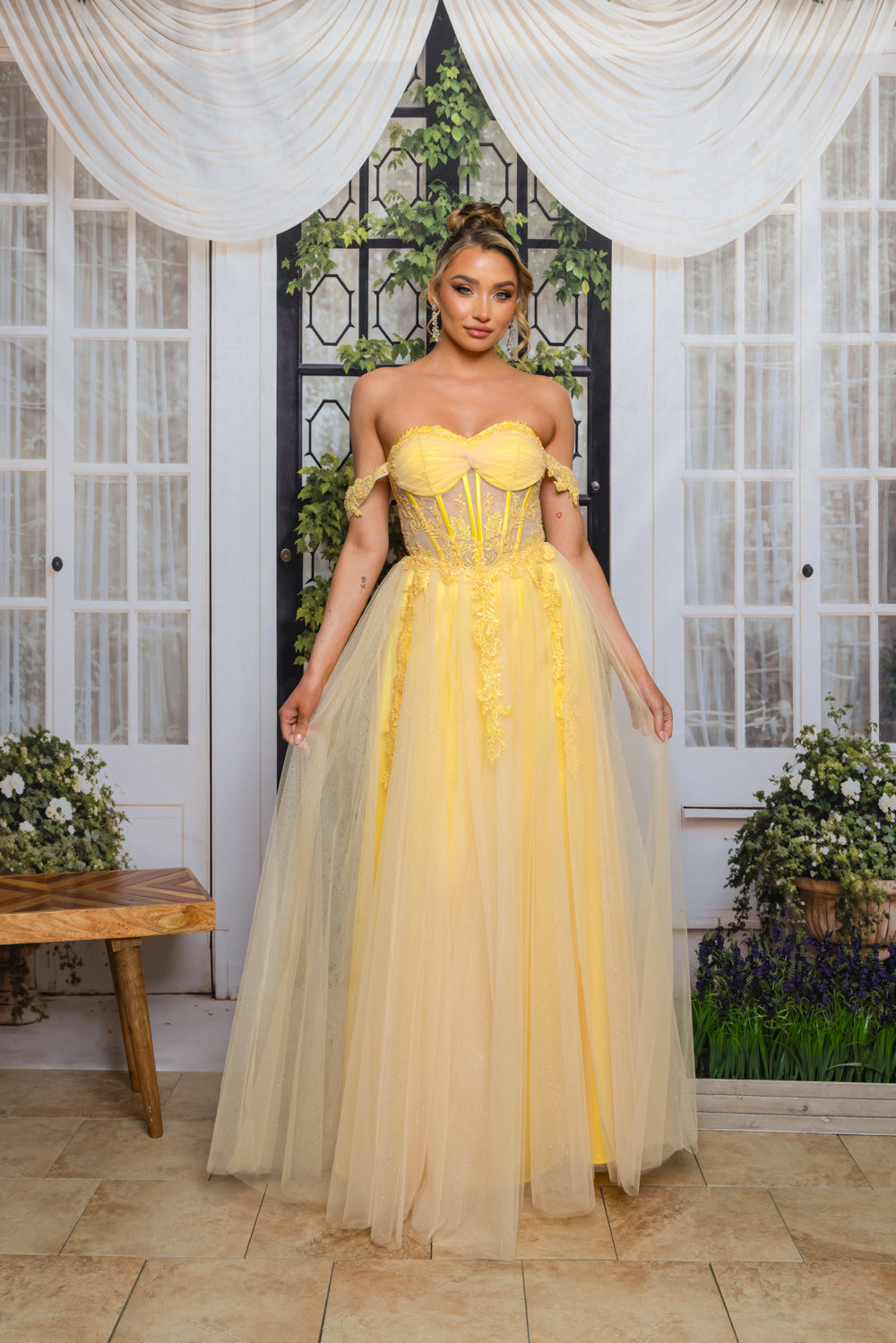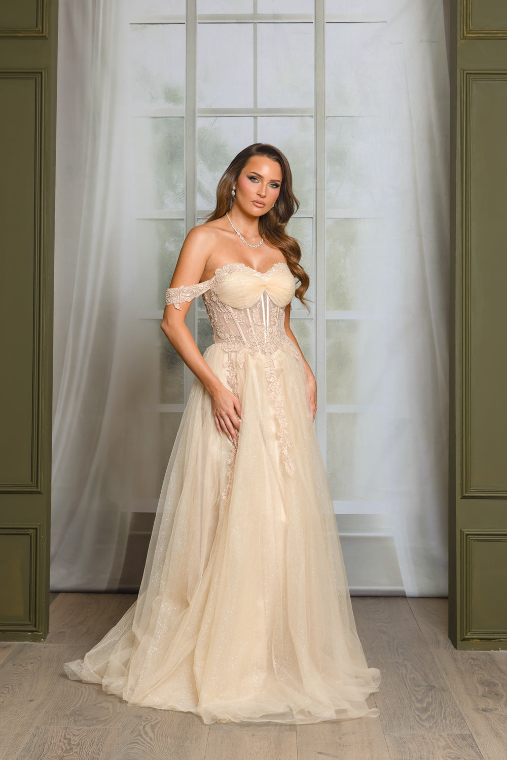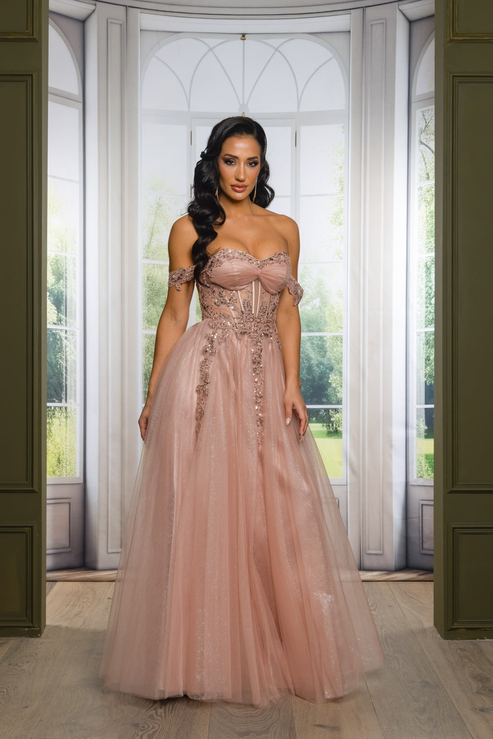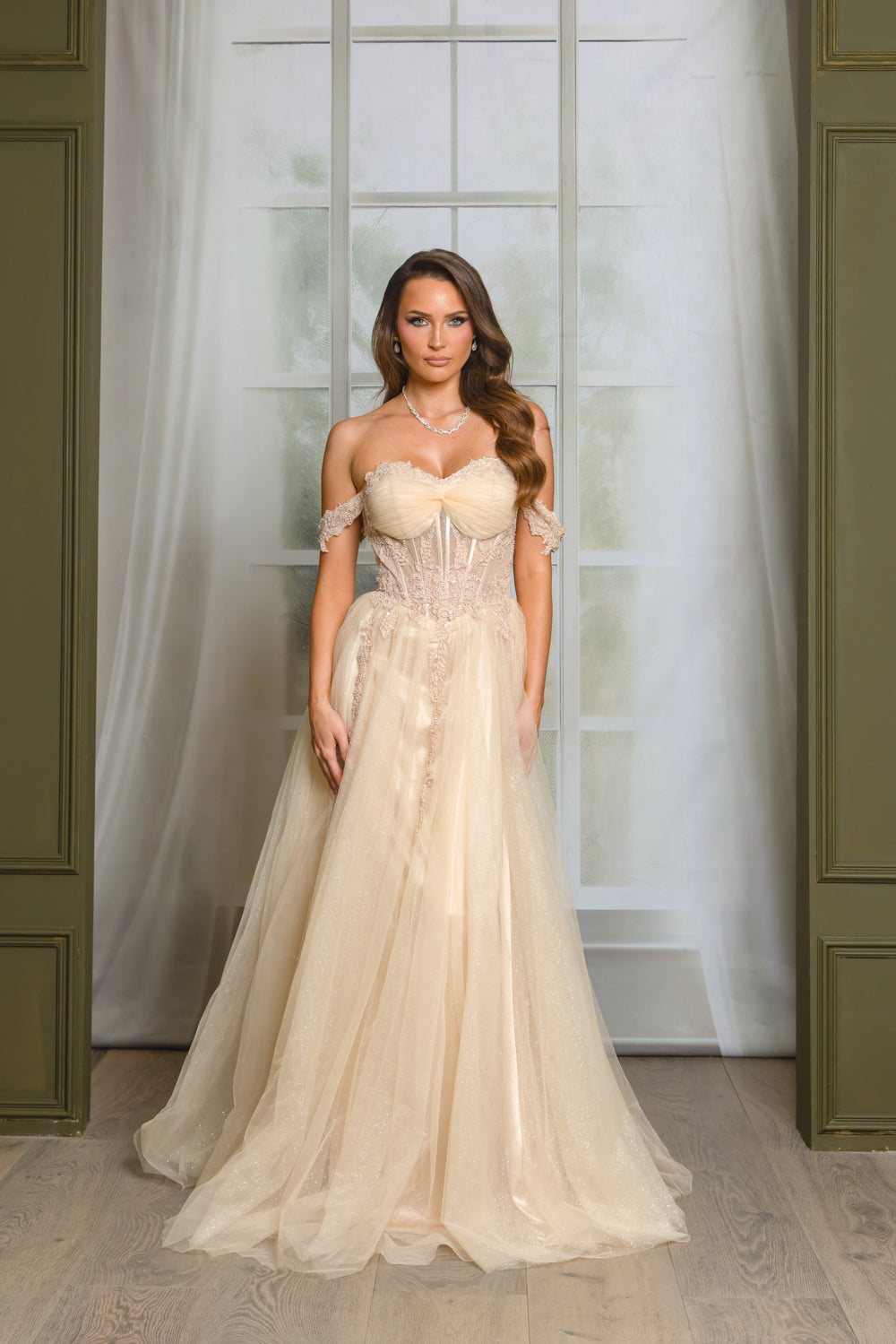 Off shoulder prom maxi dress with floral embroidery, beading and sequin details. Dress is fully lined, has bra cups, boning on waist with a lace up back and zipper.