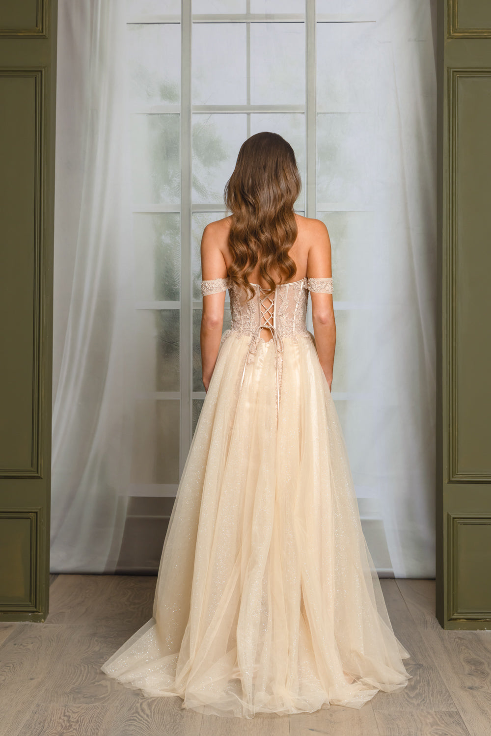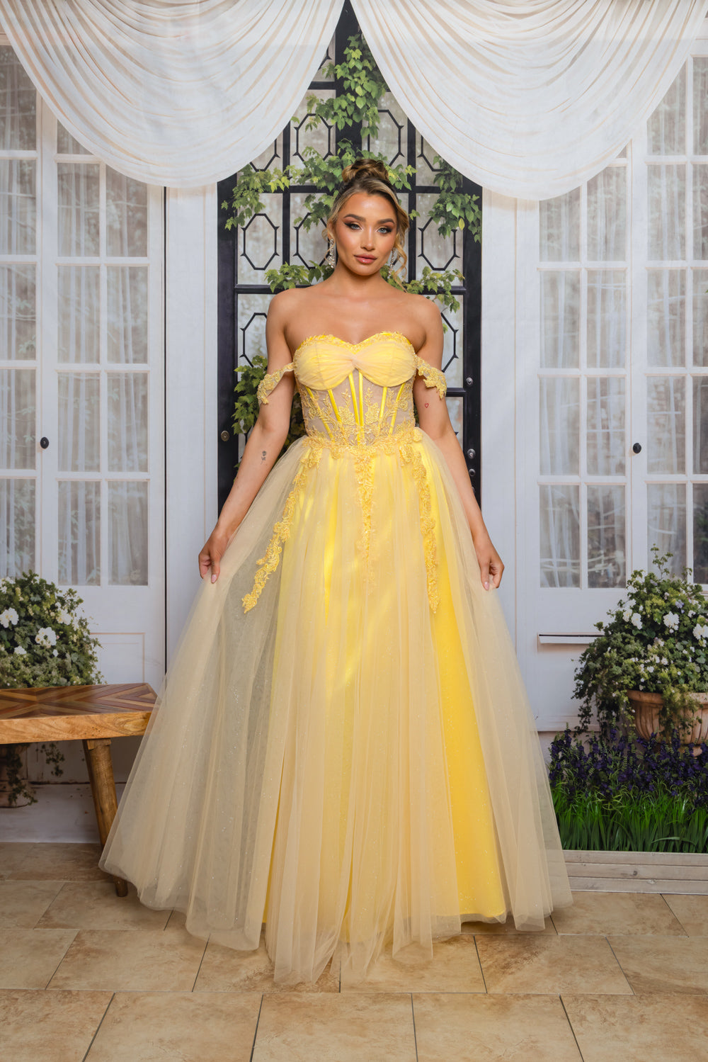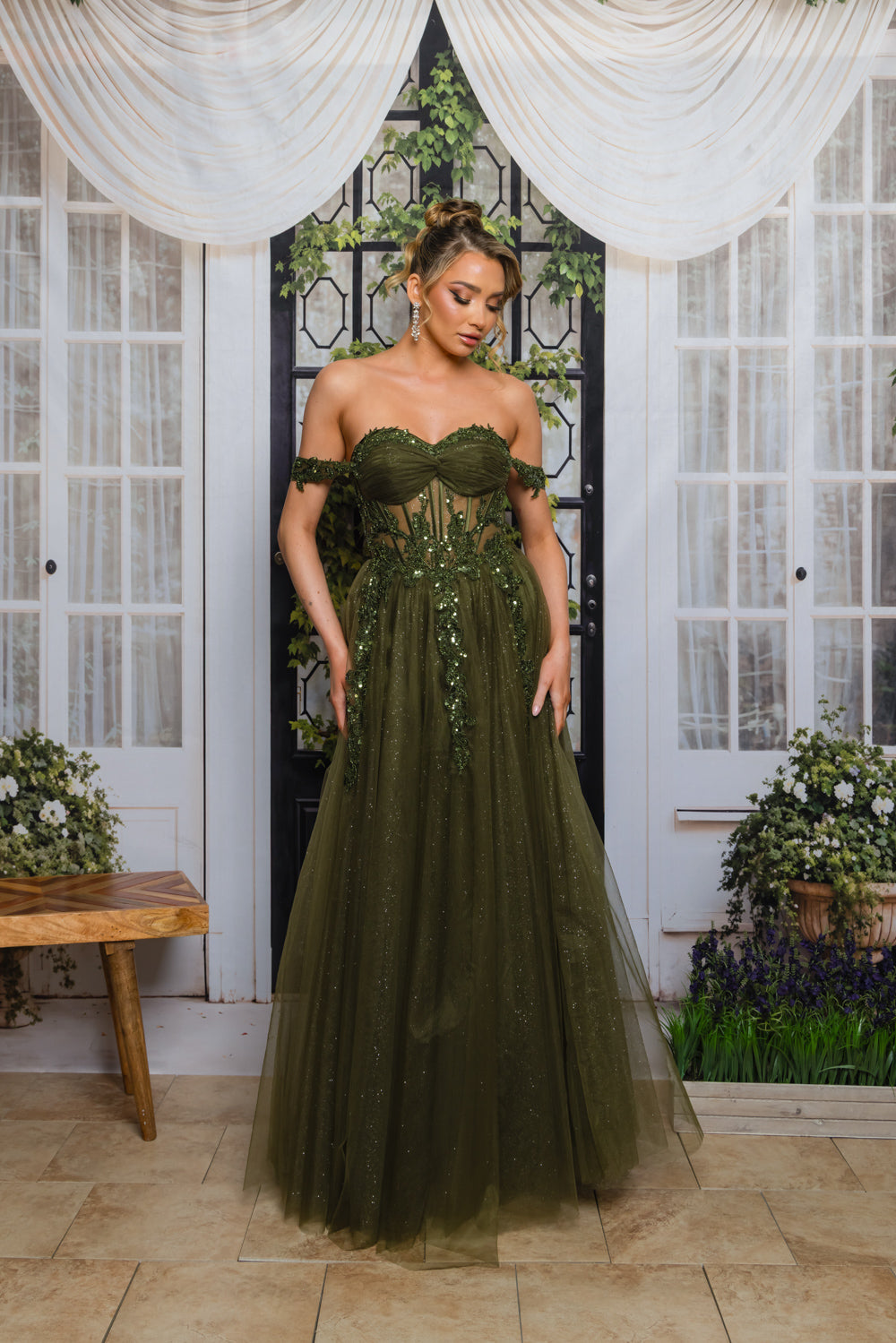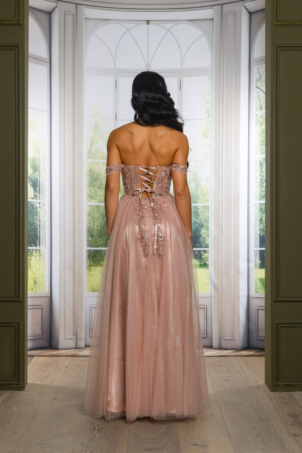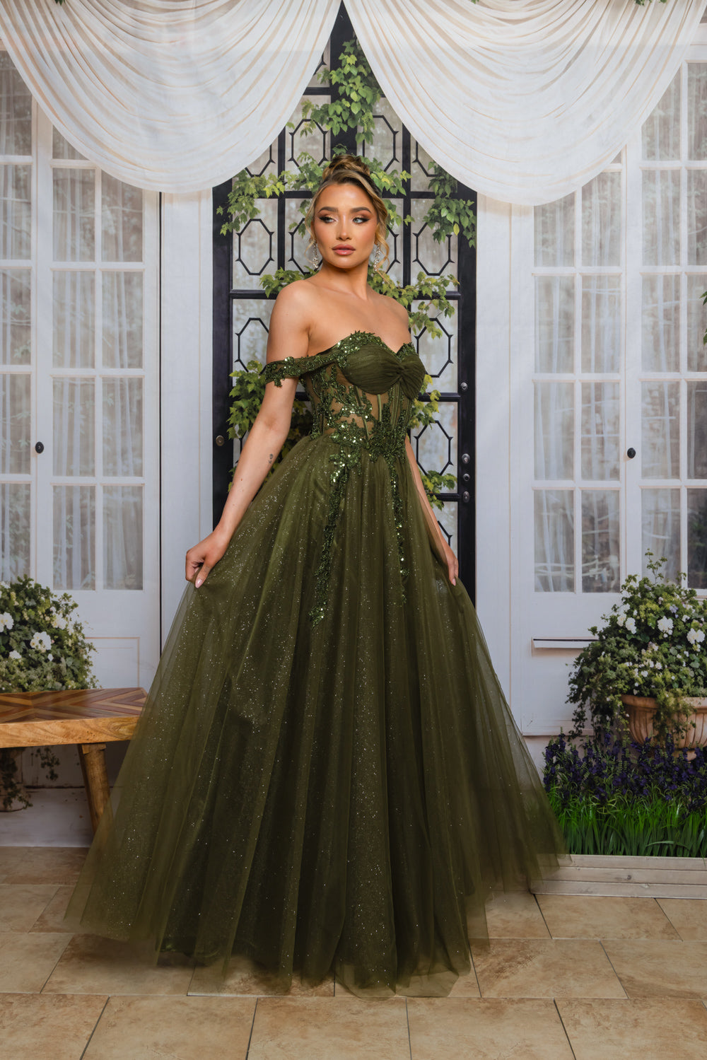 Off shoulder prom maxi dress with floral embroidery, beading and sequin details. Dress is fully lined, has bra cups, boning on waist with a lace up back and zipper.