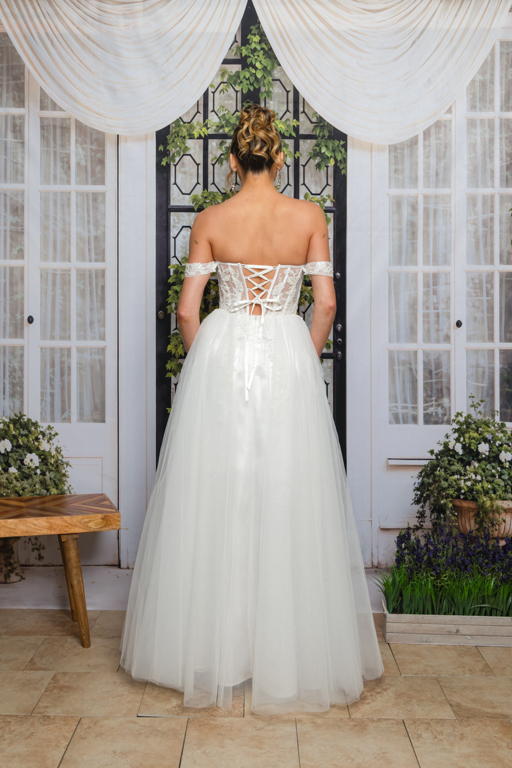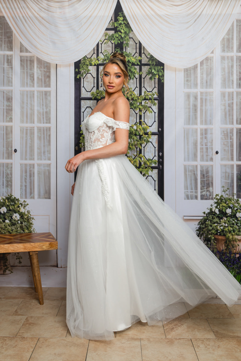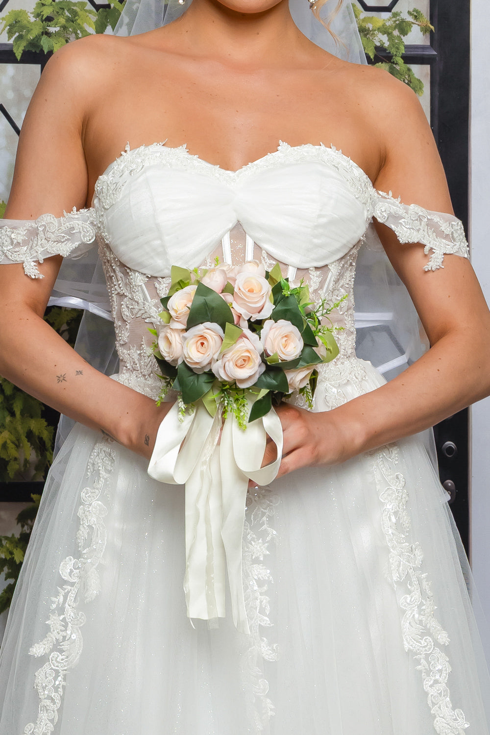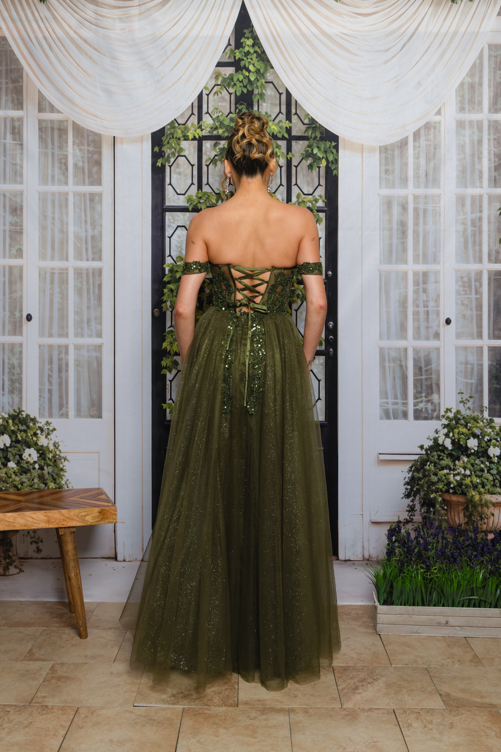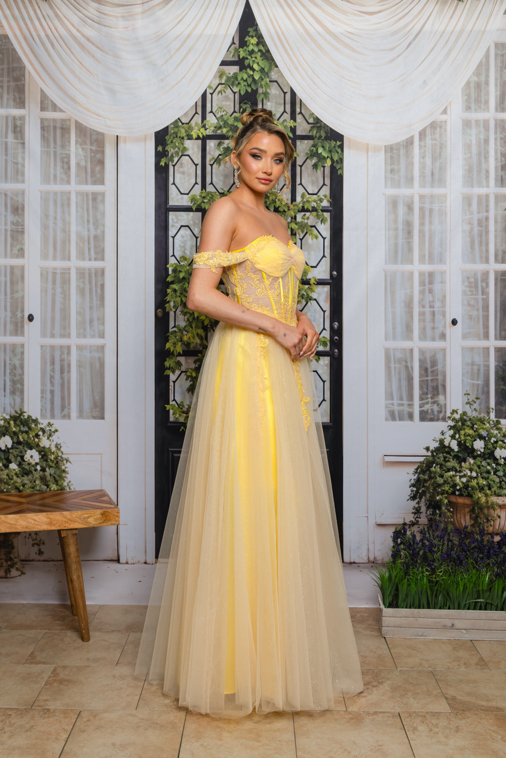 Off shoulder prom maxi dress with floral embroidery, beading and sequin details. Dress is fully lined, has bra cups, boning on waist with a lace up back and zipper.