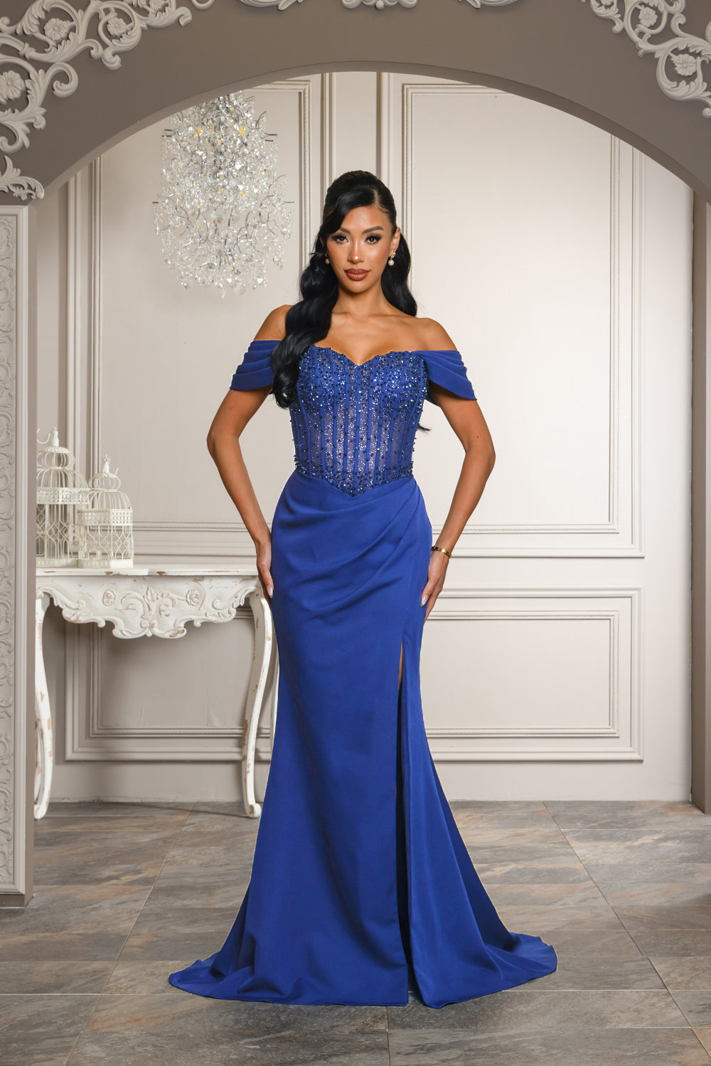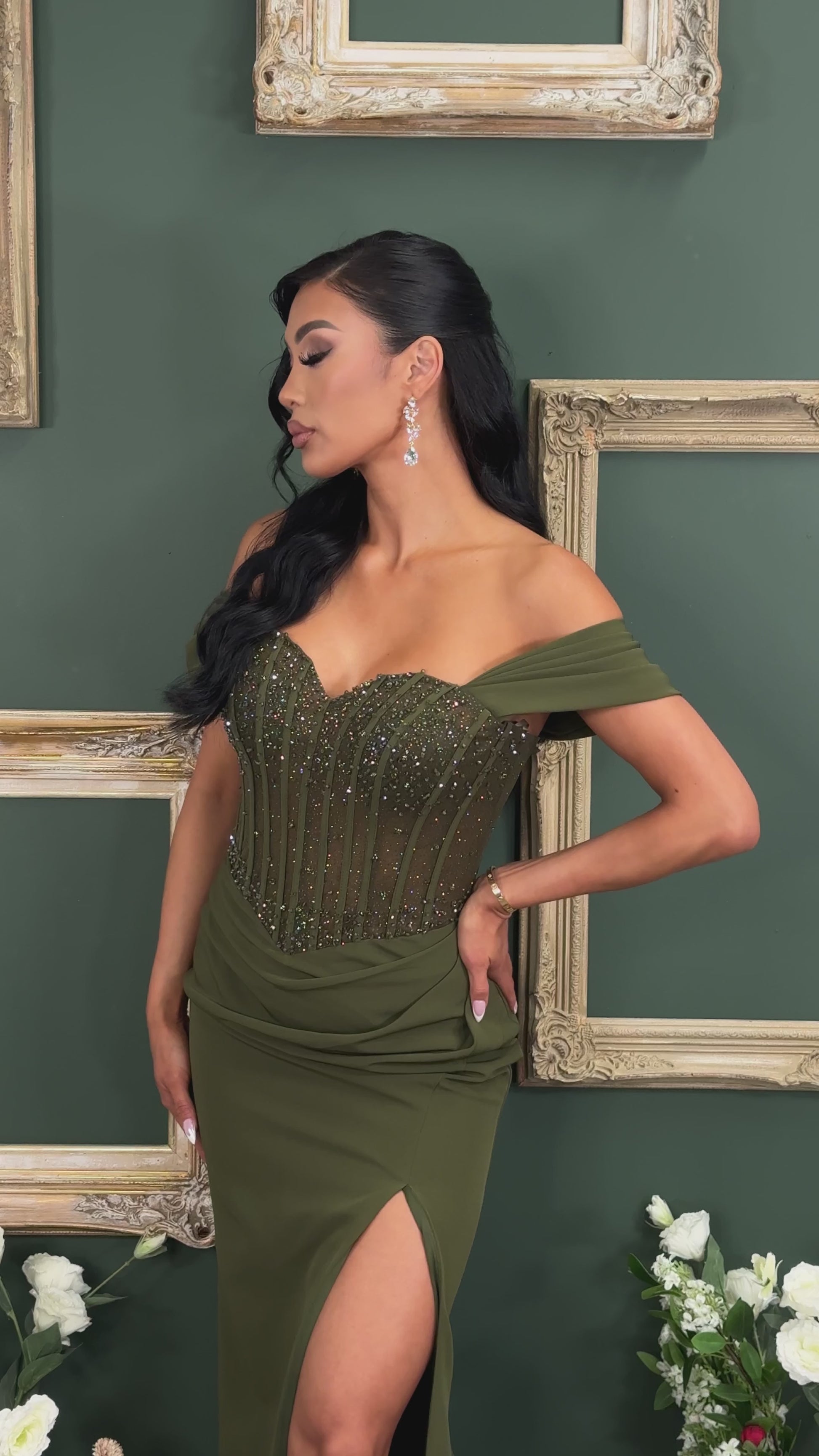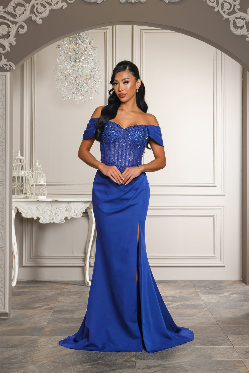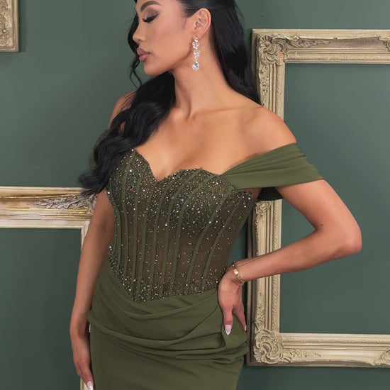 Off shoulder corset top maxi dress with full lining on skirt, bra cups, and back zipper, Tope of dress is embellished with beads, rhinestones, and is has double lined glitter mesh so the top is a bit see through