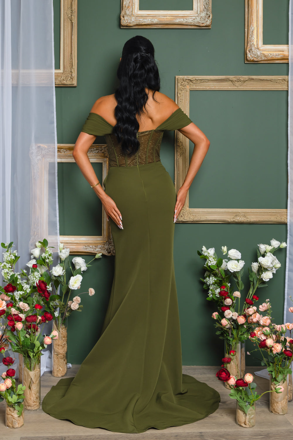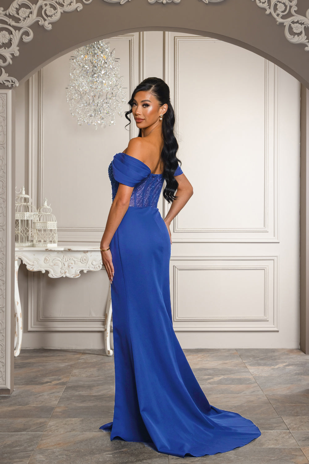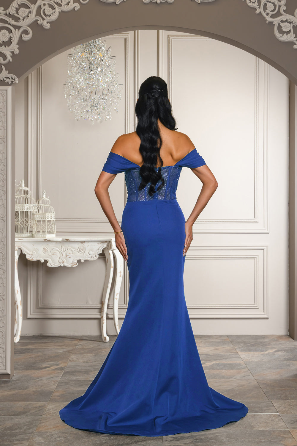 Off shoulder corset top maxi dress with full lining on skirt, bra cups, and back zipper, Tope of dress is embellished with beads, rhinestones, and is has double lined glitter mesh so the top is a bit see through