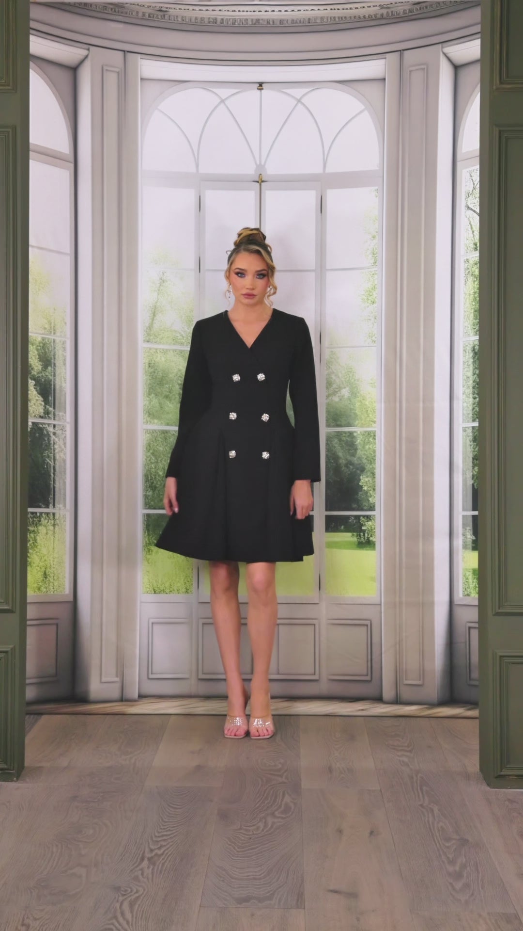Long sleeve v-neck mid length dress with a silhouette of a blazer and a A-line skirt. Fully lined, back zipper, and gold crystal buttons. Dress does not stretch.