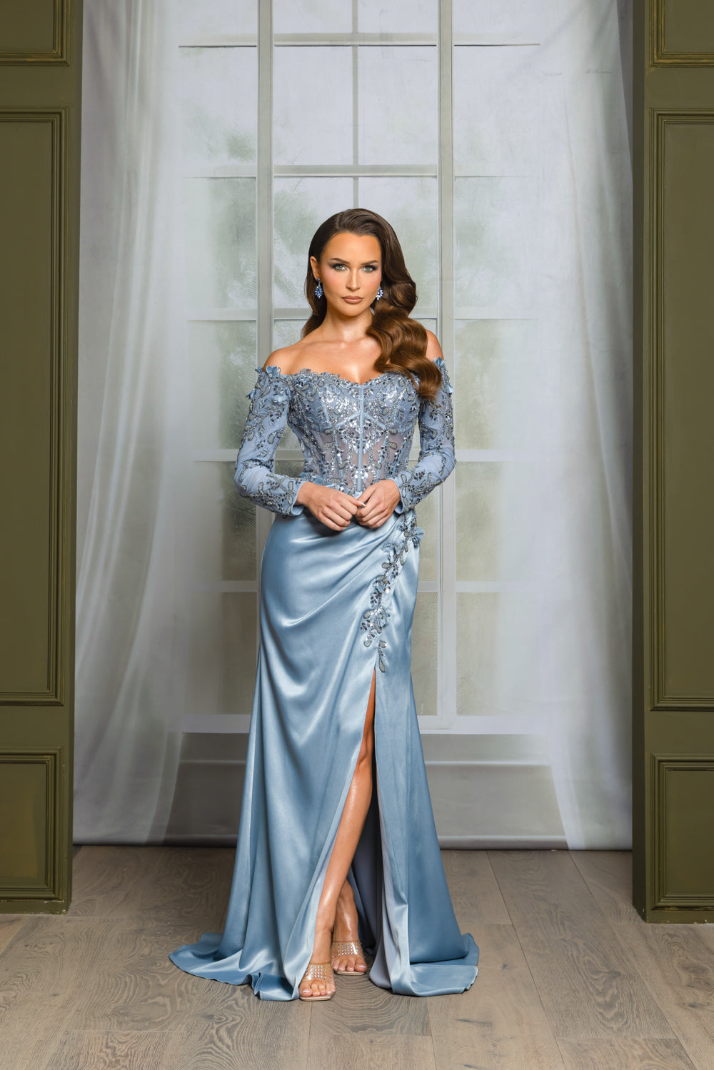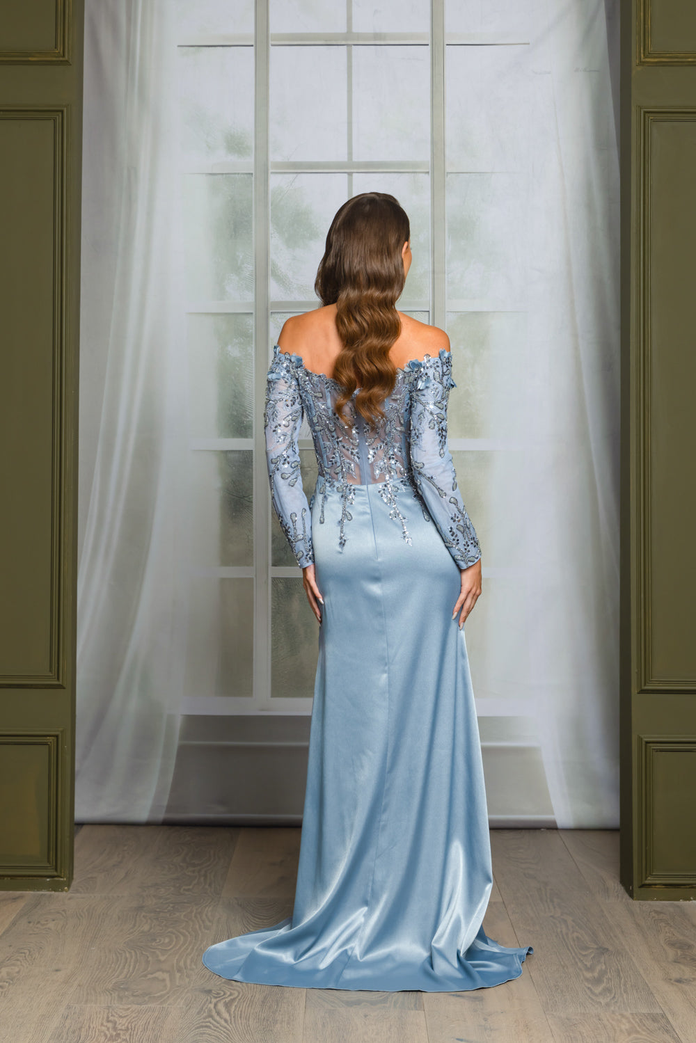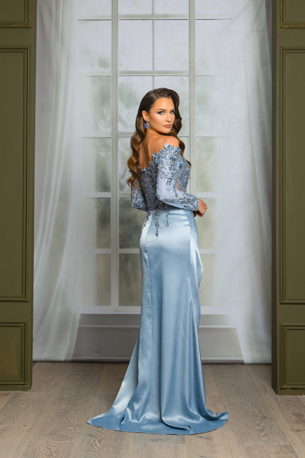 Off shoulder long sleeve embroidered beaded sequin maxi dress with satin lined mermaid skirt, bra cups, and back zipper.