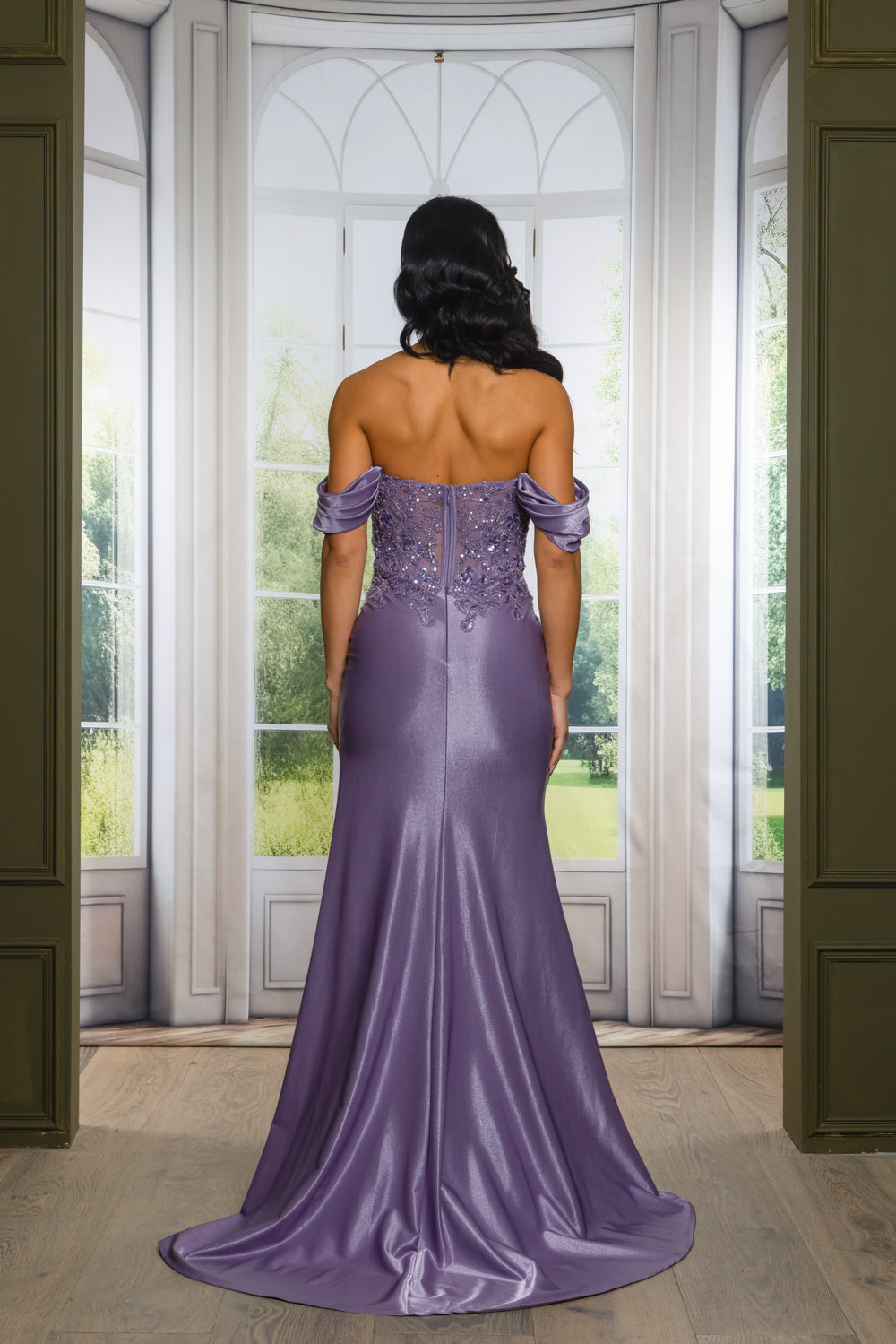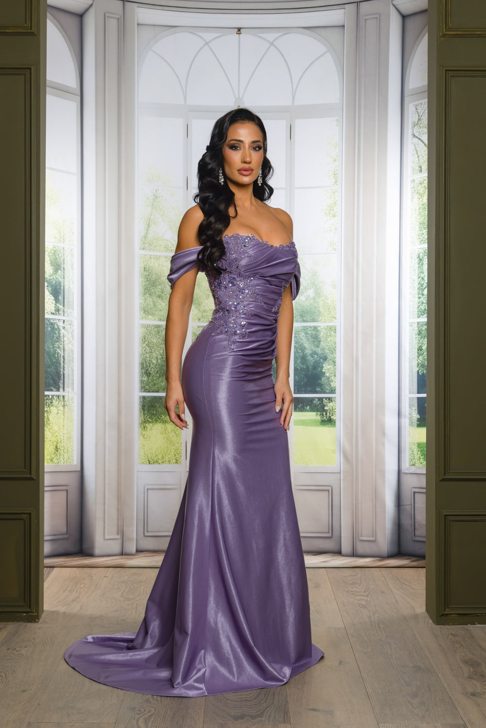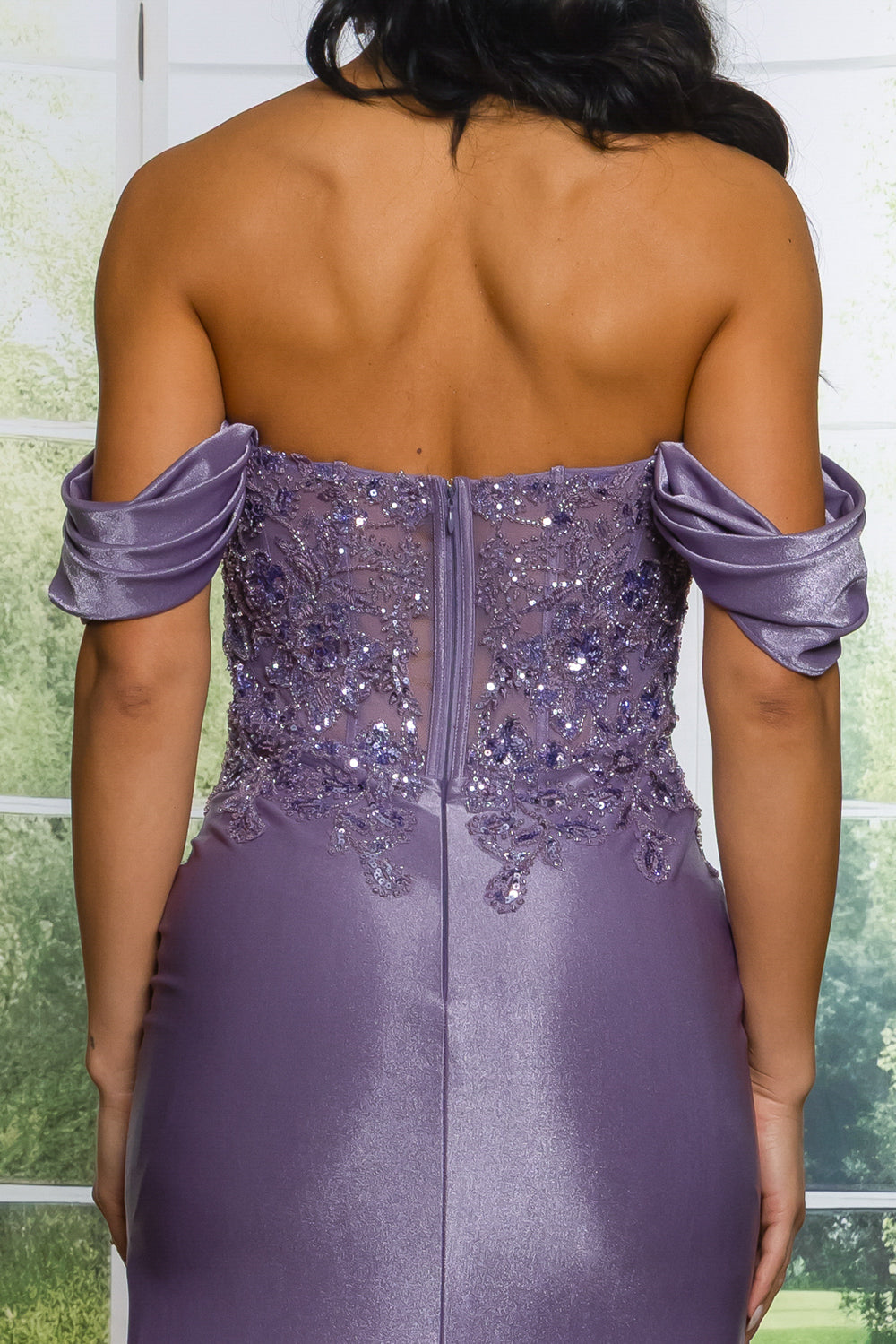 Beaded and embroidered shinny spandex maxi off shoulder dress with full lining, left leg slit, bra cups, and back zipper with boning.