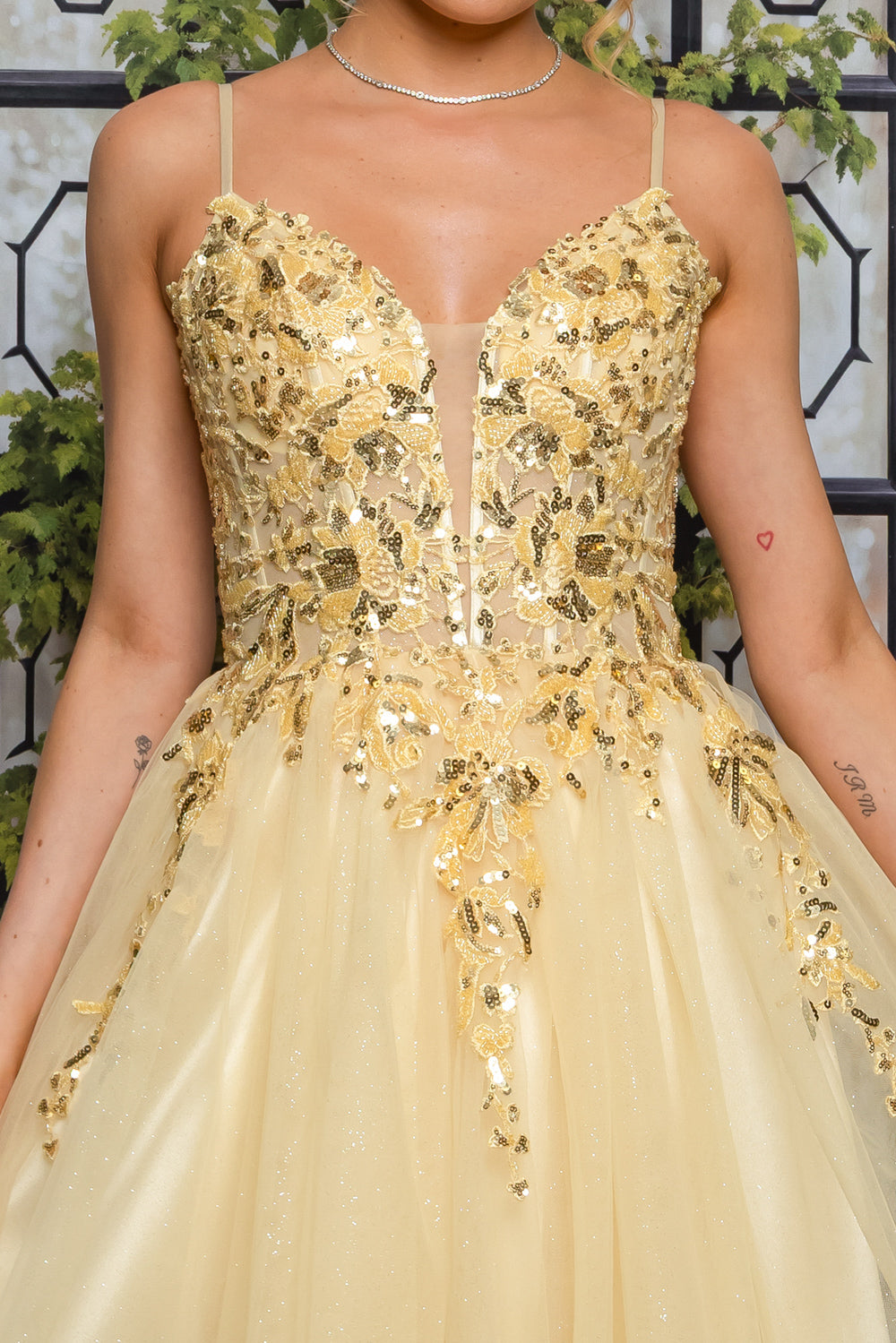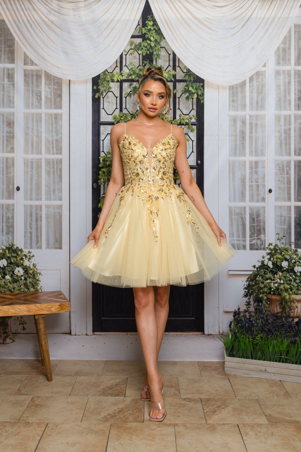 Spaghetti straps mini dress with layers of ethereal tulle, A-line silhouette, featuring delicate gold embroidery that shimmers and catches the light, adding a touch of opulence.
