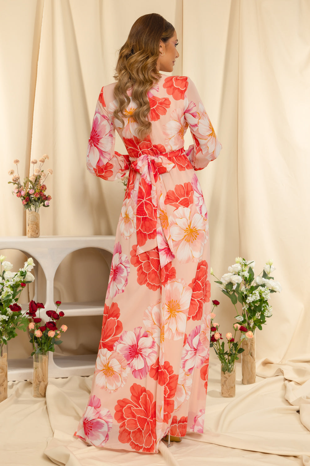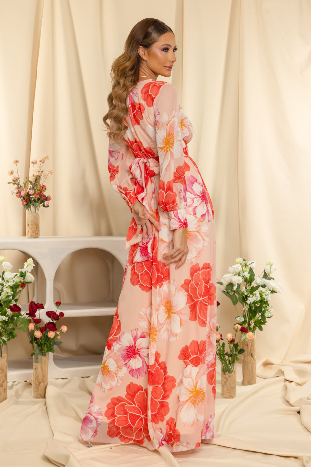 Floral print chiffon maxi dress featuring bishop sleeves. Surplice neck and multi-way waist tie. Very good elastic at waist. Fully lined on top & skirt. Bump friendly / Maternity. Total length 62" from HPS