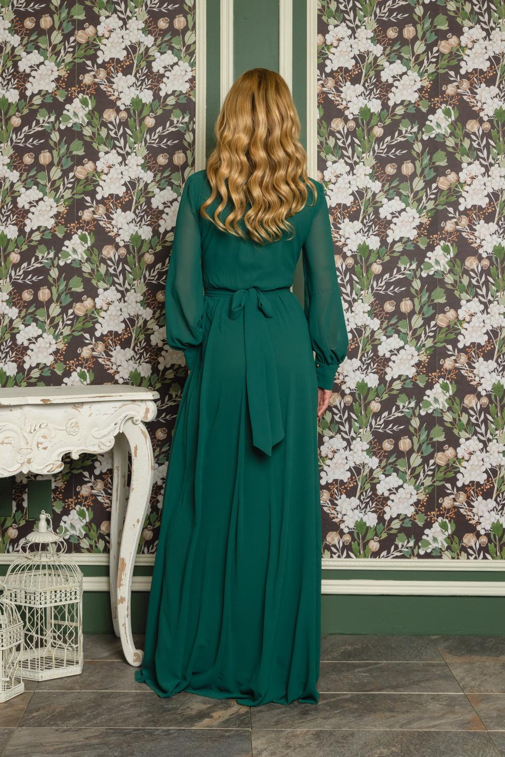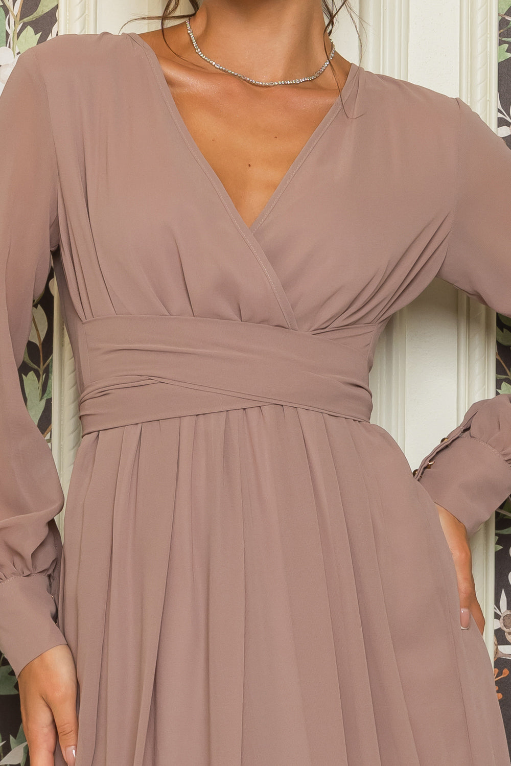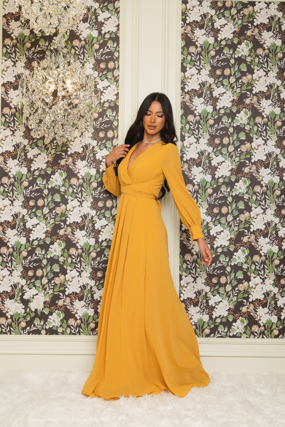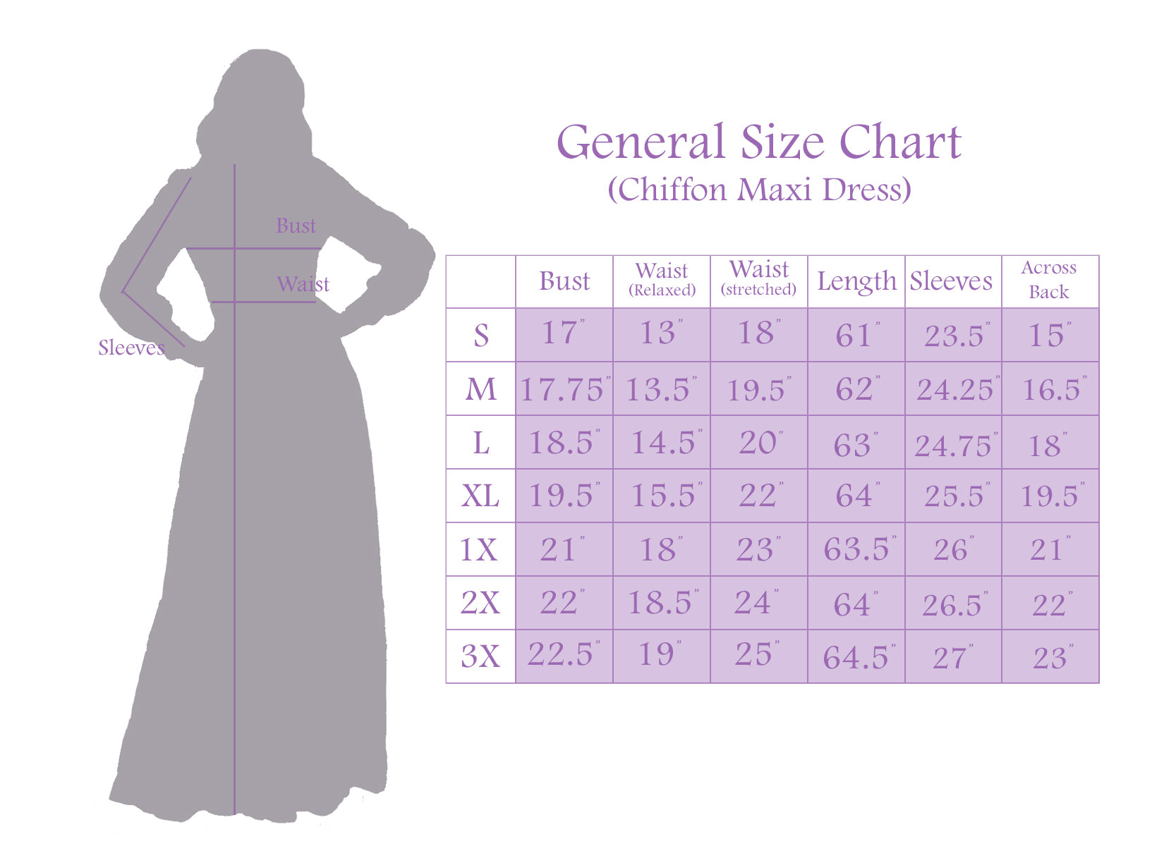 Solid chiffon maxi dress featuring bishop sleeves. Surplice neck and multi-way waist tie. Very good elastic at waist. Fully lined on top & skirt. Bump friendly / Maternity. Total length 62" from HPS