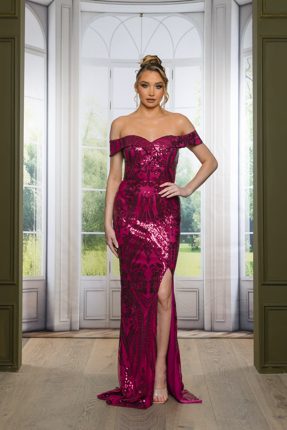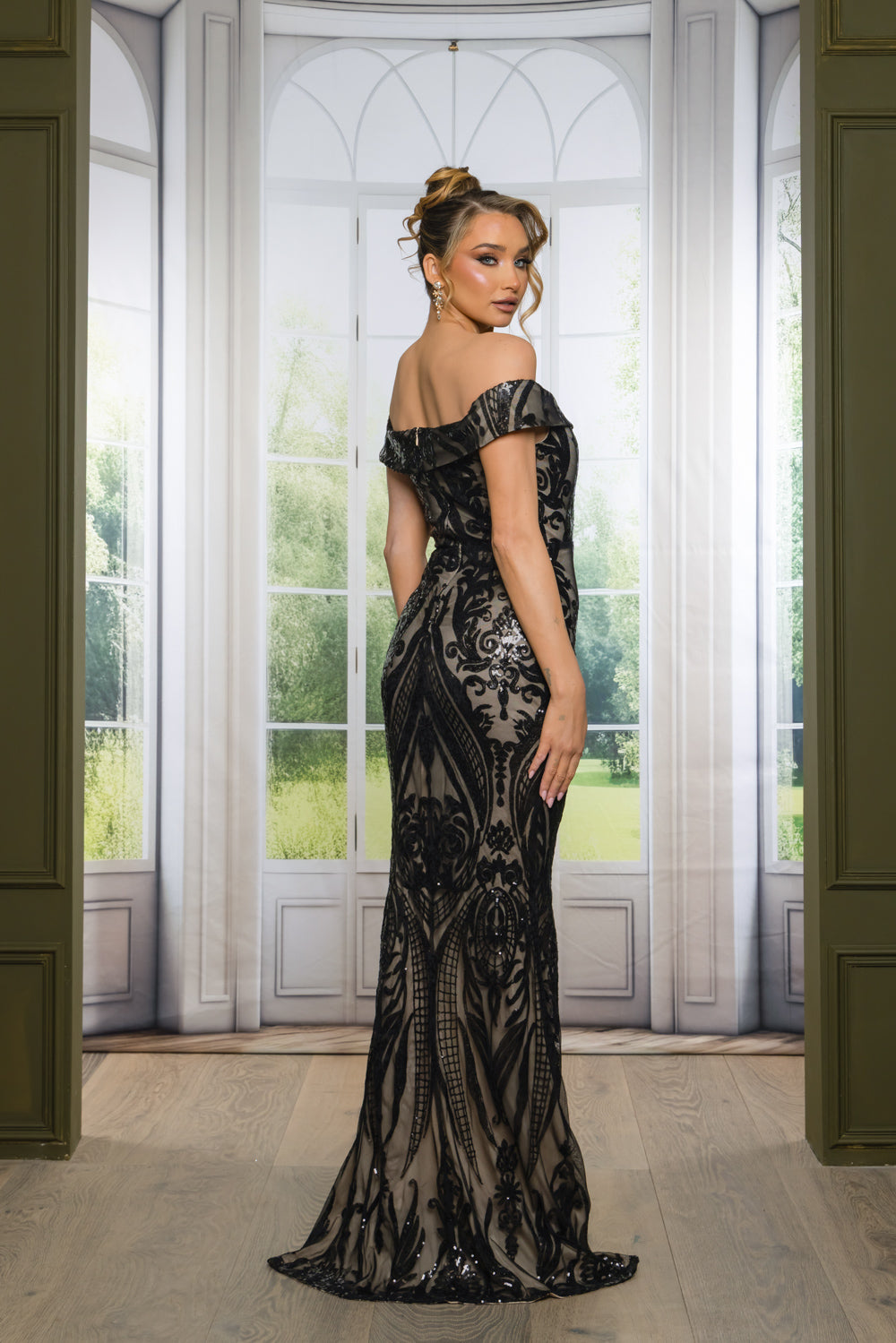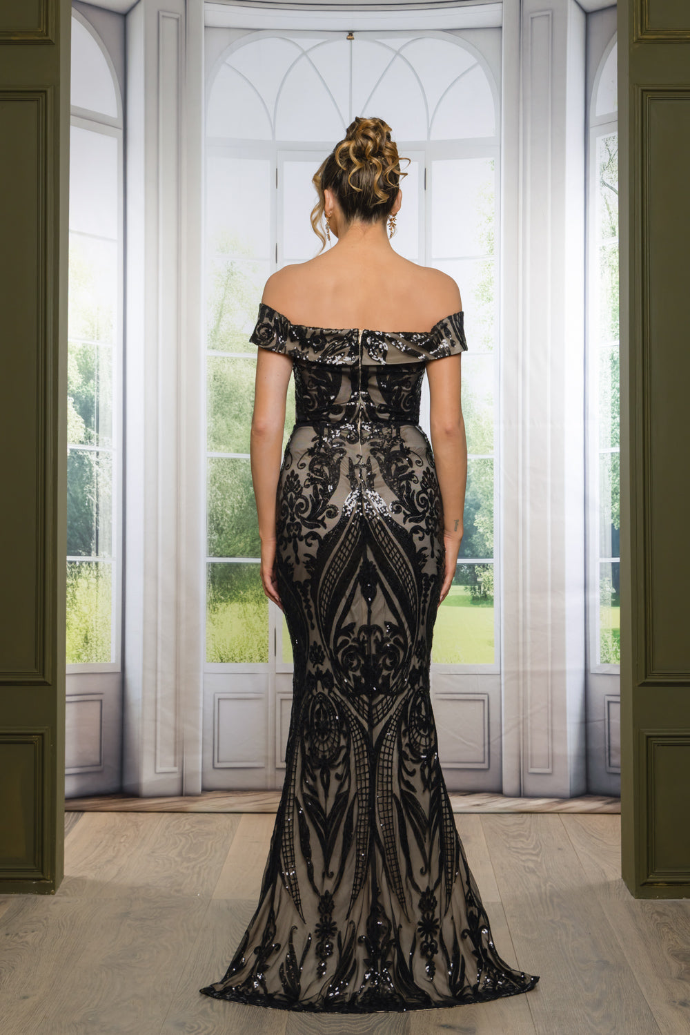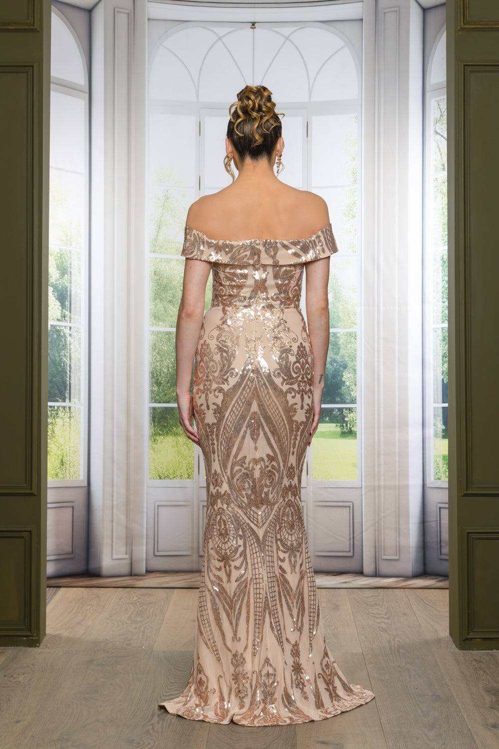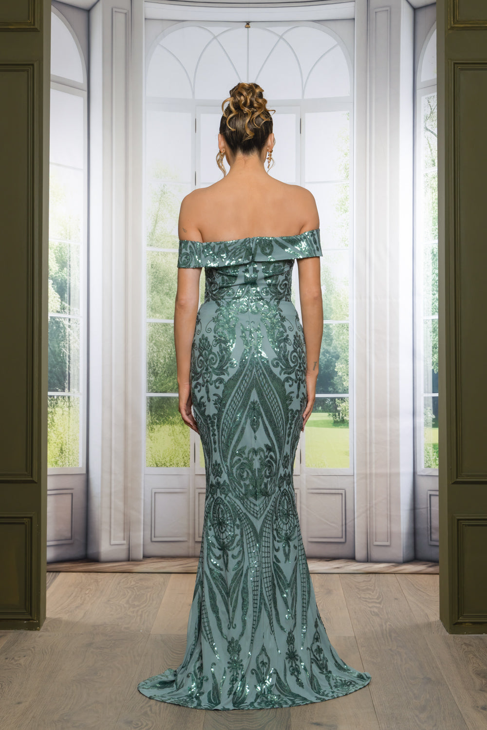 This stunning sequined off-the-shoulder maxi gown featuring a flattering sweetheart neckline that beautifully accentuates the décolletage, the dress is adorned with intricate sequin detailing that shimmers with every movement.