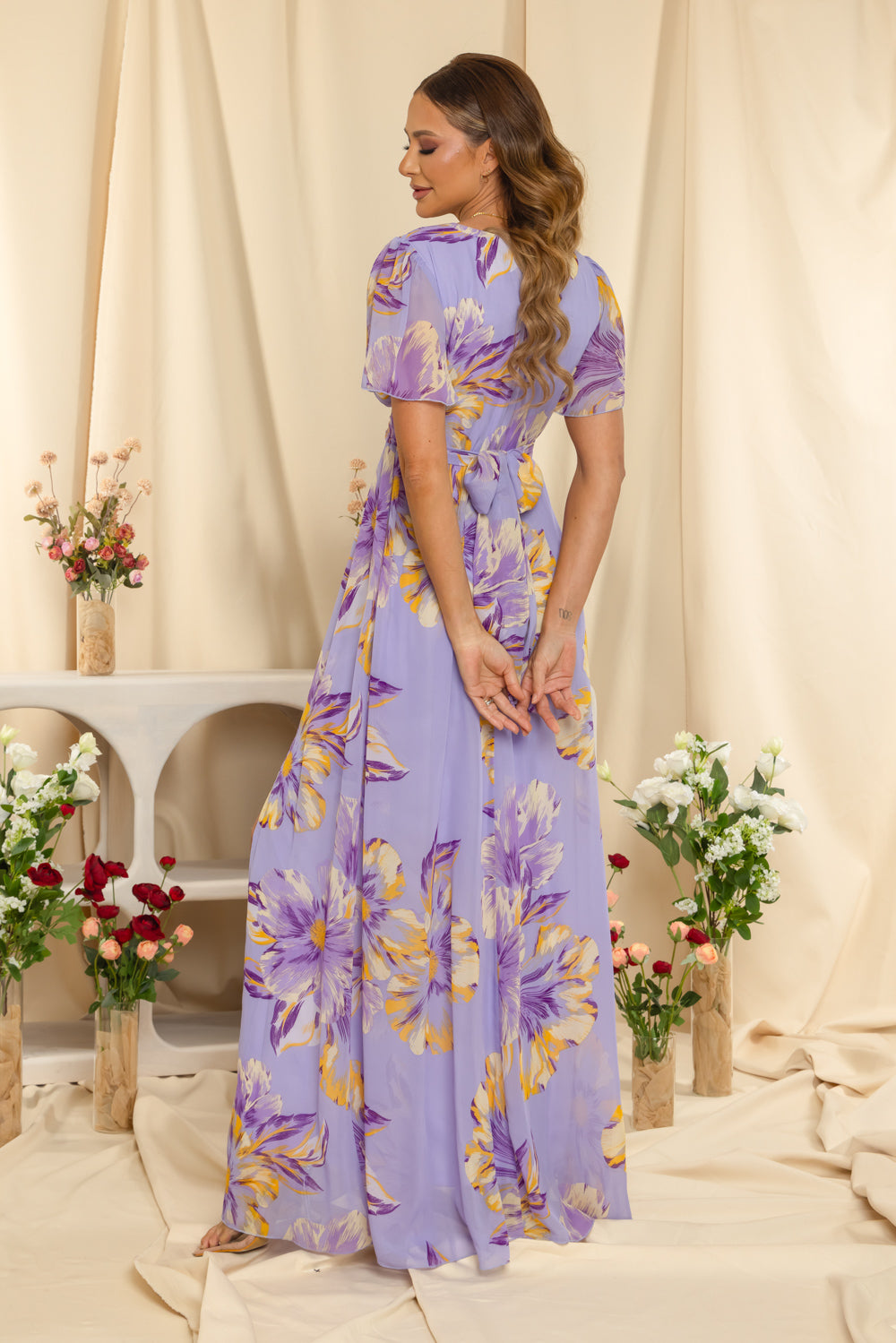 Floral print maxi dress with flutter sleeves. Surplice neck and multi-way waist tie with a slit. Very good elastic at waist. Full lined on top & short skirt lining. Bump friendly / Maternity. Total length 62" from HPS