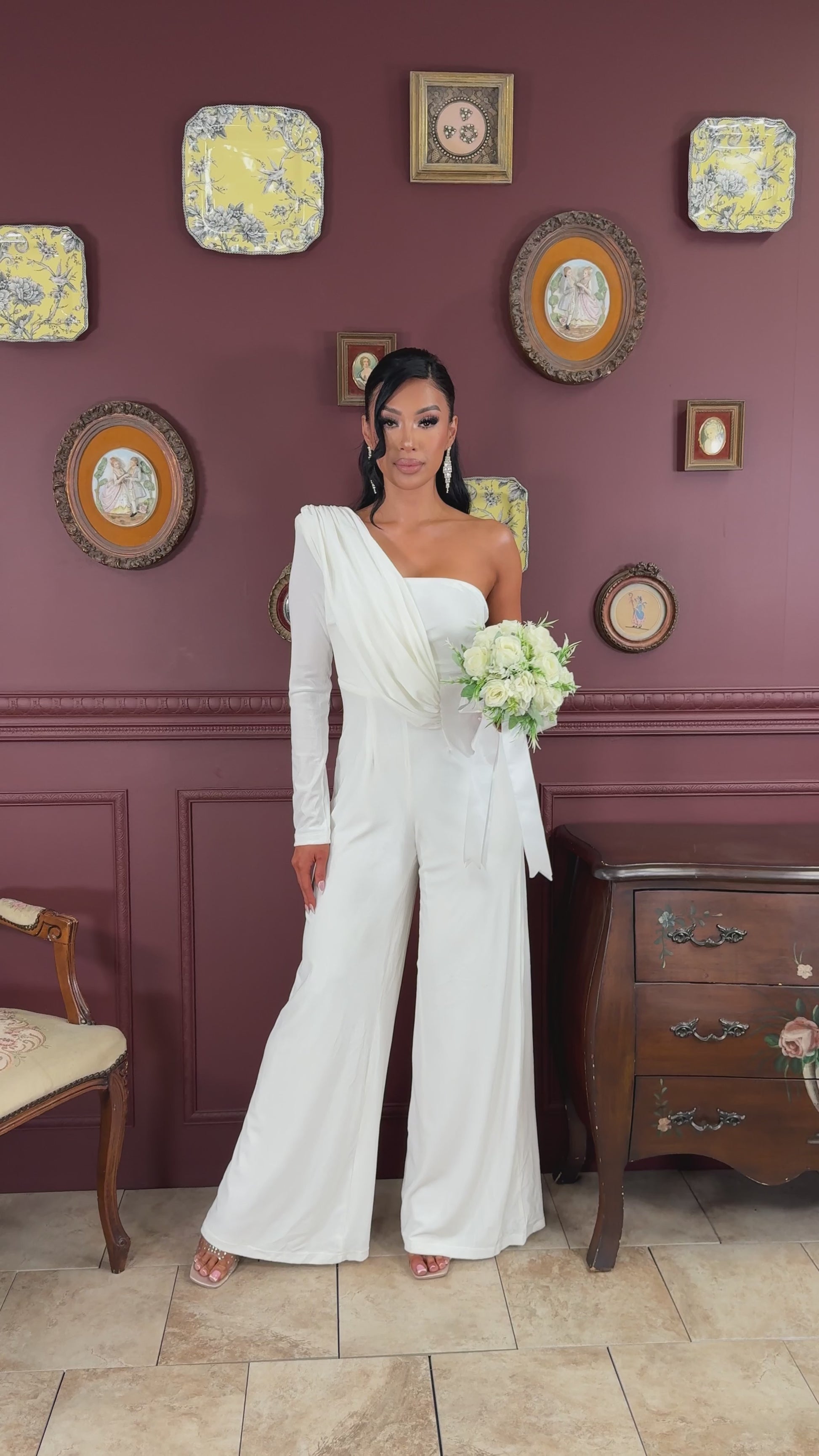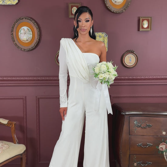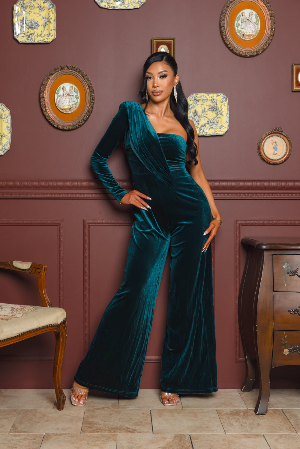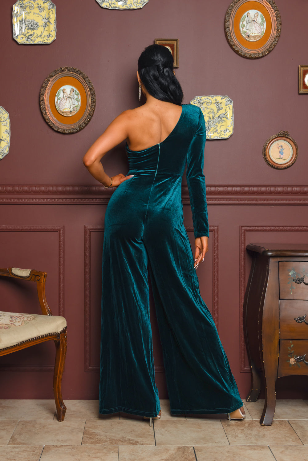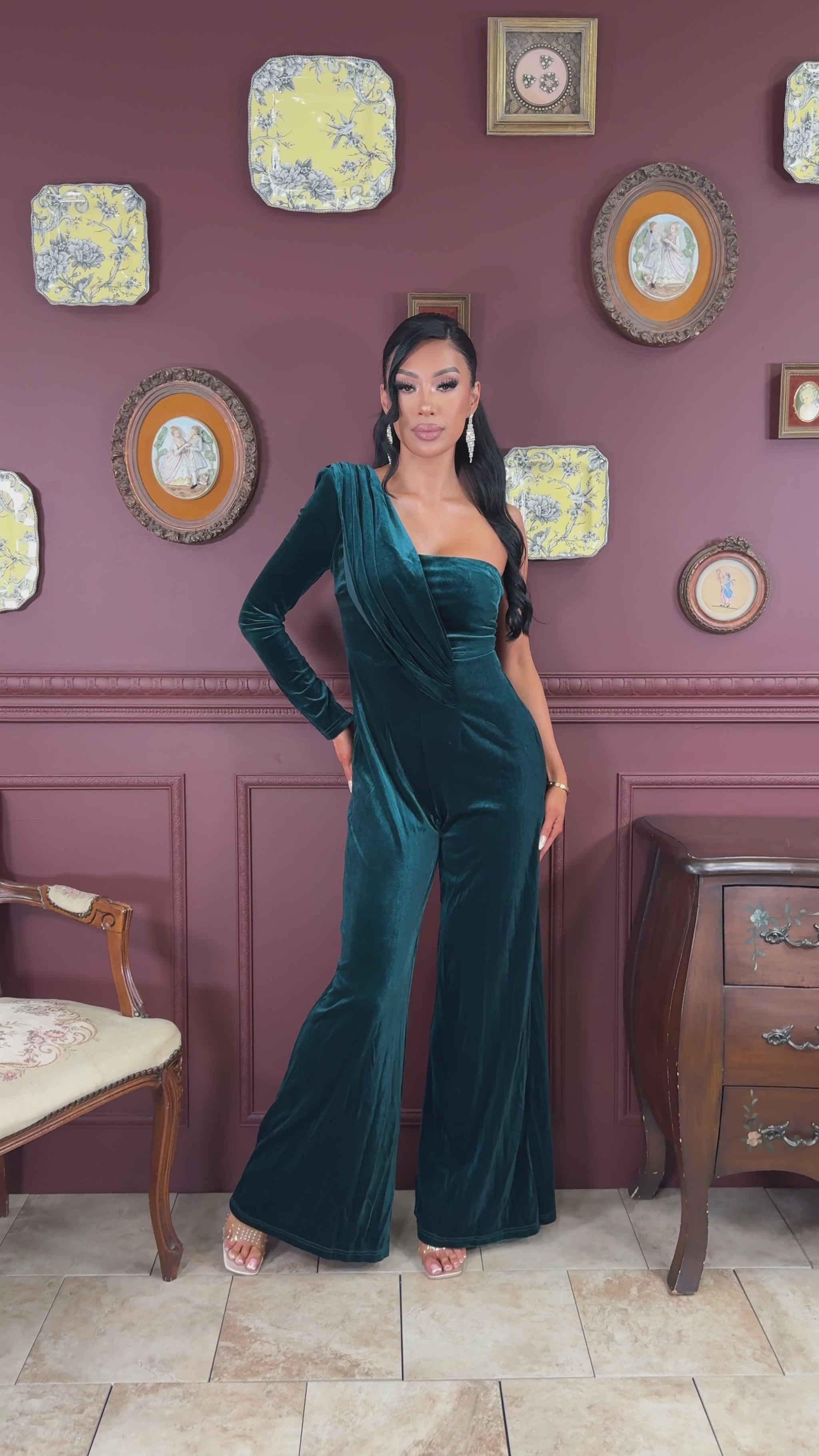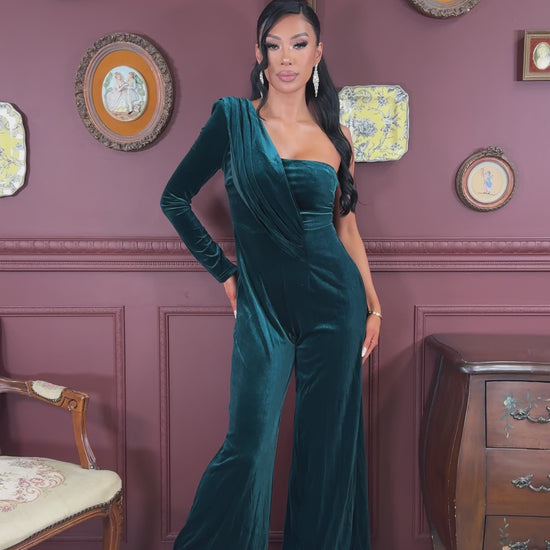 Solid color velvet long sleeve one shoulder jumpsuit with full lining, shoulder pad, back zipper, and wide leg bottom. *This style does have a boutique's MAIN LABEL instead of the RICARICA. *