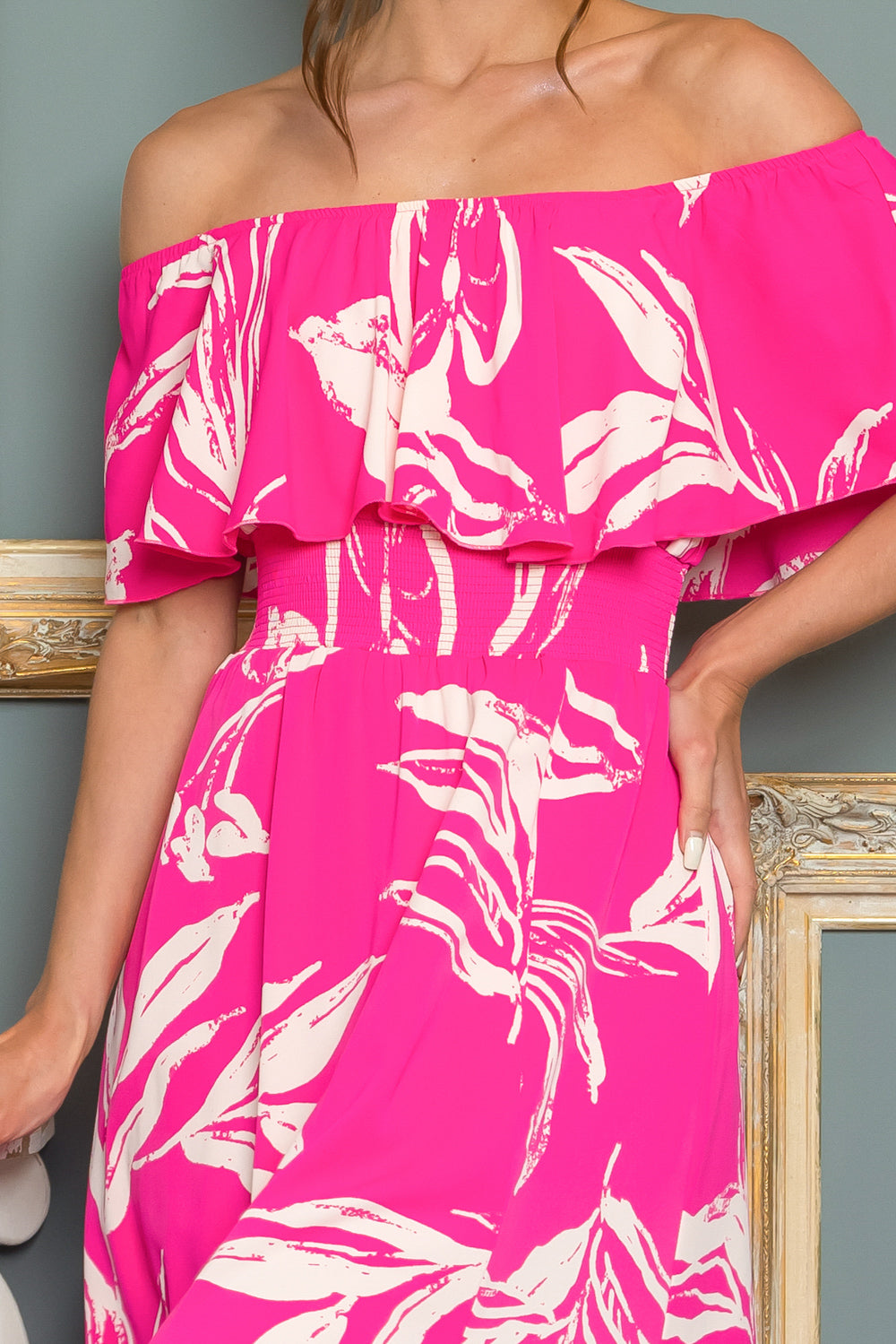 Off-the-shoulder maxi dress in a floral print. Very good elastic on top opening & waist. Fully lined on top & skirt. Bump friendly / Maternity.