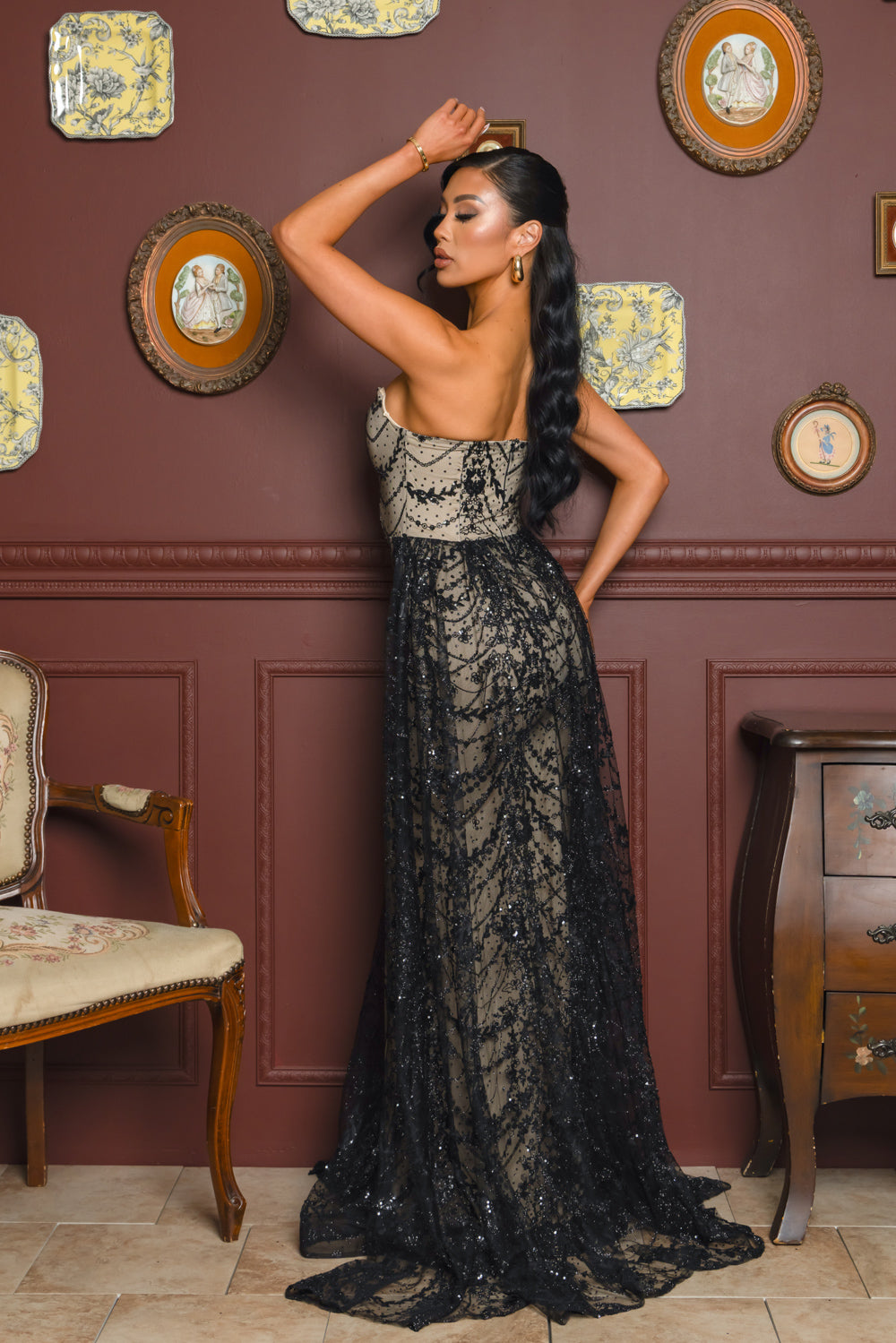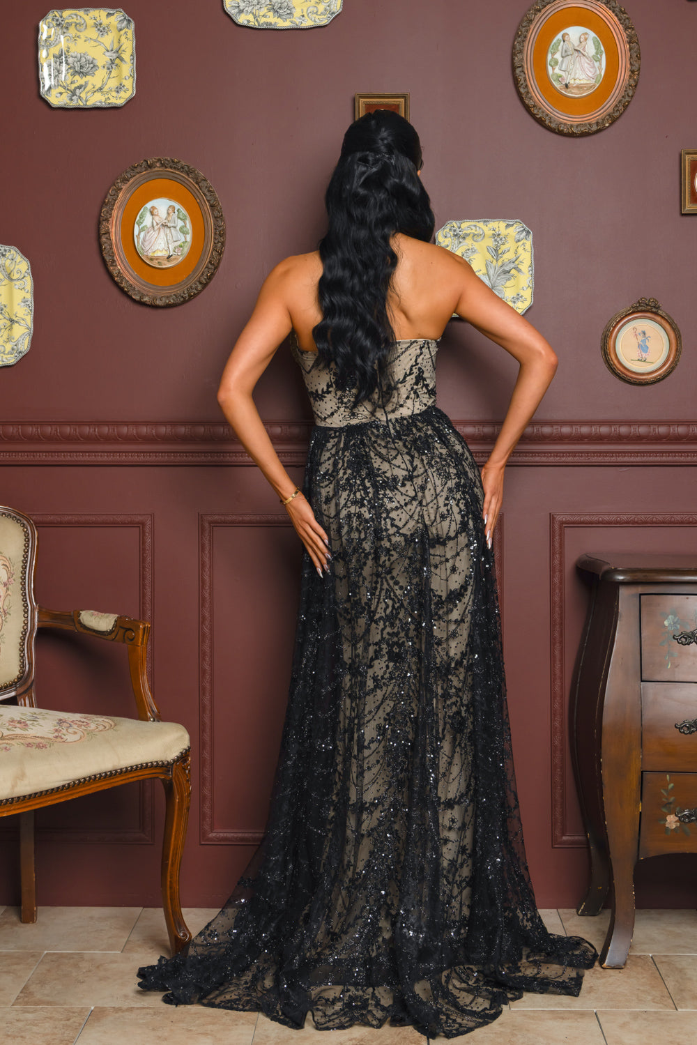 Strapless black and nude glitter maxi dress with bra cups, full lining, front mesh opening, attached waist cape, and back zipper. Dress will have glitter fallout and has no stretch.